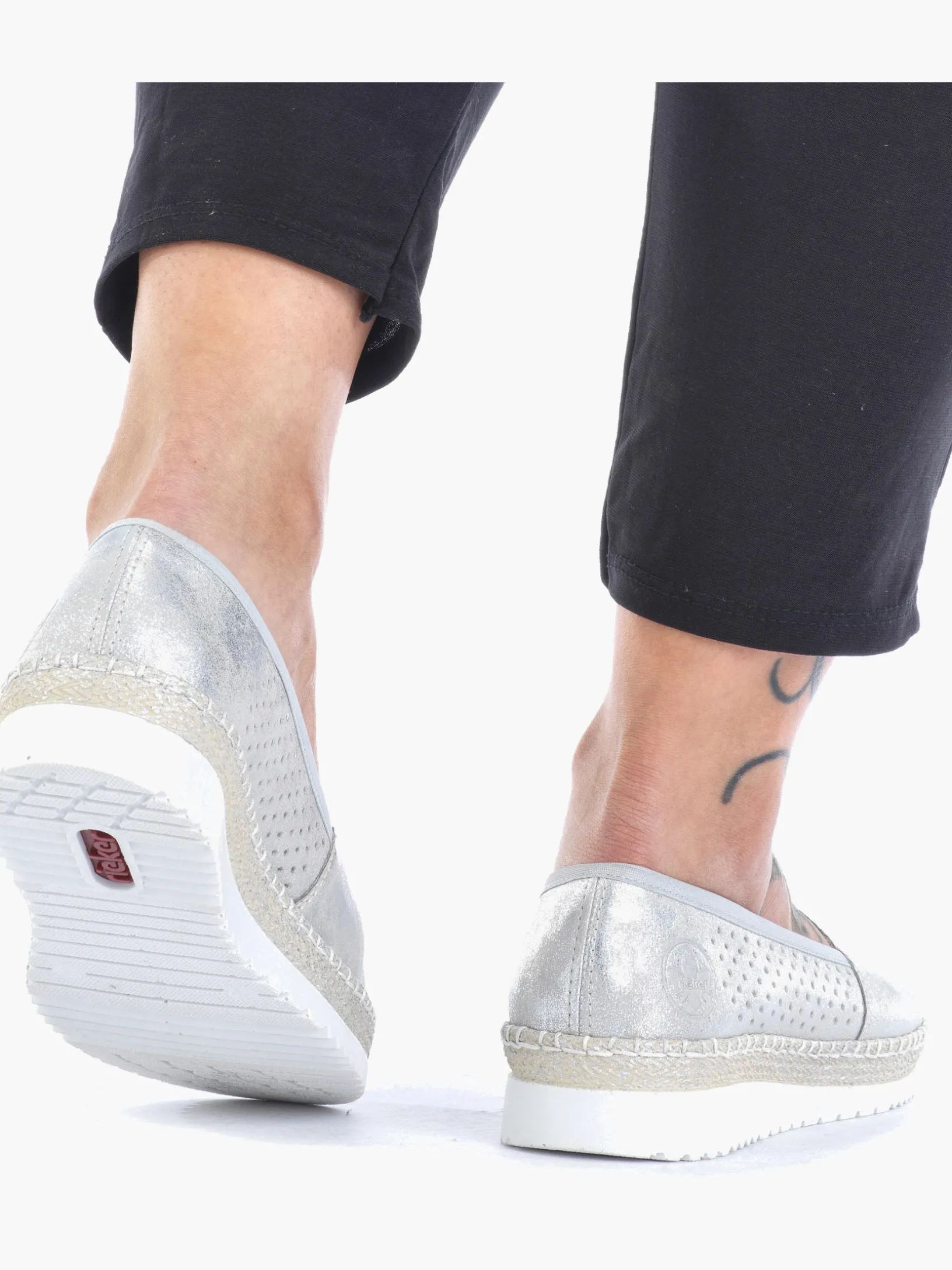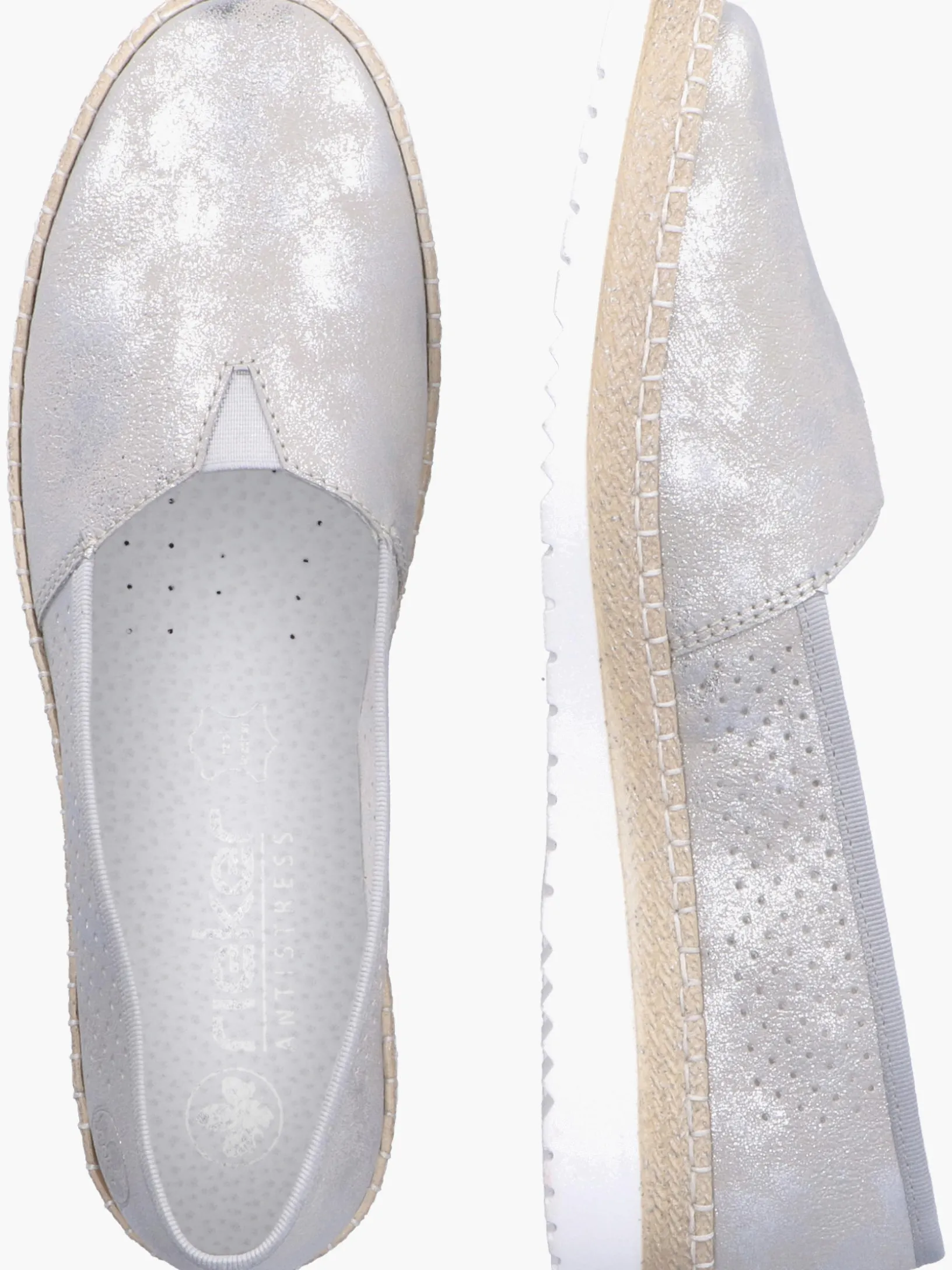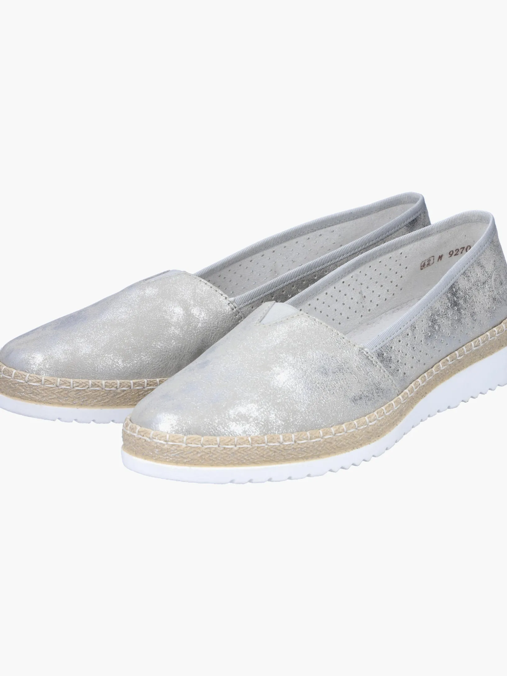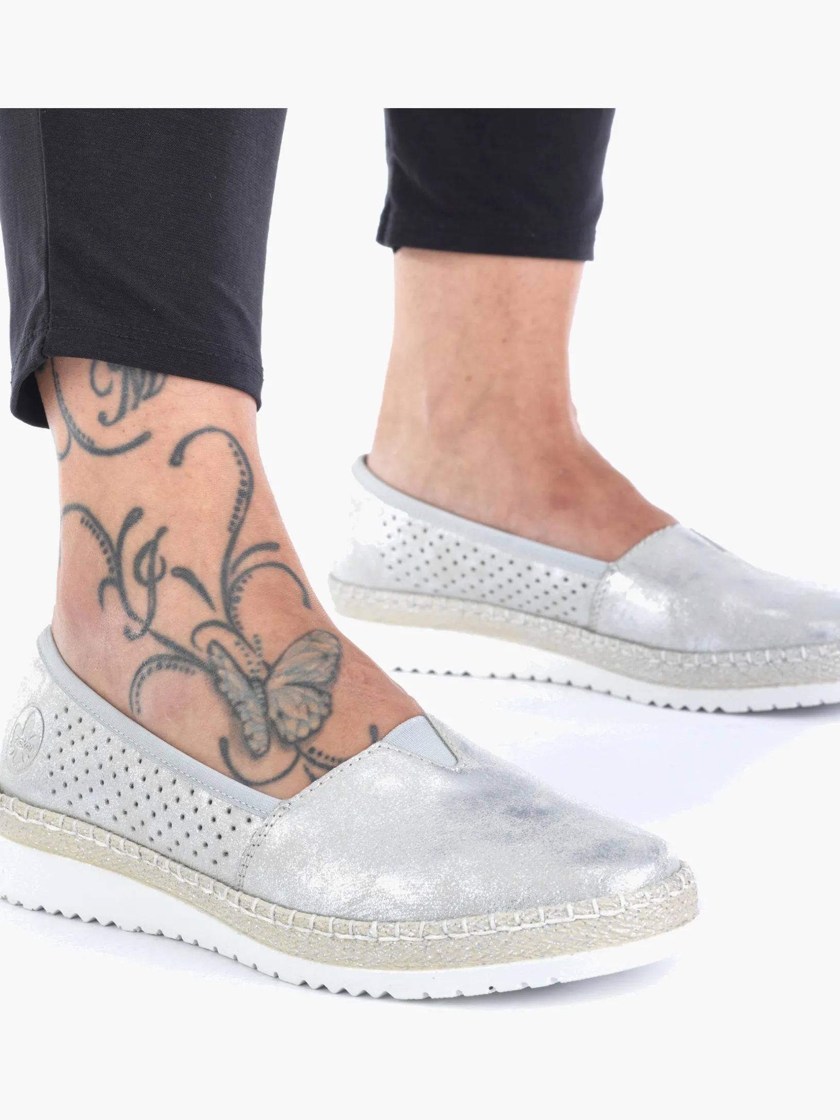 Schöne Tage, schöne Schuhe! Diesen silbernen Rieker Ballerina möchte man gar nicht mehr ausziehen. Der Elastikeinsatz ermöglicht einen bequemen Einstieg. Mit der leichten und schockabsorbierenden Sohle freuen sich die Füße über besten Laufkomfort bei jedem Schritt. Ein weiteres Plus ist die extra weiche Decksohle. Also nichts wie los!