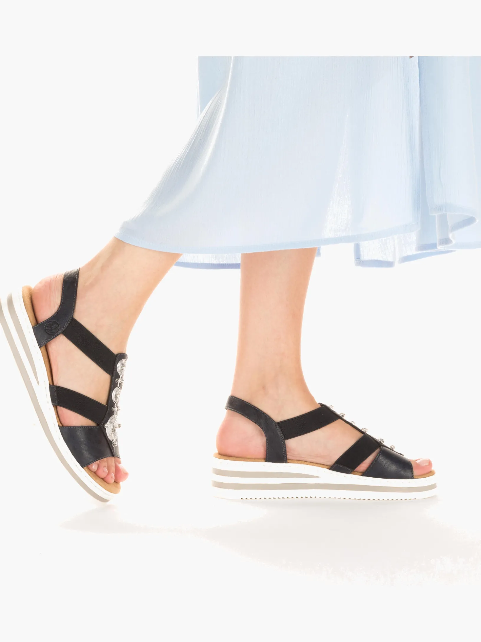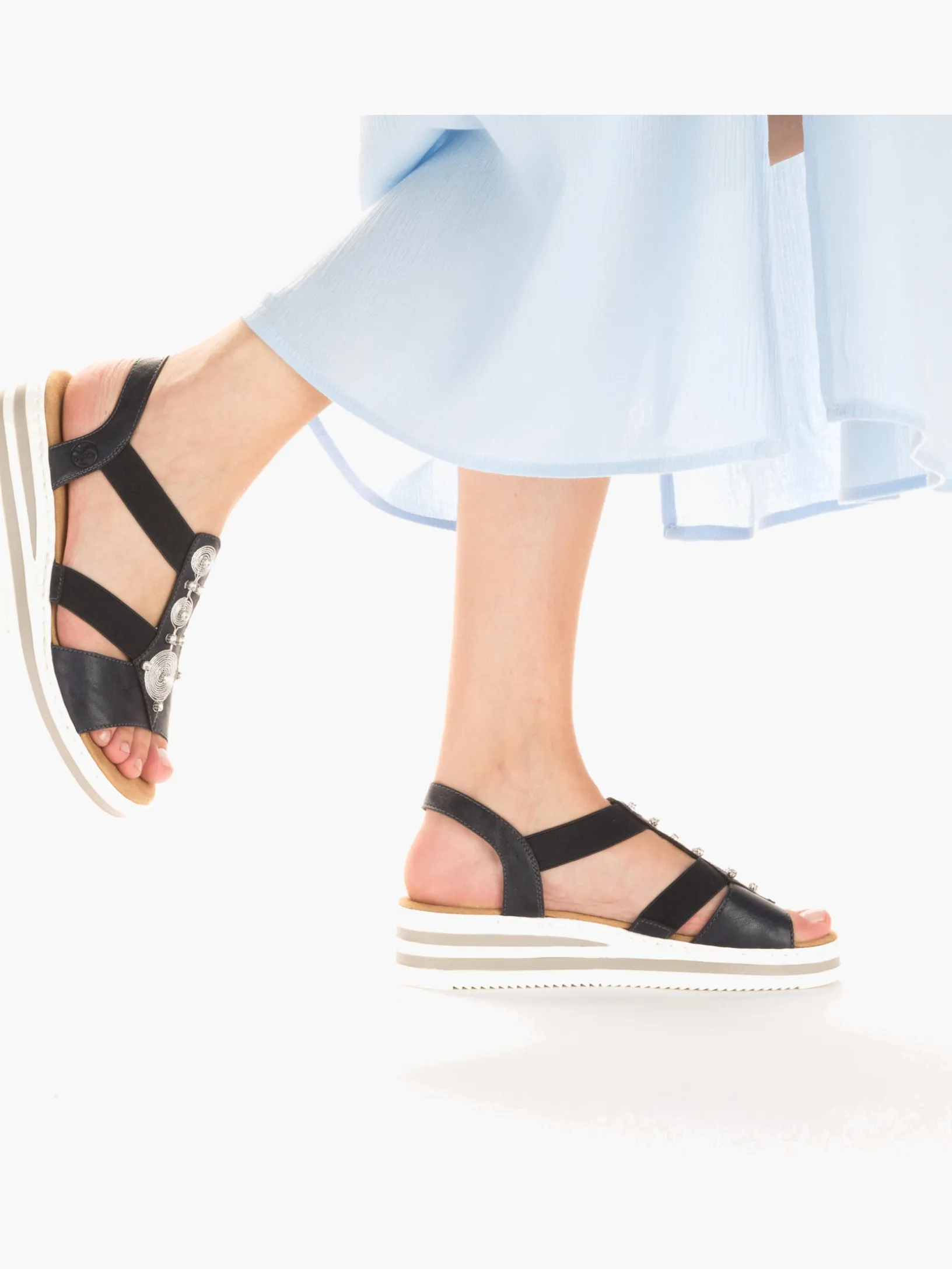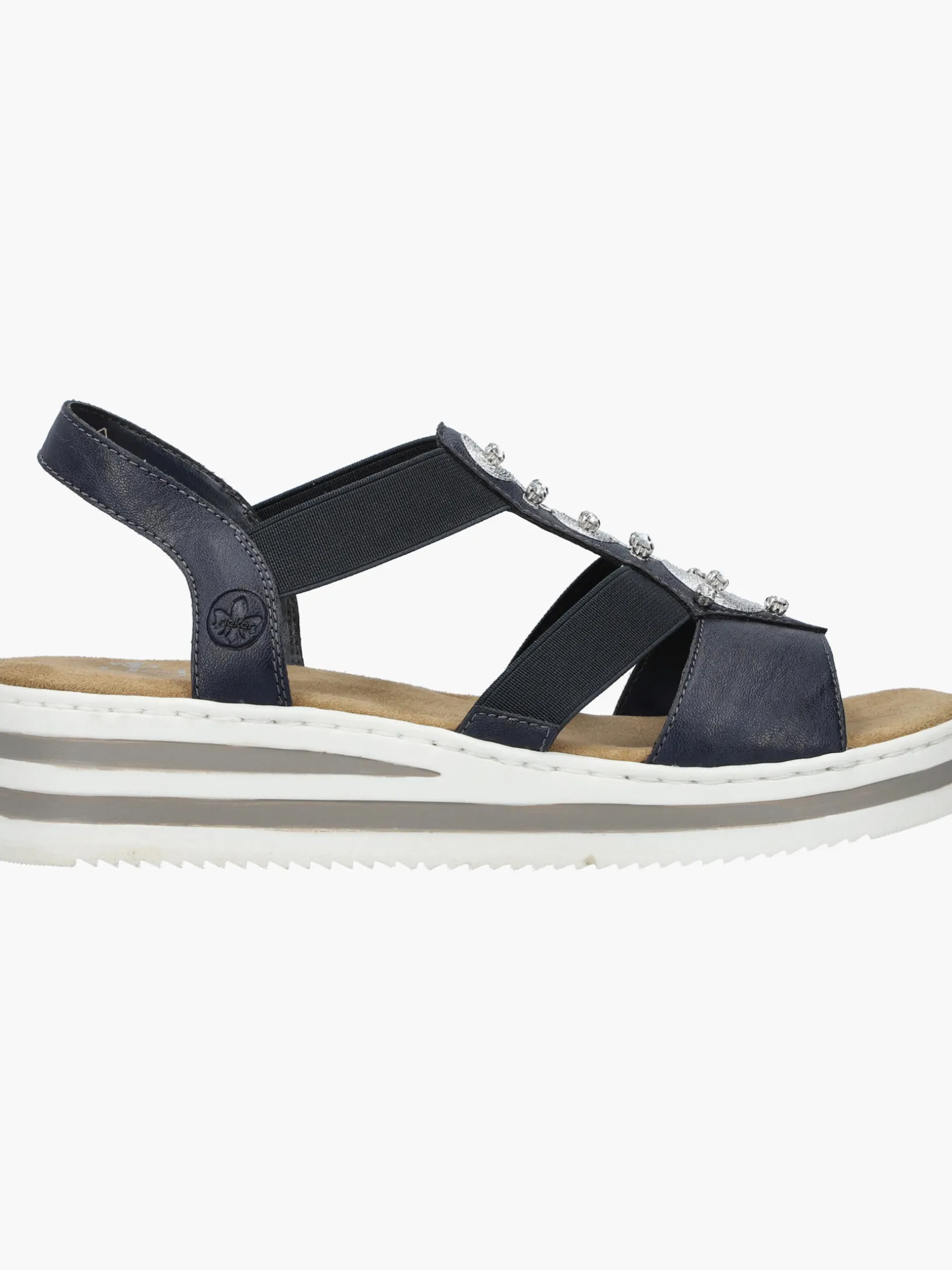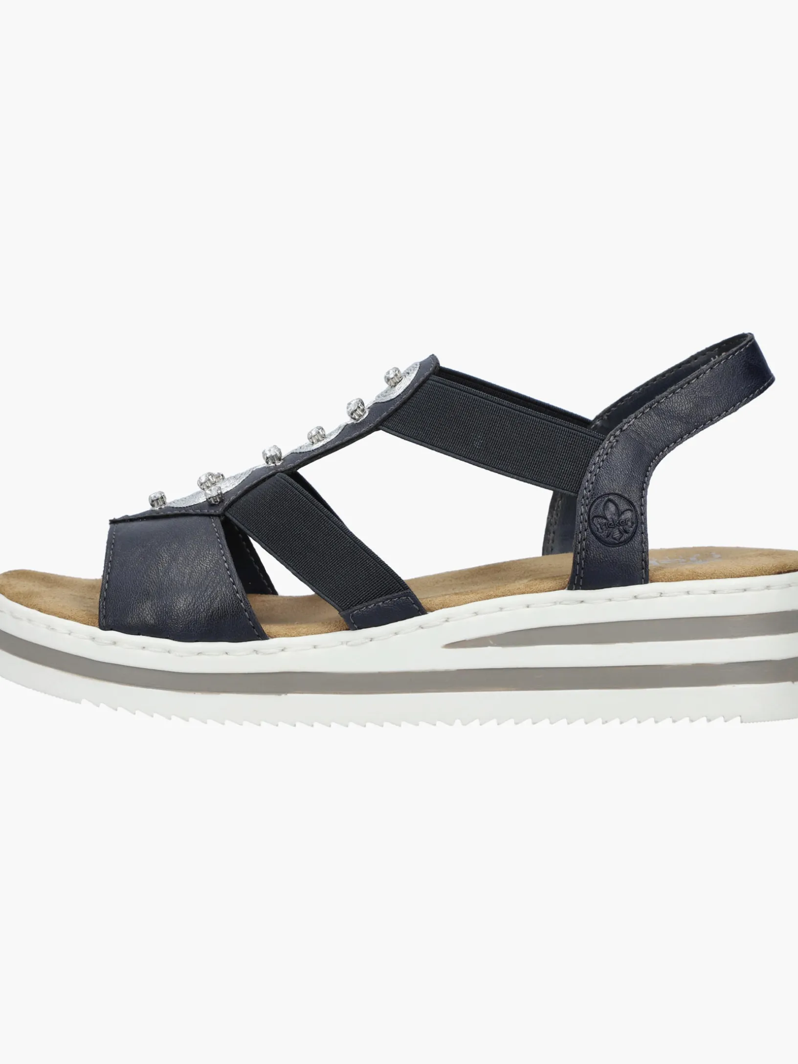 Die folgen dir auf Schritt und Tritt! Diese marineblauen Rieker Keilsandaletten garantieren ein himmlisches Tragegefühl. Breite Riemen und ein Elastikeinsatz sorgen zusammen mit dem schmalen Fersenband für perfekten Halt. Der Mittelriemen mit stilvollen Schmuckelementen in Silber rundet das moderne Design perfekt ab. Die schockabsorbierende und leichte Sohle bietet anhaltendes Wohlgefühl ‒ auch an langen Tagen. Außerdem sorgt die extra weiche Decksohle für eine Extraportion Tragekomfort. Extra-Halt ist durch die schmale Passform E 1/2 geboten. Modisches Wohlgefühl im Stil von Rieker!