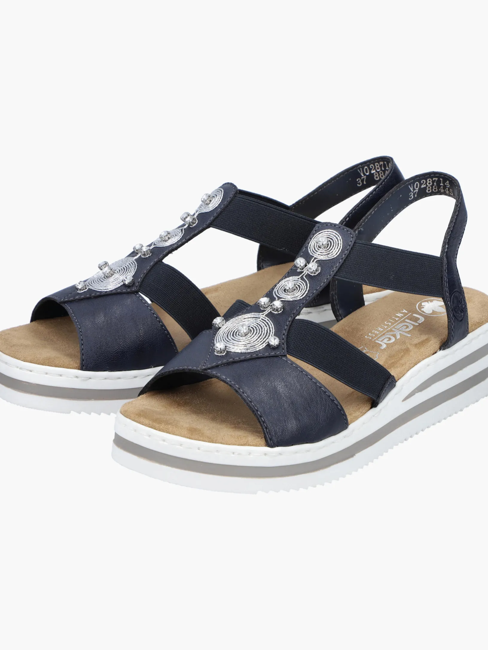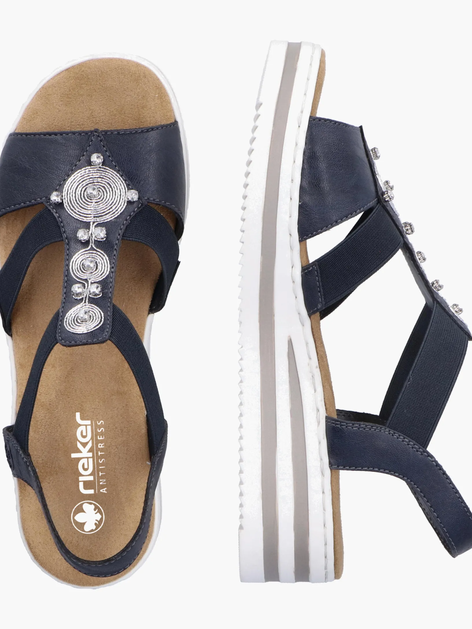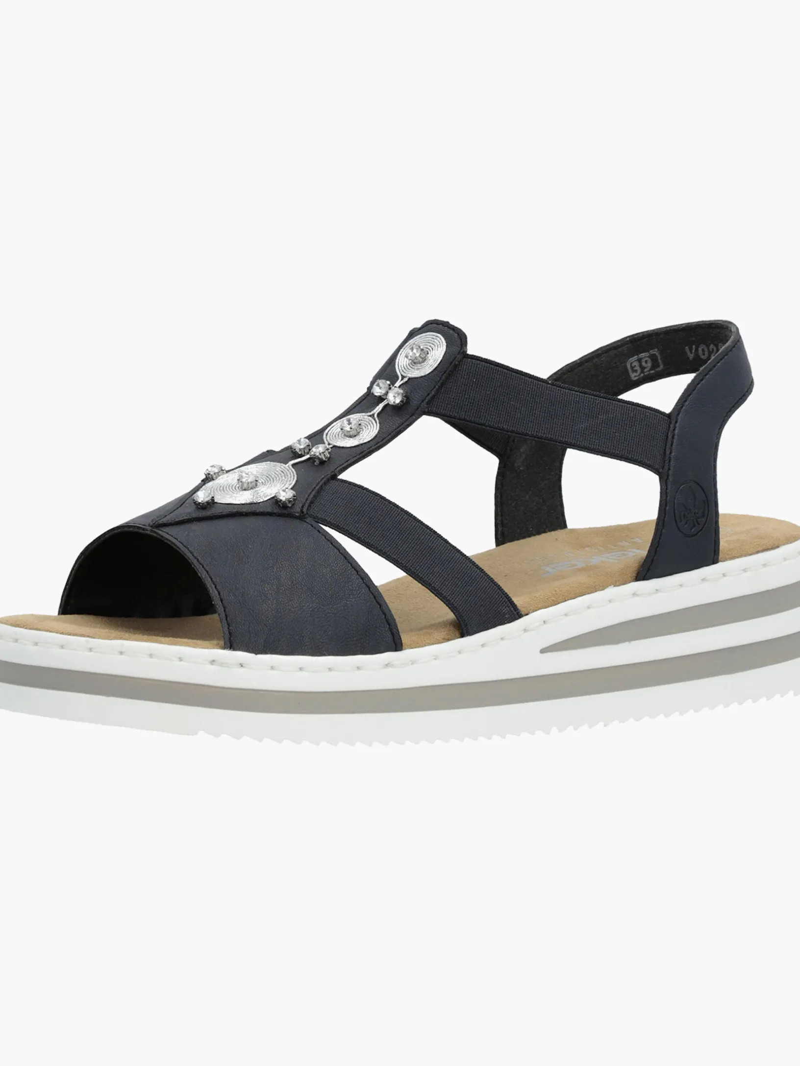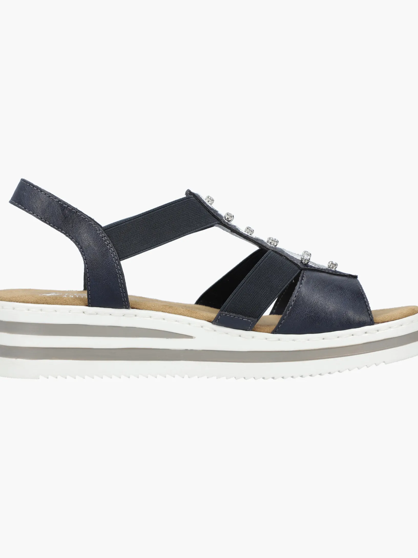 Die folgen dir auf Schritt und Tritt! Diese marineblauen Rieker Keilsandaletten garantieren ein himmlisches Tragegefühl. Breite Riemen und ein Elastikeinsatz sorgen zusammen mit dem schmalen Fersenband für perfekten Halt. Der Mittelriemen mit stilvollen Schmuckelementen in Silber rundet das moderne Design perfekt ab. Die schockabsorbierende und leichte Sohle bietet anhaltendes Wohlgefühl ‒ auch an langen Tagen. Außerdem sorgt die extra weiche Decksohle für eine Extraportion Tragekomfort. Extra-Halt ist durch die schmale Passform E 1/2 geboten. Modisches Wohlgefühl im Stil von Rieker!