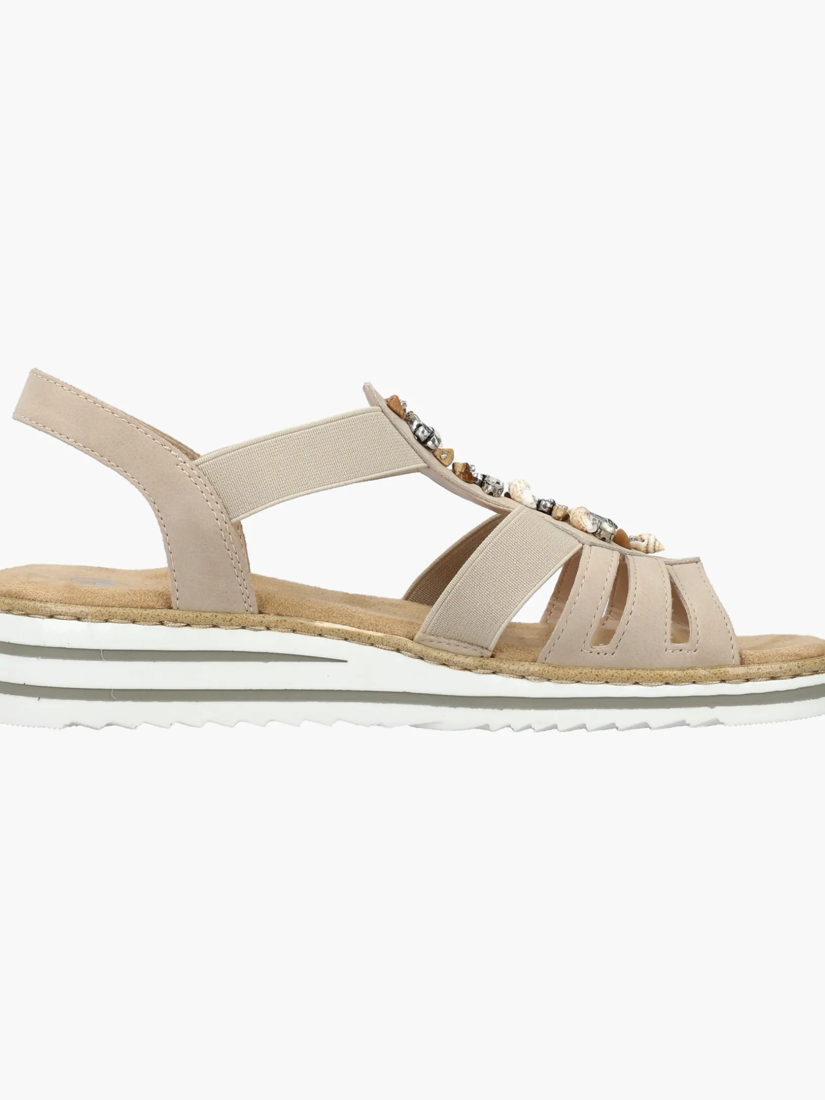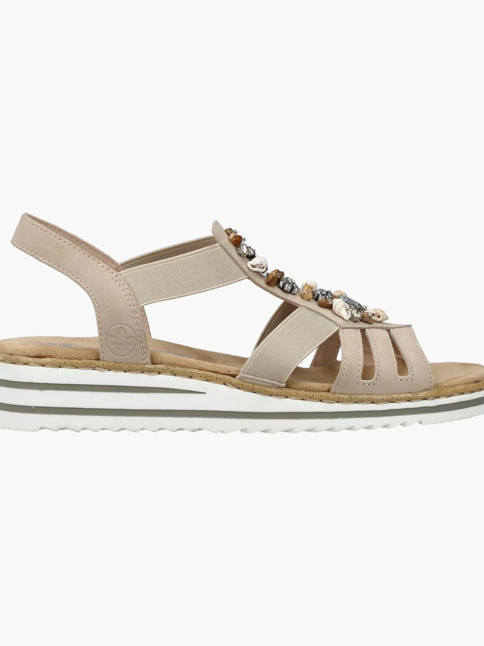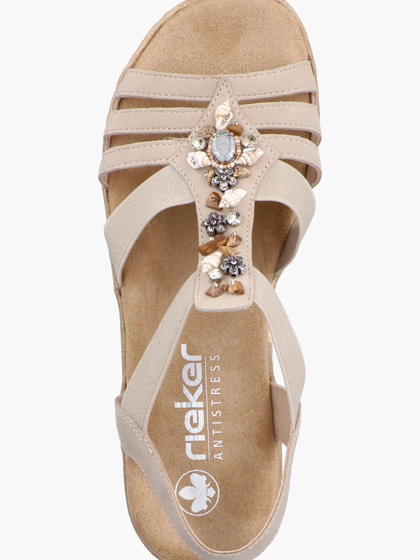 Immer einen Schritt voraus! Die cremebeigen Rieker Keilsandaletten setzen garantiert das richtige Statement und hinterlassen einen unvergesslichen Eindruck! Der Elastikeinsatz erleichtert das An- und Ausziehen besonders. Der Mittelriemen mit stilvollen Schmuckelementen rundet das moderne Design perfekt ab. Die leichte und schockabsorbierende Sohle sorgt für ein angenehmes Tragegefühl. Zudem sorgt die extra weiche Decksohle für eine Extraportion Tragekomfort. Durch die schmale Passform E 1/2 sitzt der Schuh angenehm eng, ohne dabei zu drücken. Was will man mehr?