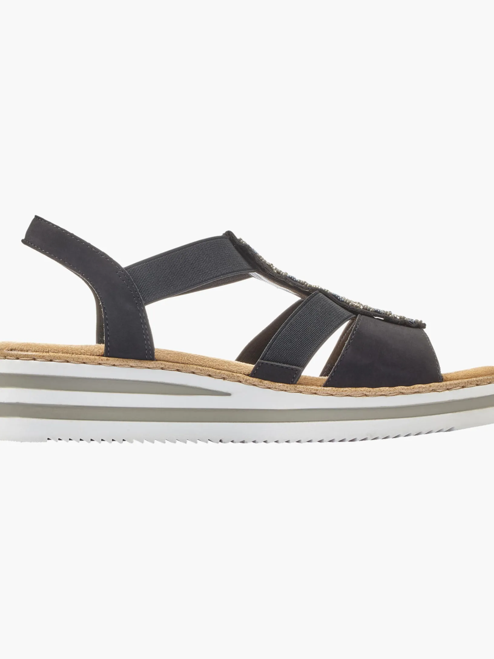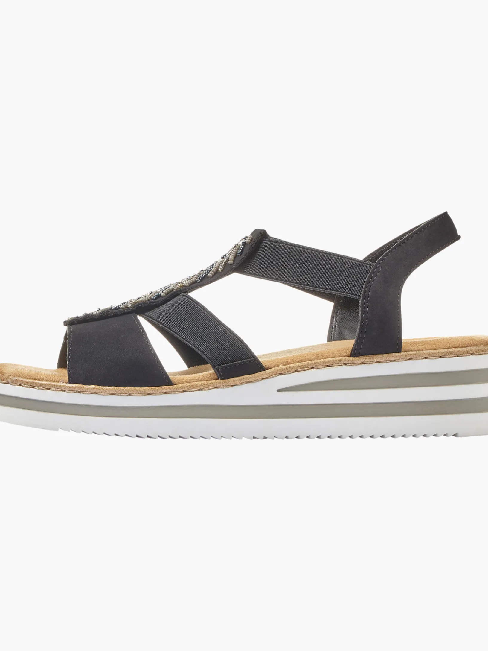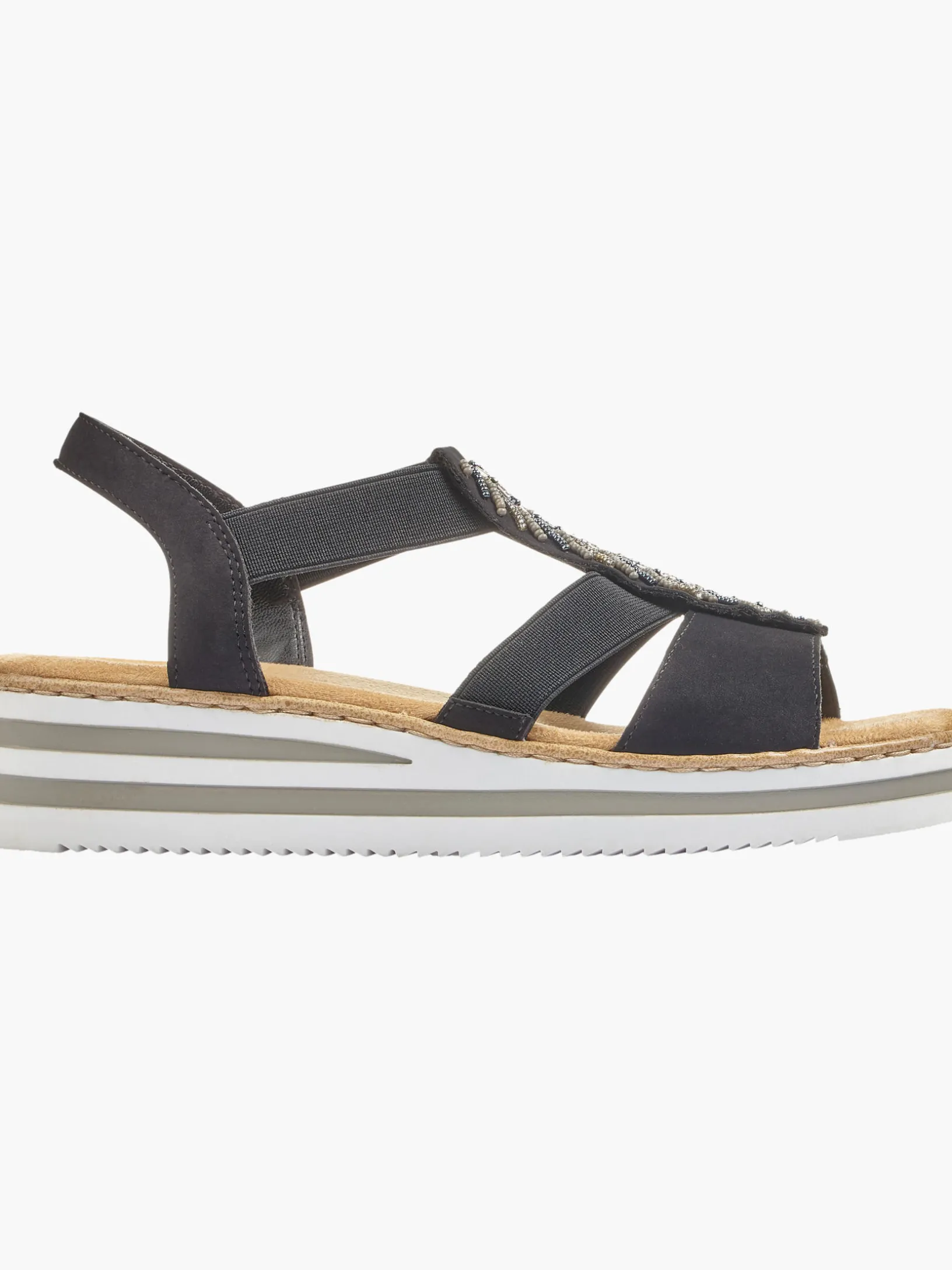 Immer einen Schritt voraus! Diese tiefschwarzen Rieker Keilsandaletten bringen alles unter einen Hut: Komfort, Funktion und natürlich Style. Einen zusätzlichen Pluspunkt stellen der Elastikeinsatz und der schmale Fersenriemen dar, die optimalen Halt verleihen und super zum optischen Gesamtbild passen. Der Mittelriemen mit blattförmigen Schmuckelementen sorgt für das gewisse Etwas. Mit der leichten und schockabsorbierenden Sohle freuen sich die Füße über besten Laufkomfort bei jedem Schritt. Ein weiteres Plus ist die extra weiche Decksohle. Extra-Halt ist durch die schmale Passform E 1/2 geboten. Gesucht, gefunden!