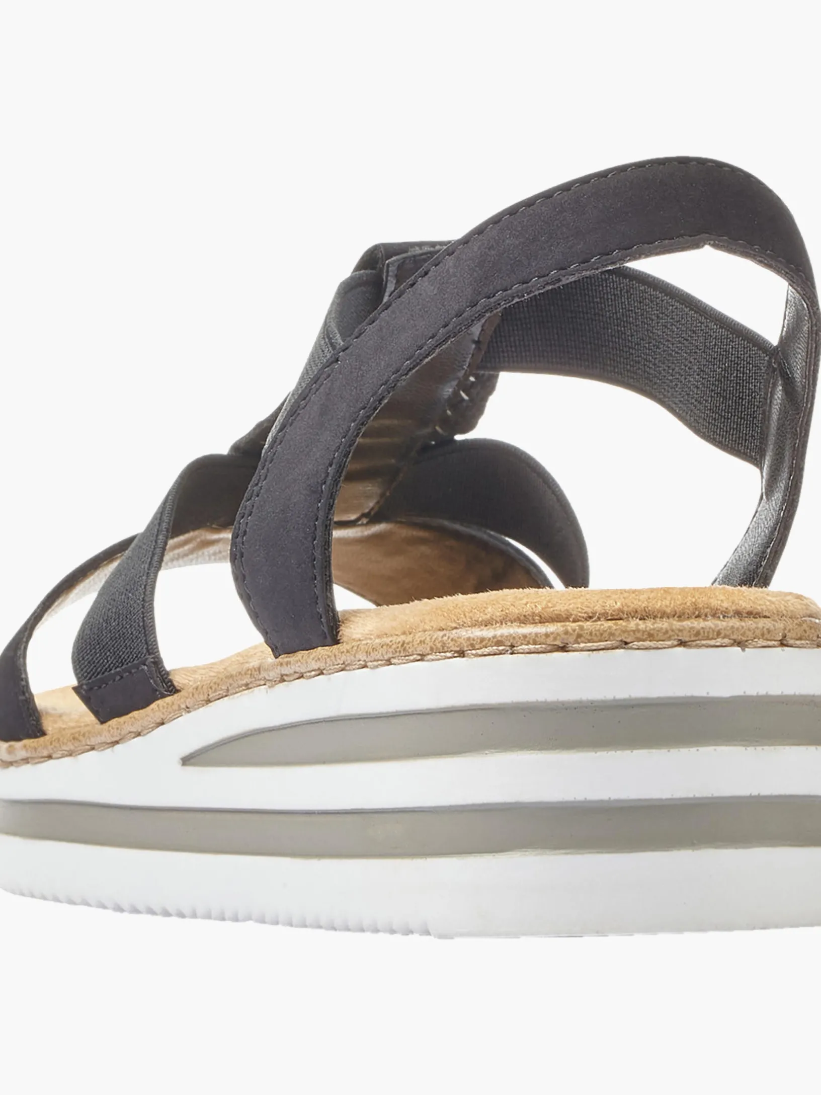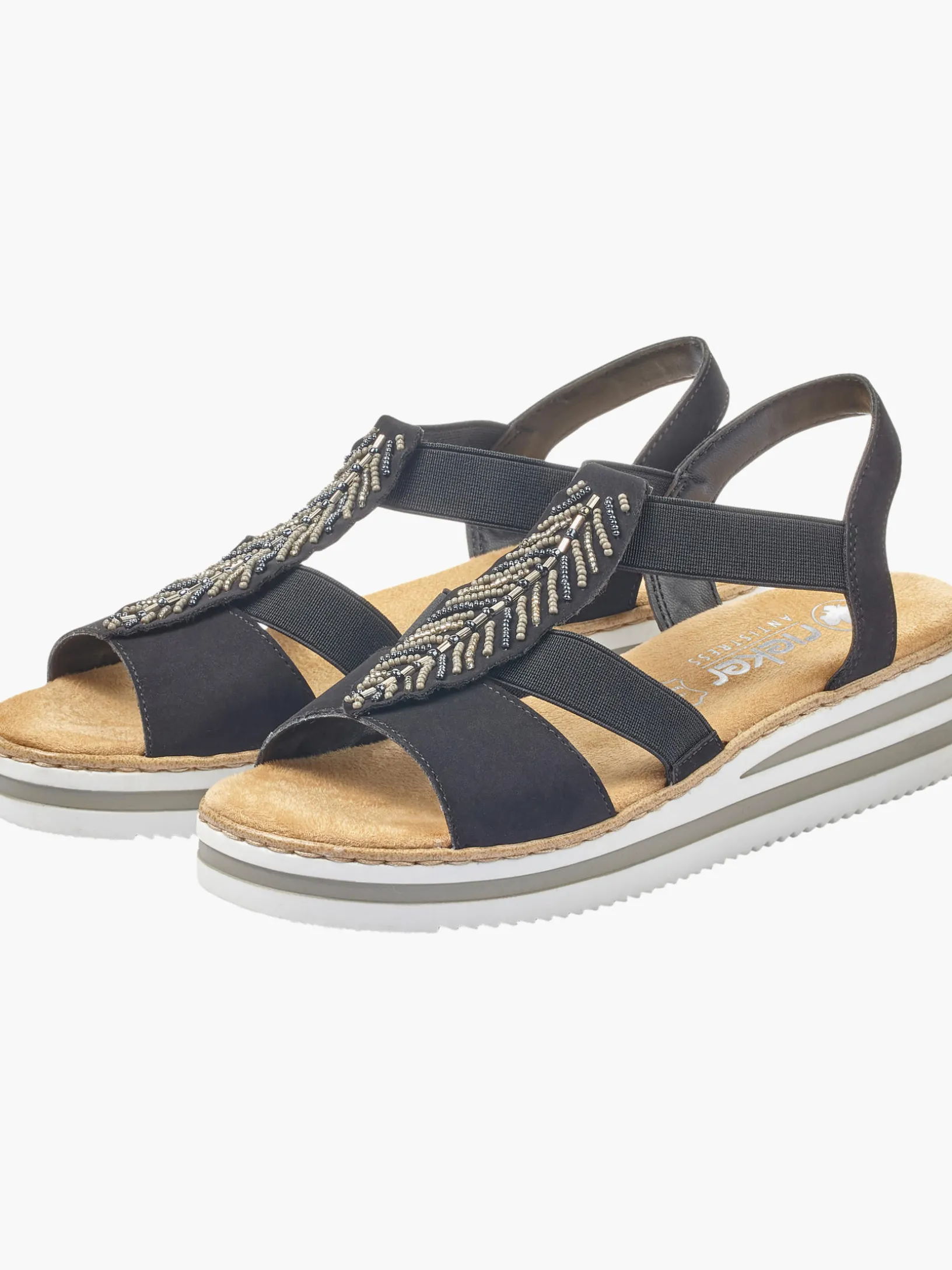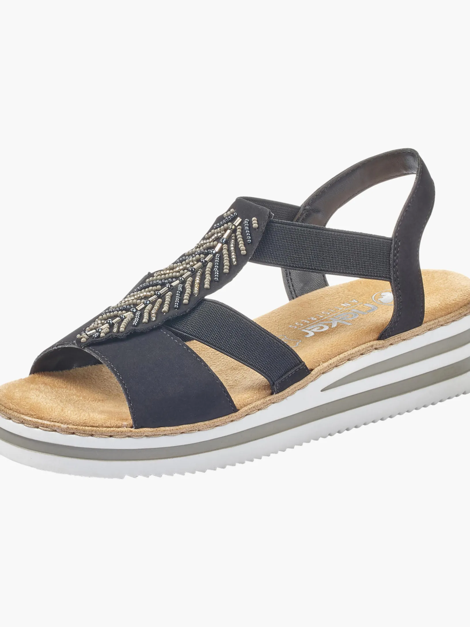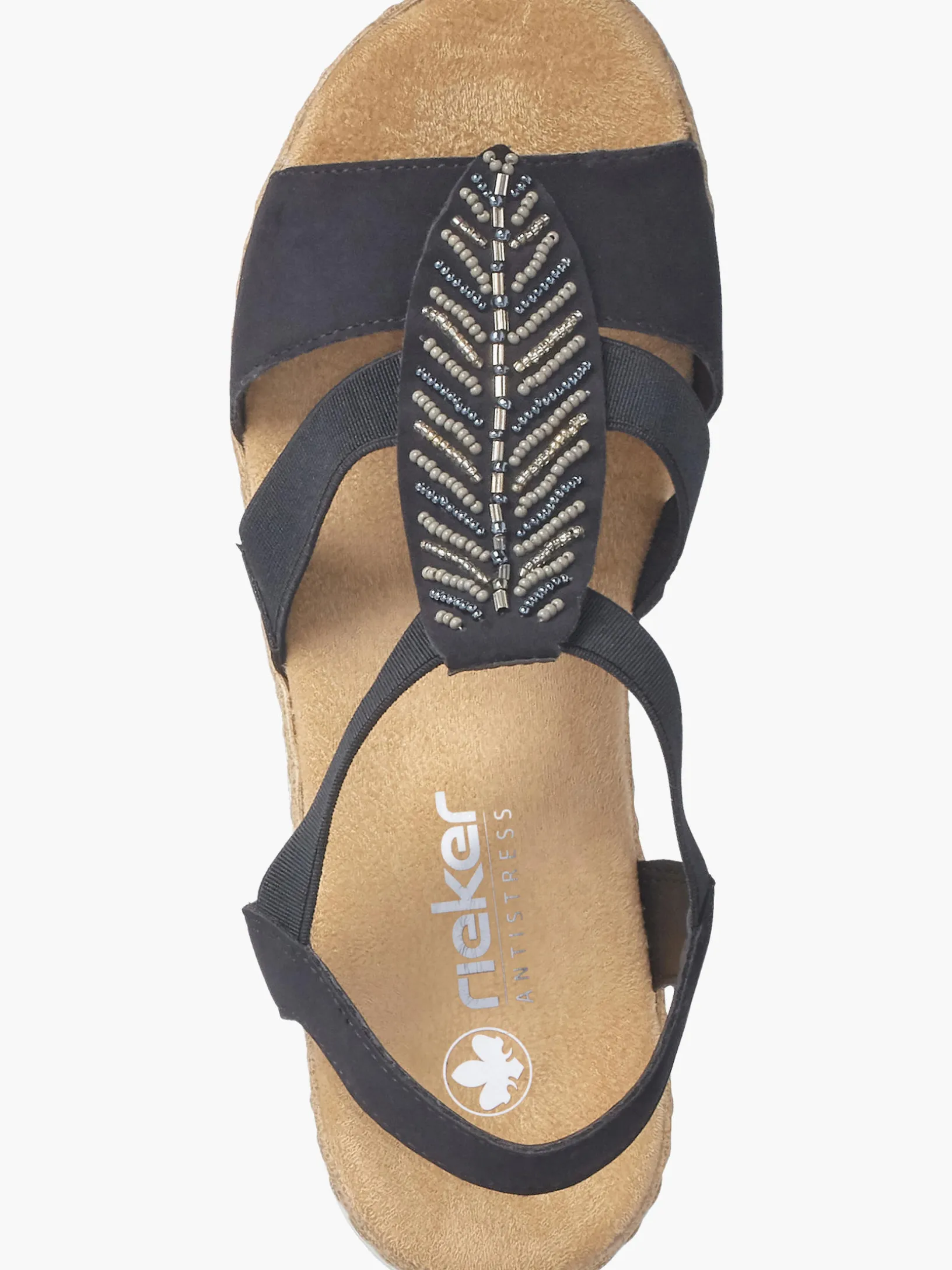 Immer einen Schritt voraus! Diese tiefschwarzen Rieker Keilsandaletten bringen alles unter einen Hut: Komfort, Funktion und natürlich Style. Einen zusätzlichen Pluspunkt stellen der Elastikeinsatz und der schmale Fersenriemen dar, die optimalen Halt verleihen und super zum optischen Gesamtbild passen. Der Mittelriemen mit blattförmigen Schmuckelementen sorgt für das gewisse Etwas. Mit der leichten und schockabsorbierenden Sohle freuen sich die Füße über besten Laufkomfort bei jedem Schritt. Ein weiteres Plus ist die extra weiche Decksohle. Extra-Halt ist durch die schmale Passform E 1/2 geboten. Gesucht, gefunden!