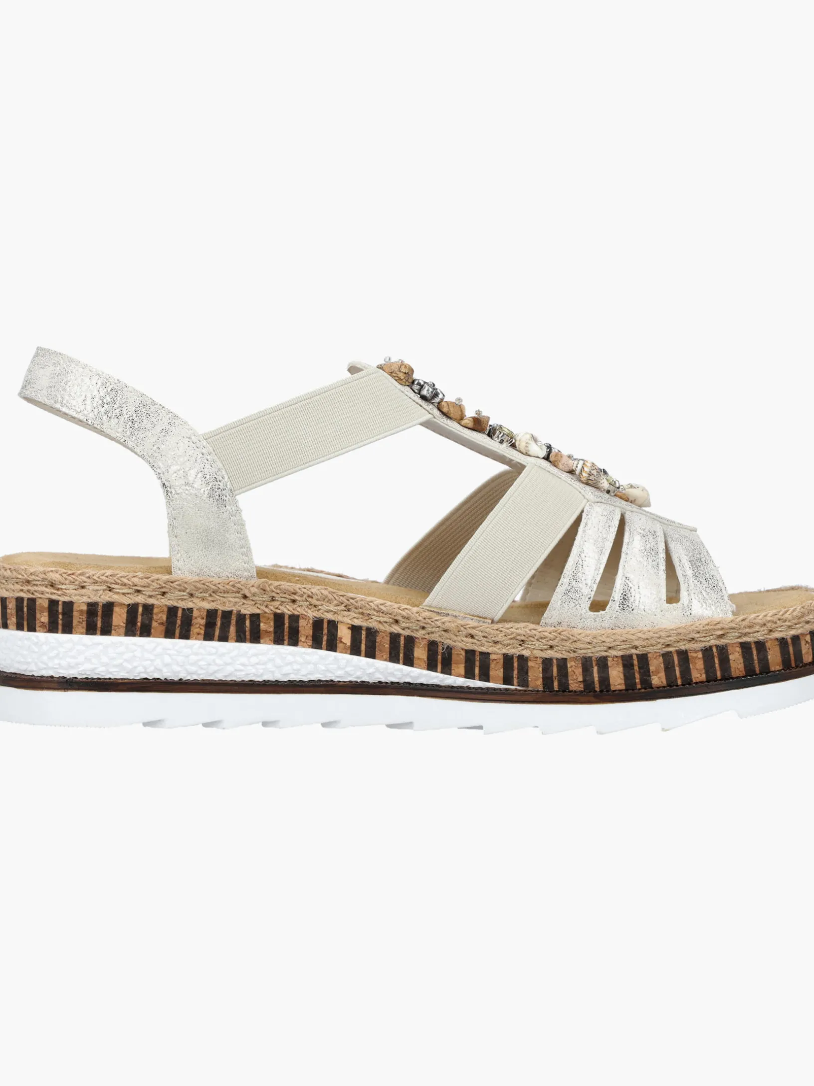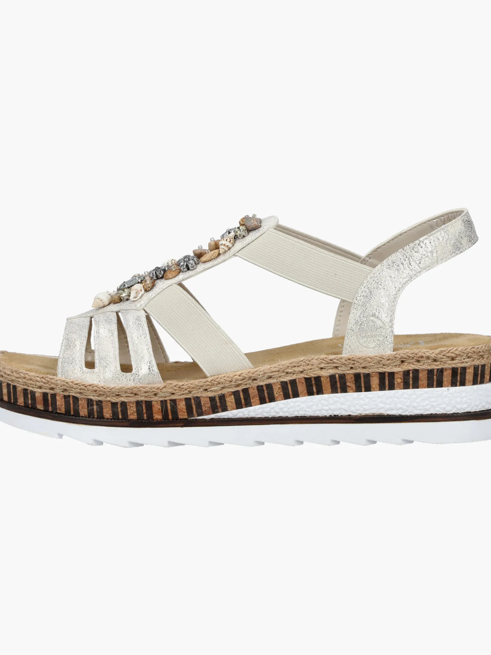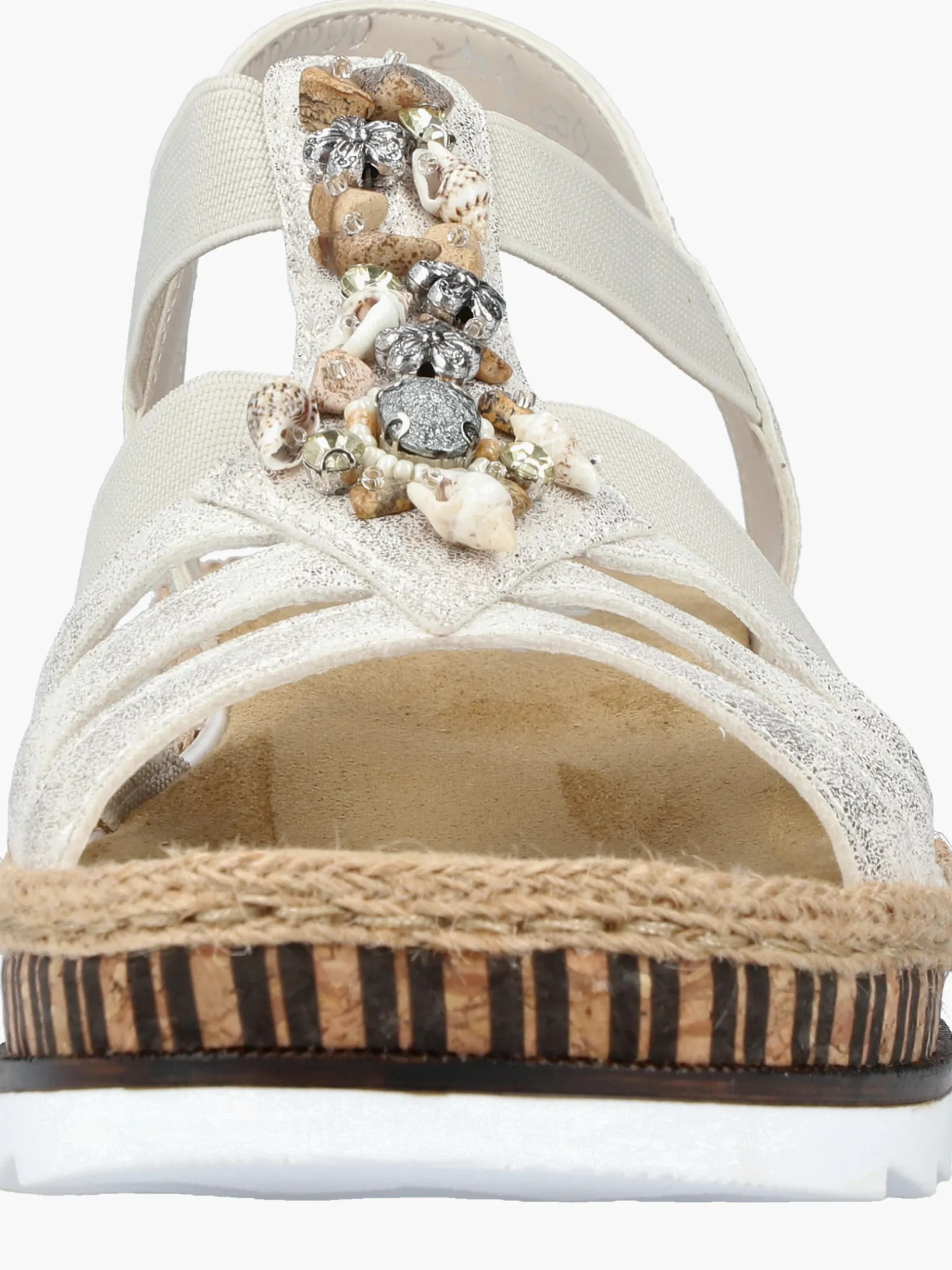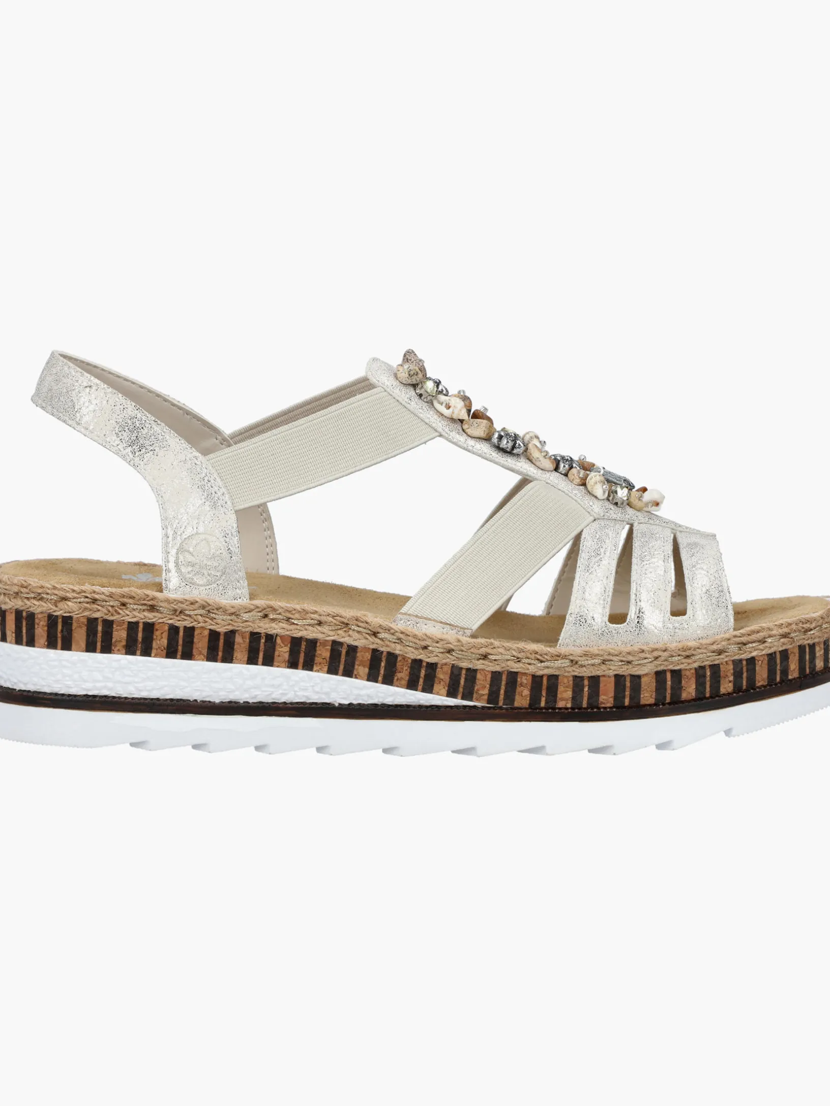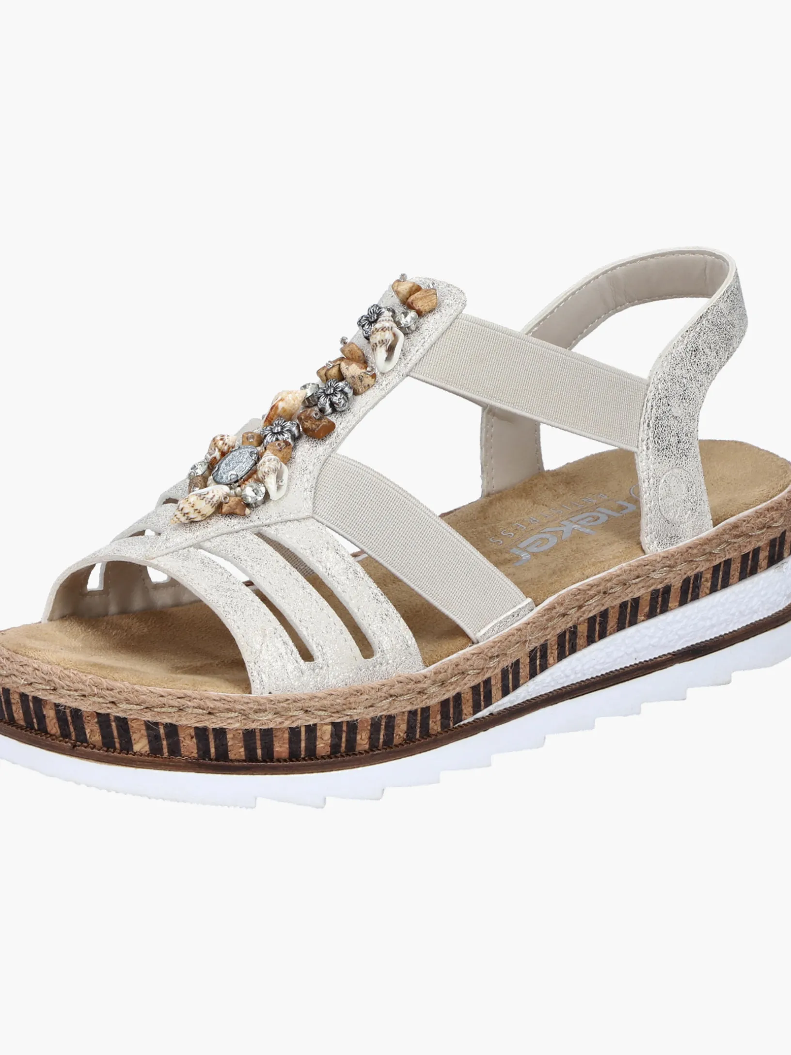 Lieblingsschuh-Potential! Diese beigen Rieker Keilsandaletten sind ein komfortabler Begleiter. Der Einstieg wird durch einen Elastikeinsatz erleichtert. Der Mittelriemen mit dekorativen Perlen setzt das Design modisch in Szene. Die sehr leichte und schockabsorbierende Sohle verwöhnt die Füße zusätzlich bei jedem Schritt. Außerdem ist die Decksohle extra weich. Durch die schmale Passform E 1/2 bieten die Keilsandaletten zusätzlichen Halt. 100% Lieblingsschuh-Potential!
