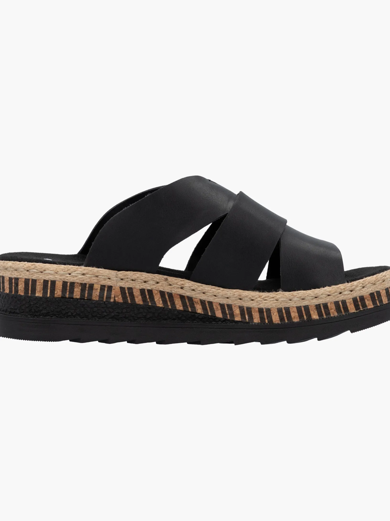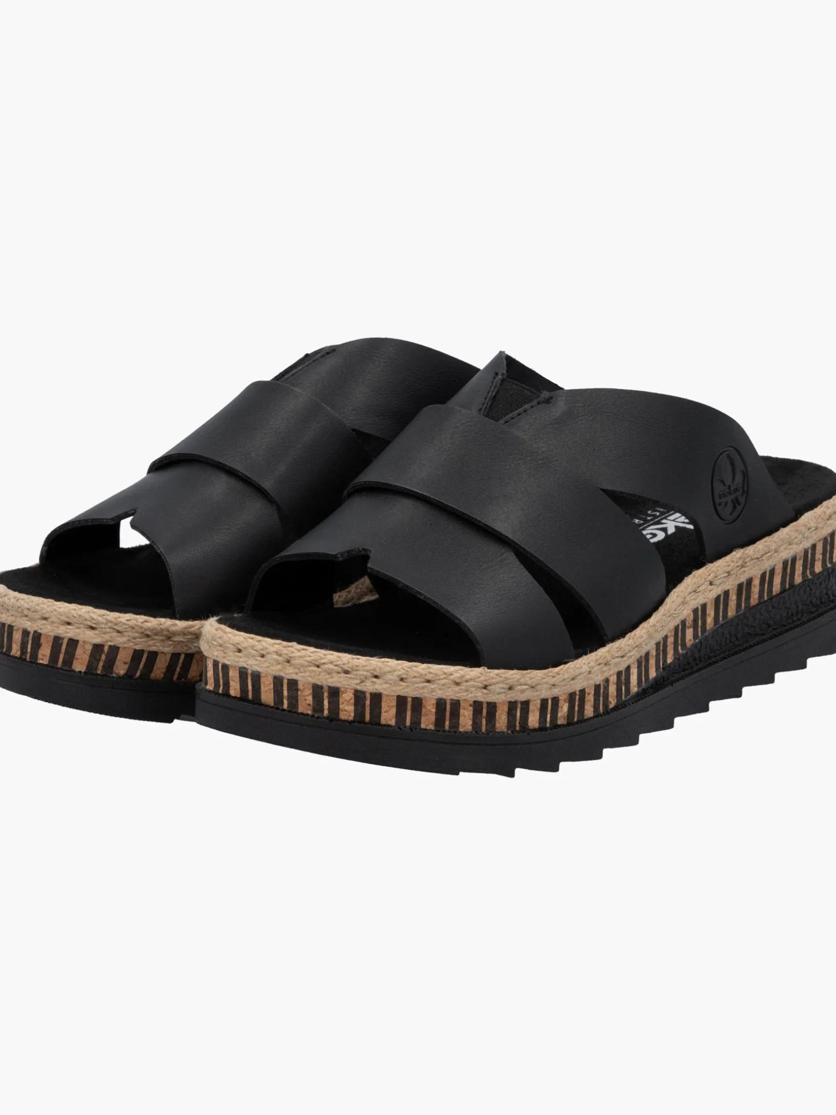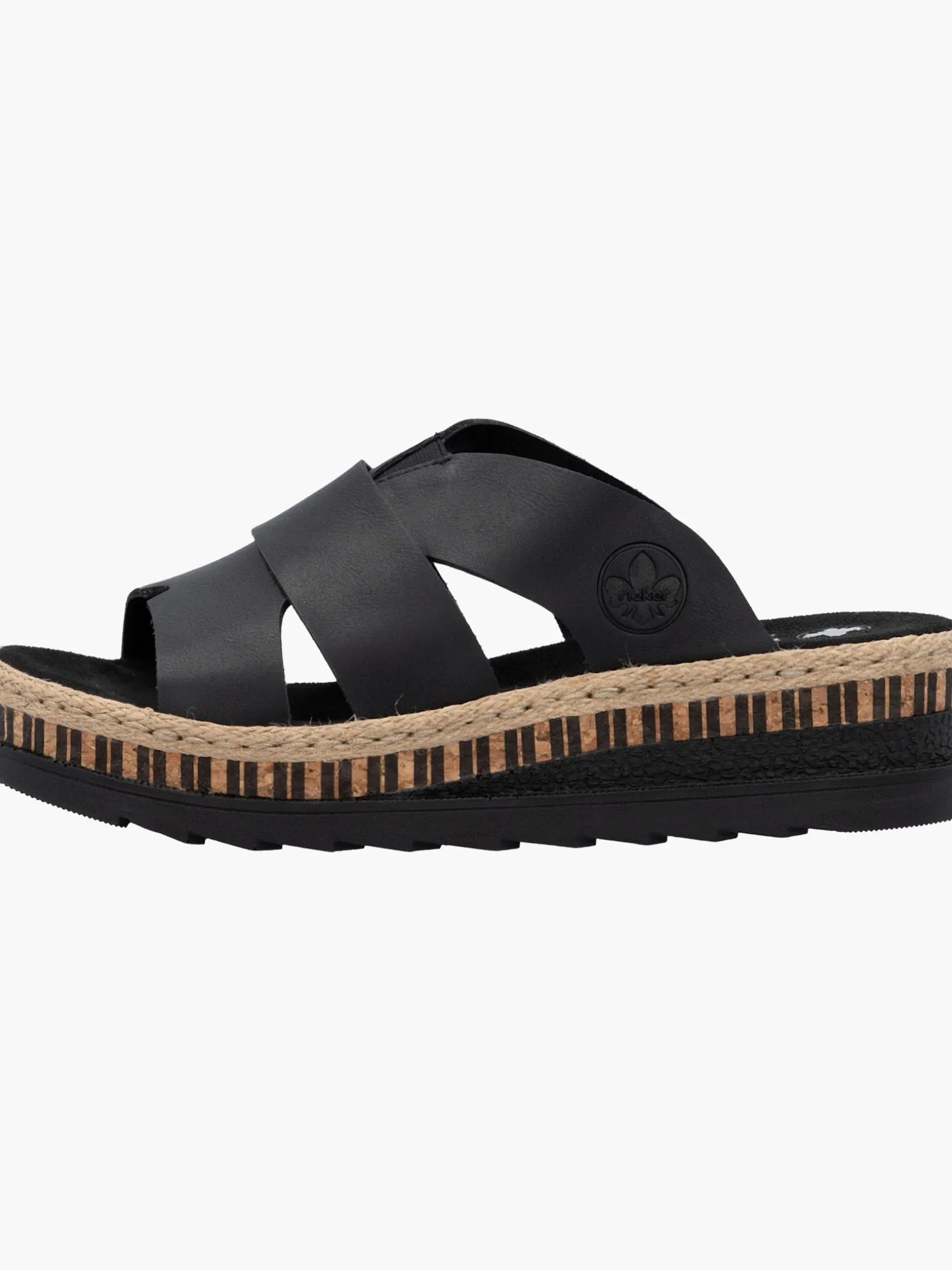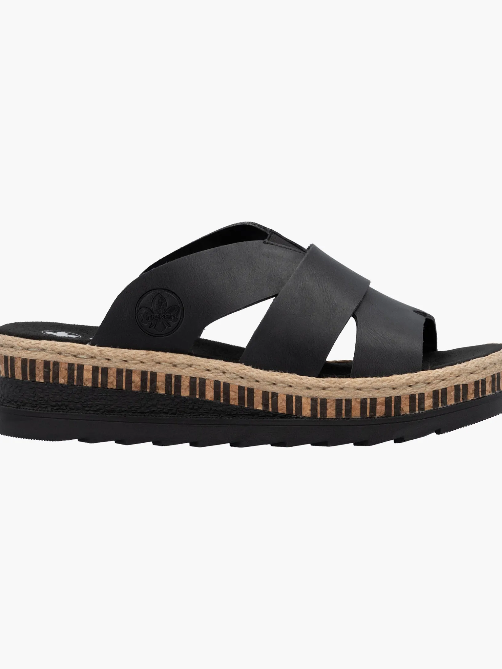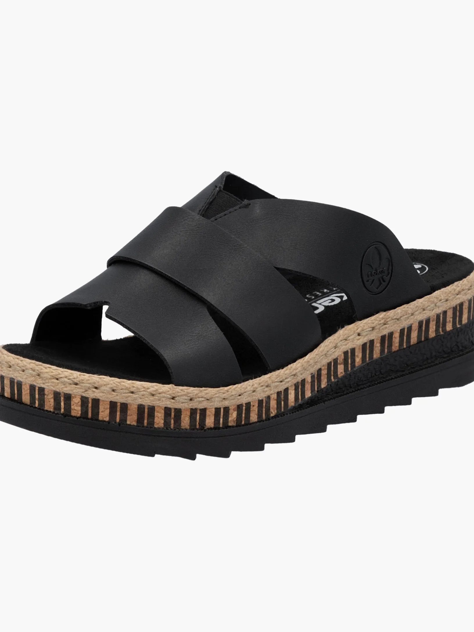 All black everything! Mit dieser alltagstauglichen nachtschwarzen Rieker Pantolette für Damen bist du immer gut angezogen und kannst dich auf maximalen Komfort verlassen. Ohne Verschluss lassen sich die Schuhe außerdem unkompliziert anziehen. Das Streifendesign auf der Sohle rundet den Look des Schuhs harmonisch ab. Der offene Schuh sowie die schockabsorbierende und sehr leichte Sohle sorgen für anhaltendes Wohlgefühl. Darüber hinaus ist die Decksohle extra weich. Für zusätzlichen Halt sorgt die schmale Passform E 1/2. Damit wird die warme Saison noch toller!