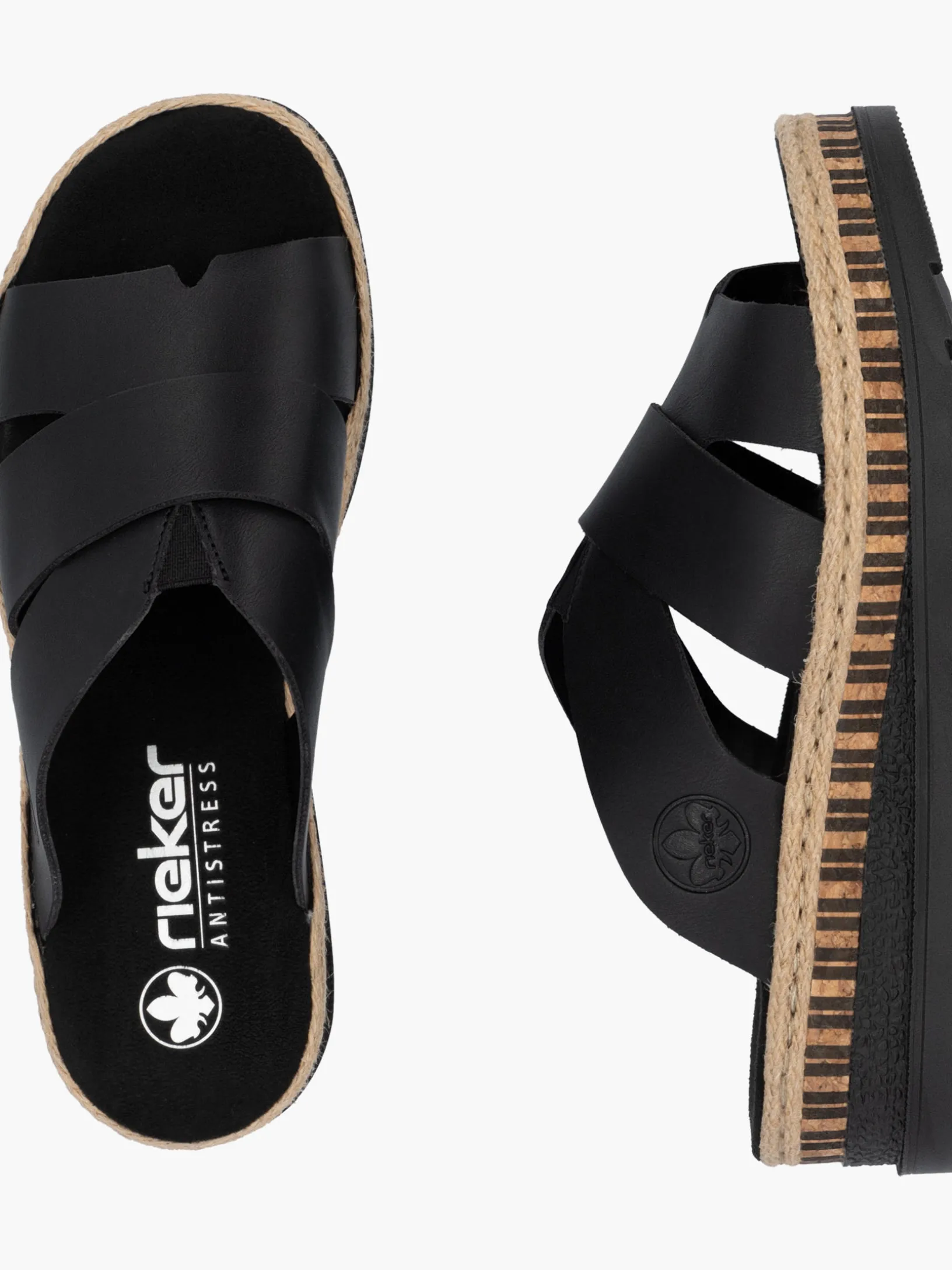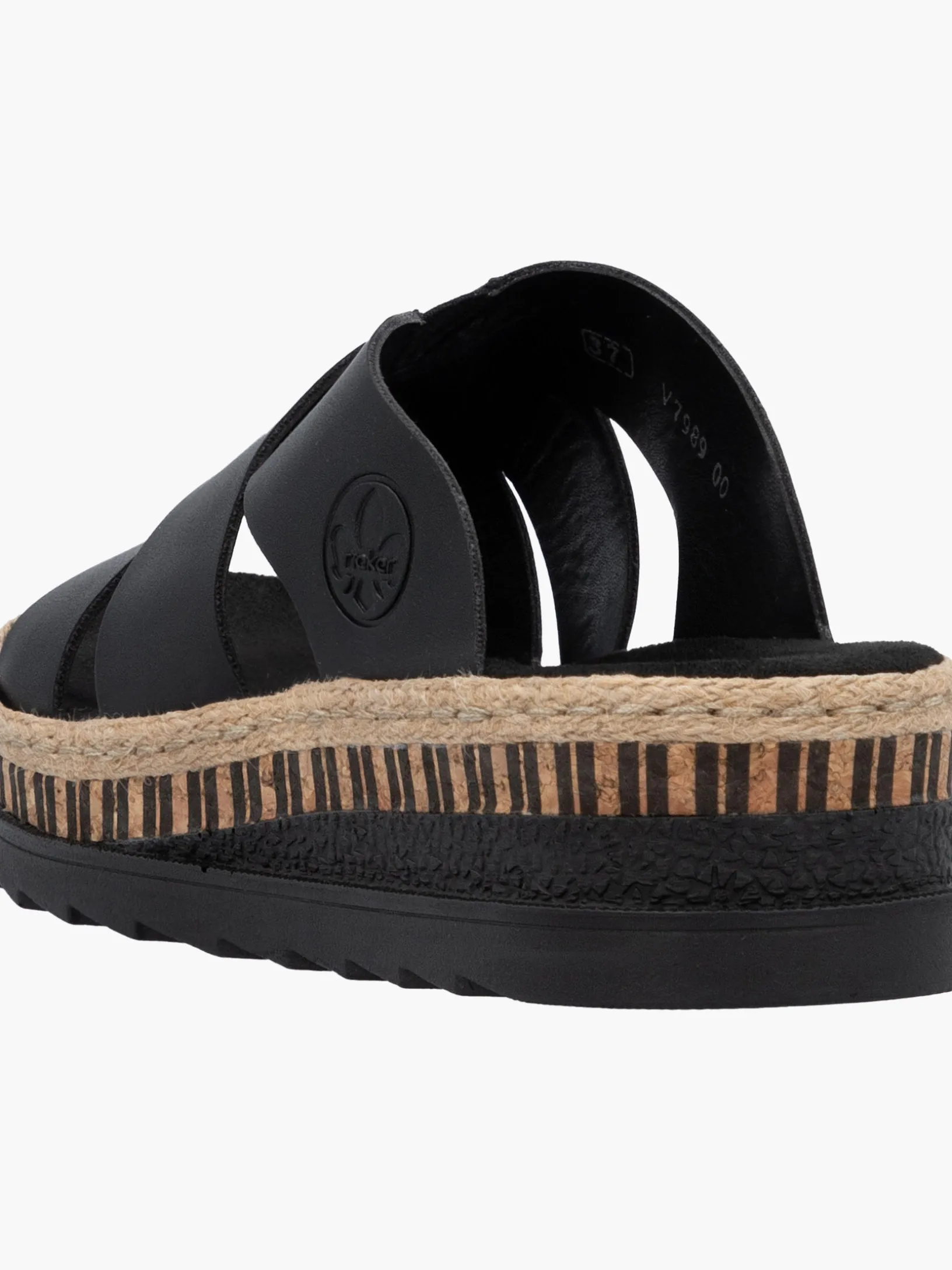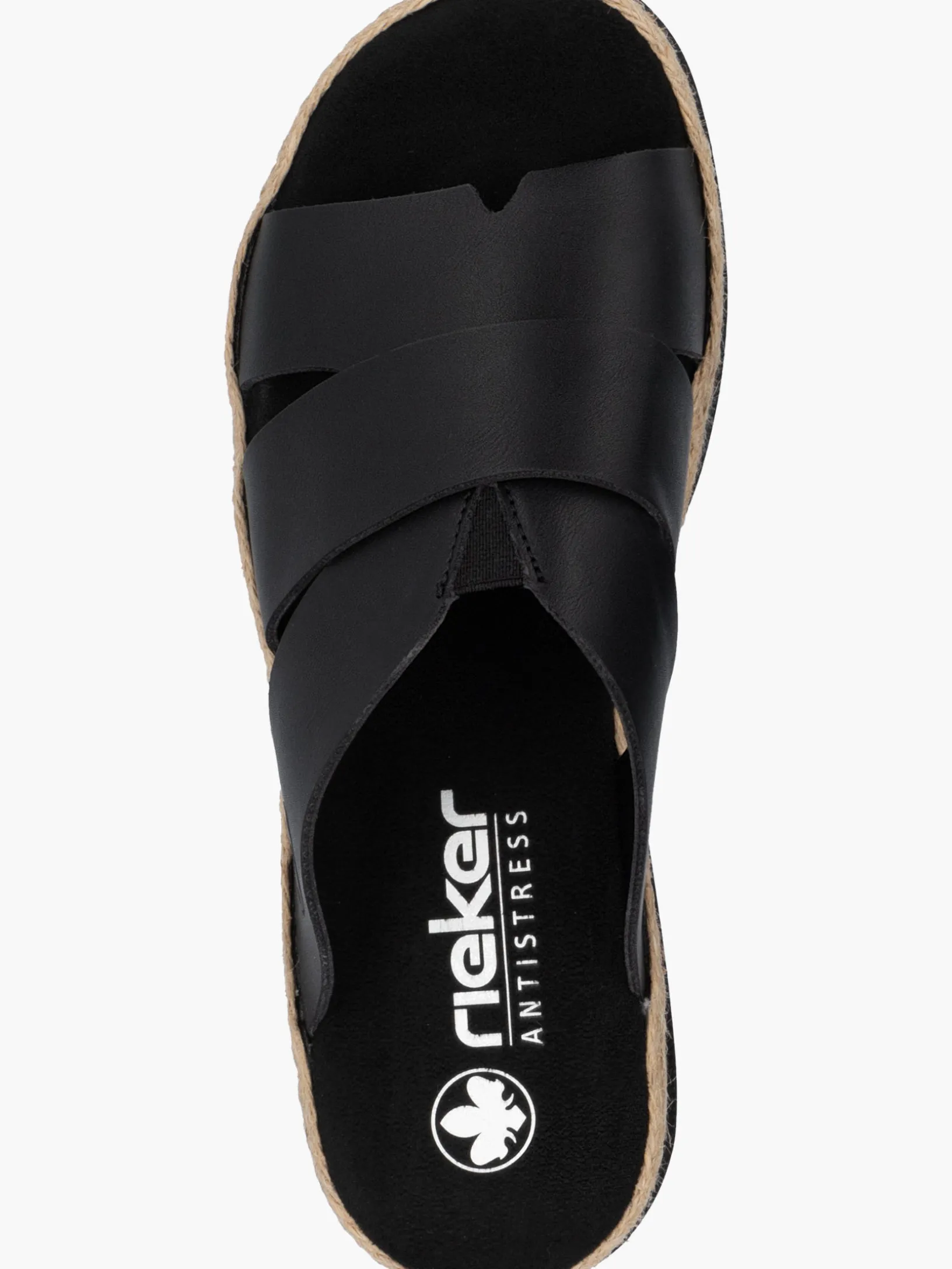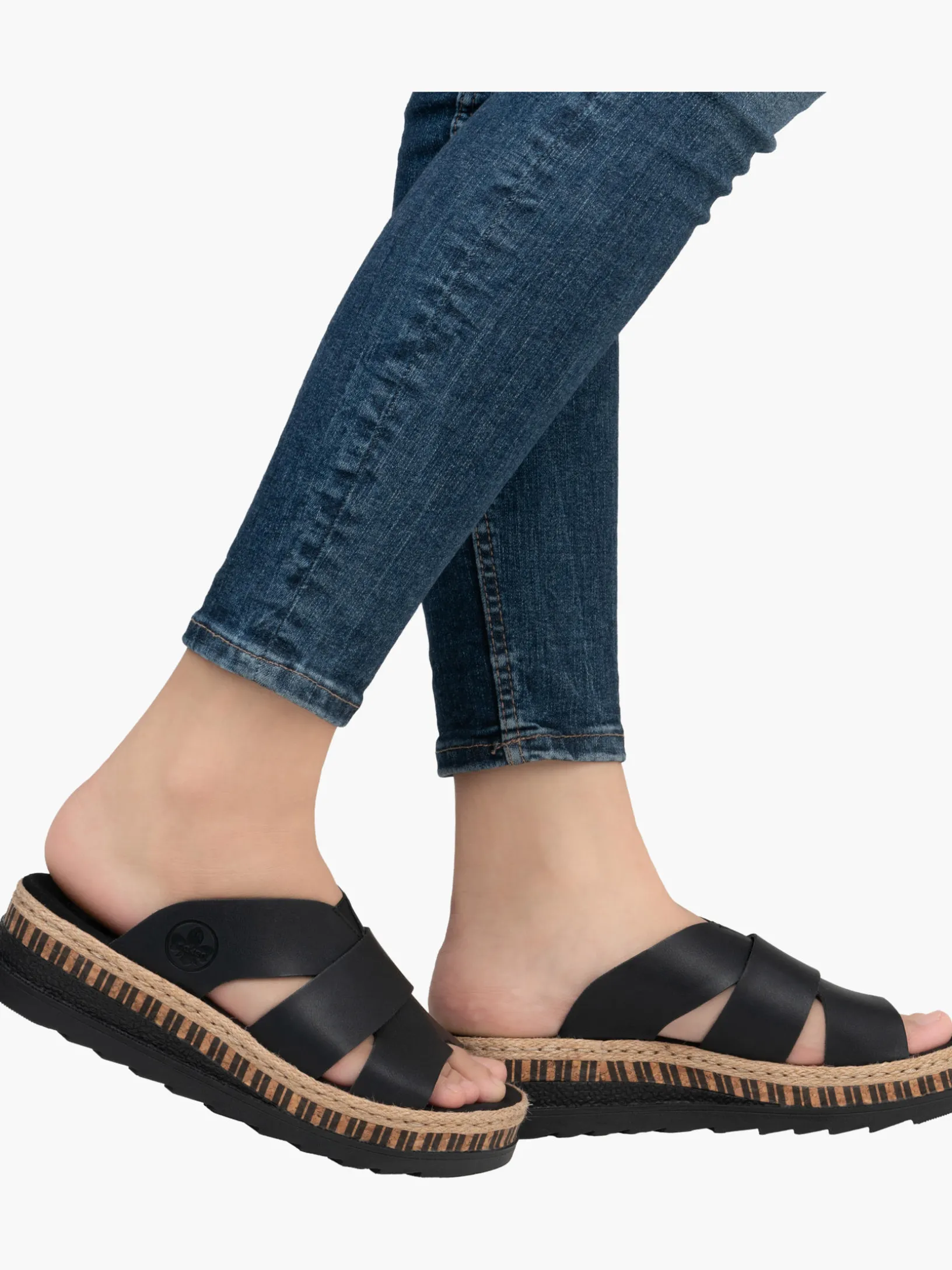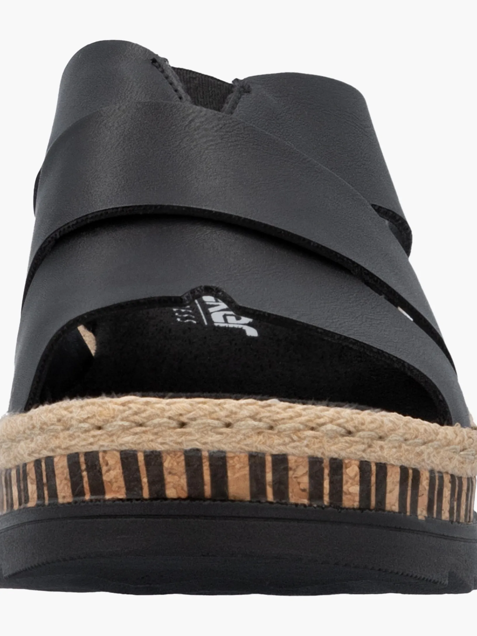 All black everything! Mit dieser alltagstauglichen nachtschwarzen Rieker Pantolette für Damen bist du immer gut angezogen und kannst dich auf maximalen Komfort verlassen. Ohne Verschluss lassen sich die Schuhe außerdem unkompliziert anziehen. Das Streifendesign auf der Sohle rundet den Look des Schuhs harmonisch ab. Der offene Schuh sowie die schockabsorbierende und sehr leichte Sohle sorgen für anhaltendes Wohlgefühl. Darüber hinaus ist die Decksohle extra weich. Für zusätzlichen Halt sorgt die schmale Passform E 1/2. Damit wird die warme Saison noch toller!