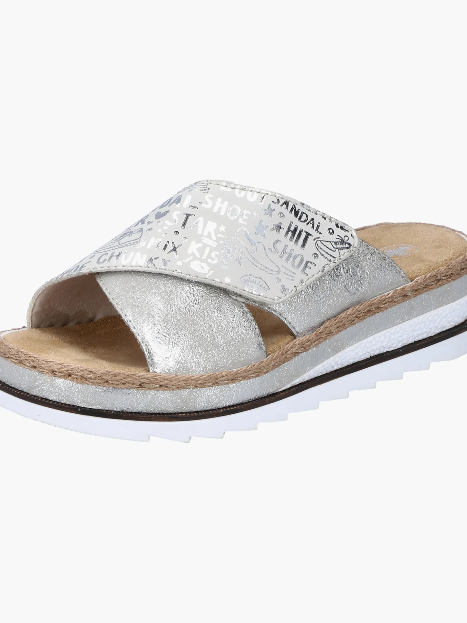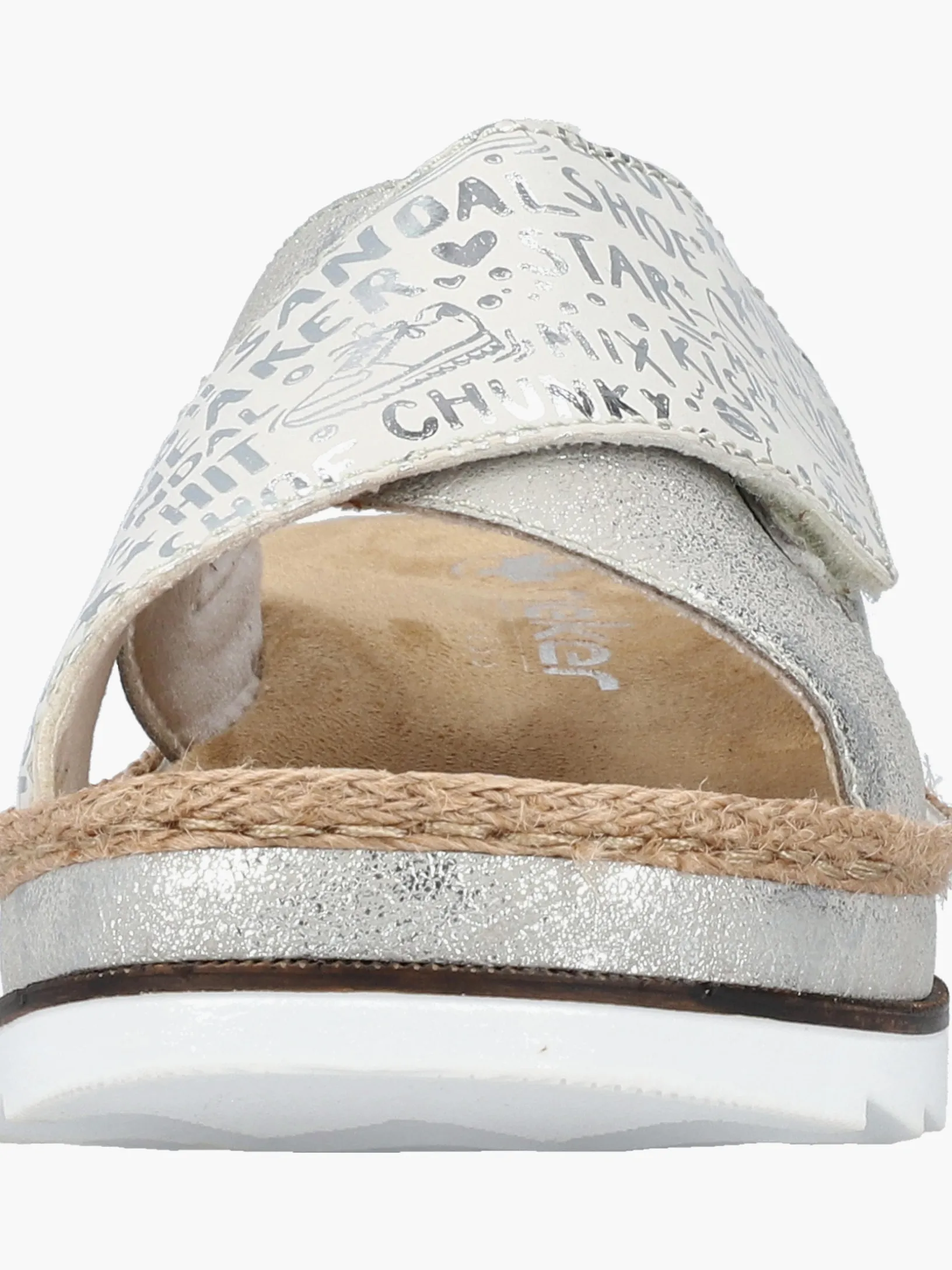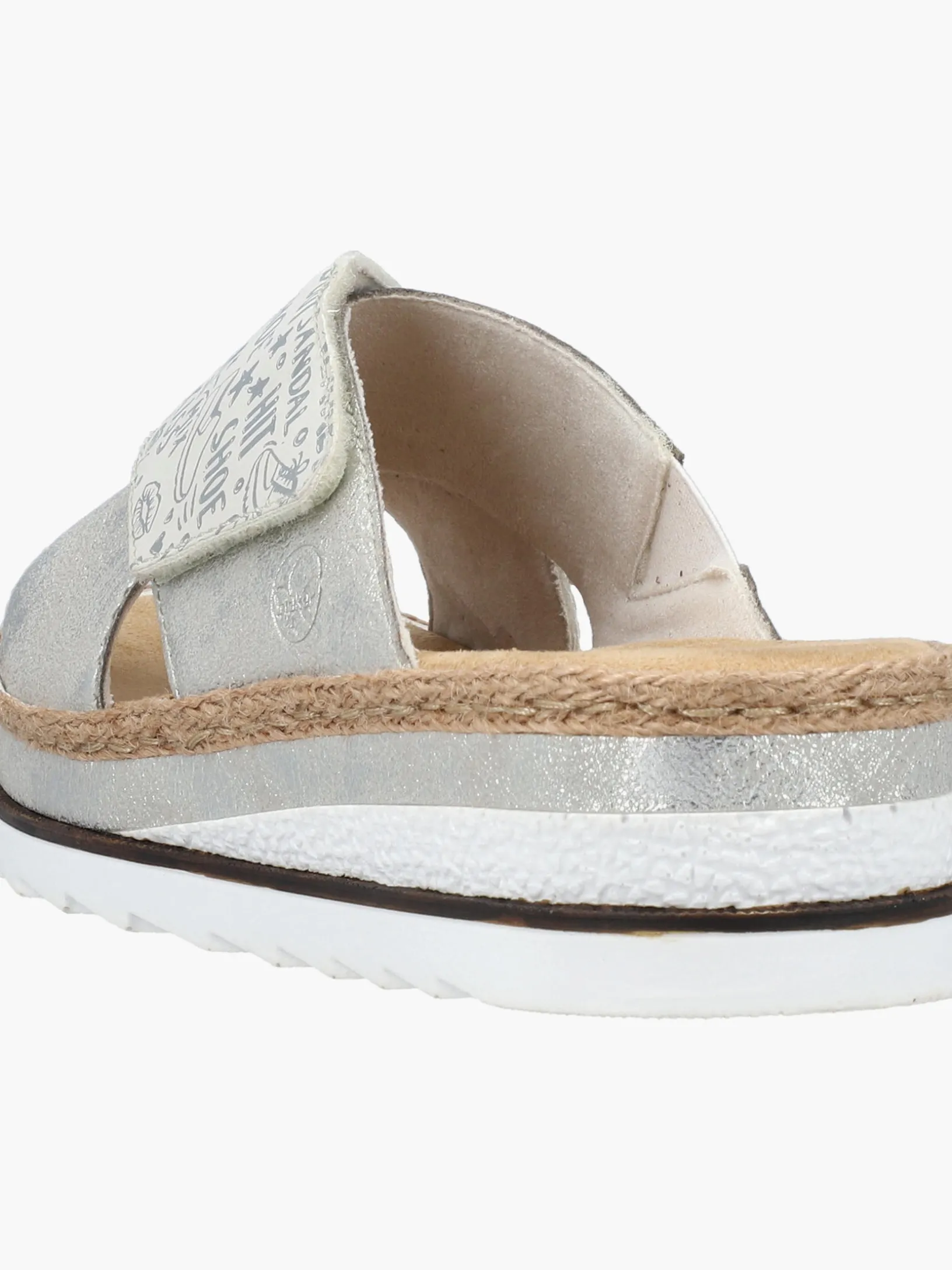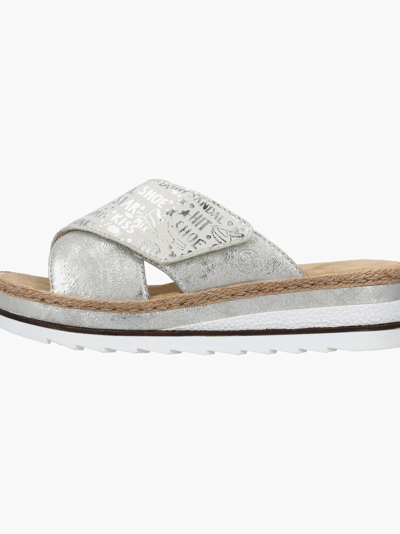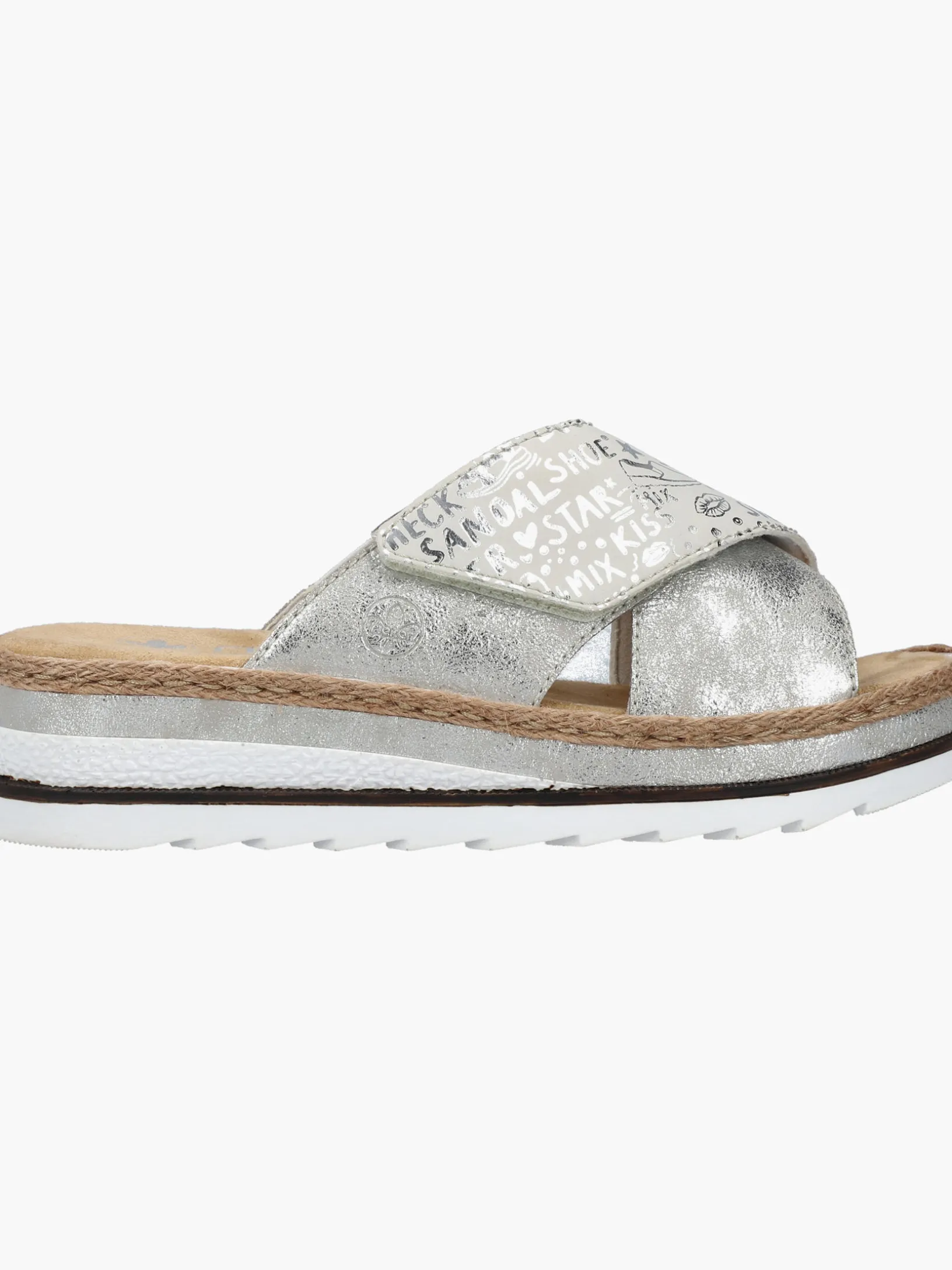 Sommer-Feeling pur! Diese silberne Rieker Pantolette für Damen möchte man gar nicht mehr ausziehen. Durch den Klettverschluss kann der Schuh ganz schnell angezogen werden. Das modische Textmuster in Silber verleiht dem Schuh das gewisse Etwas. Der offene Schuh sowie die schockabsorbierende und sehr leichte Sohle sorgen für anhaltendes Wohlgefühl. Ein weiteres Plus ist die extra weiche Decksohle. Extra-Halt ist durch die schmale Passform E 1/2 geboten. Trageluxus pur!