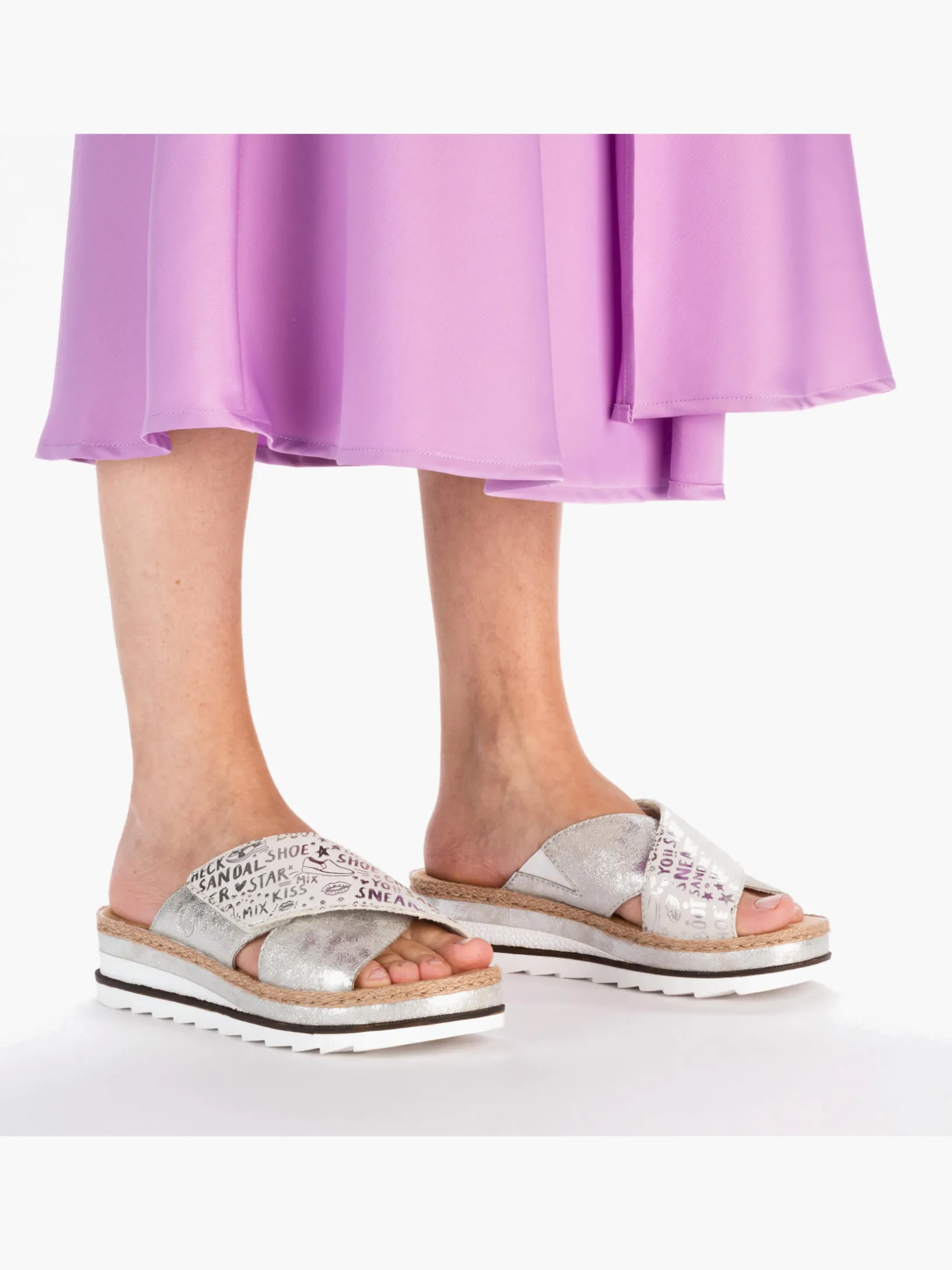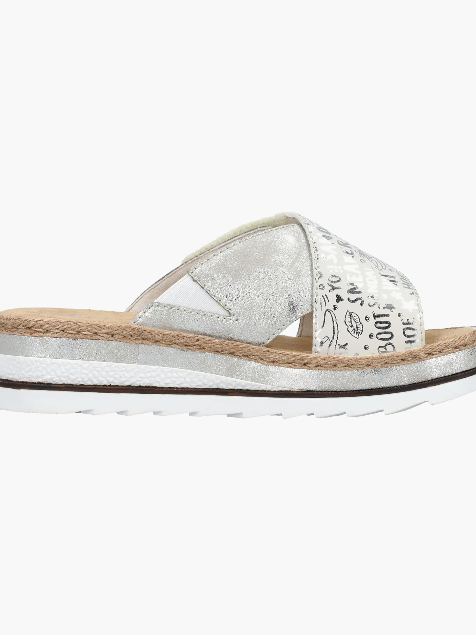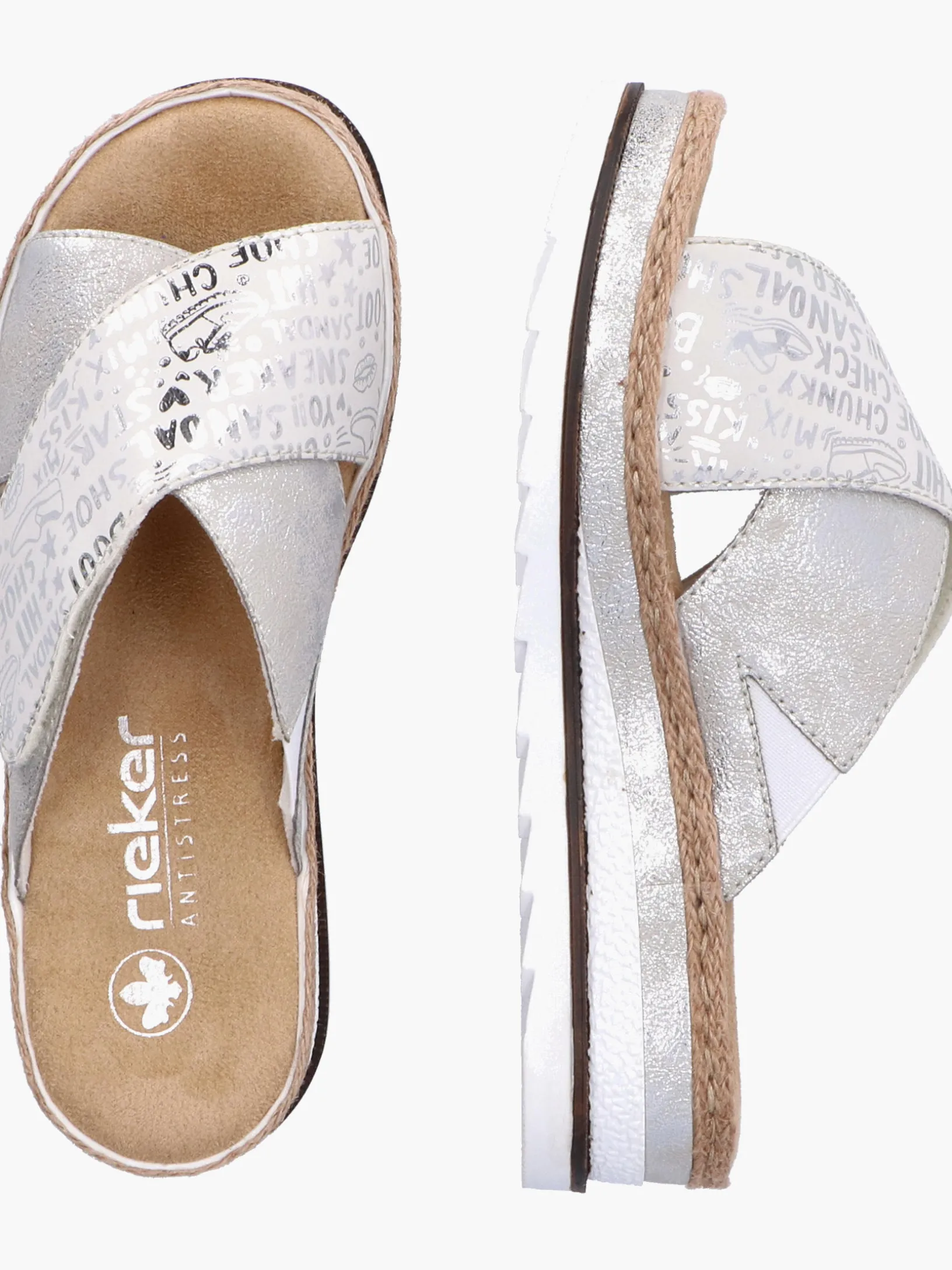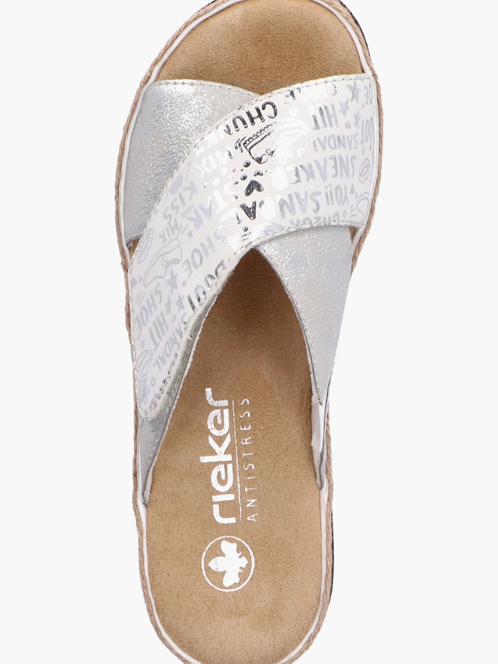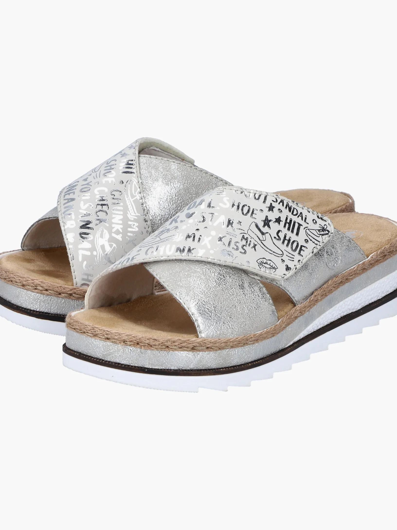 Sommer-Feeling pur! Diese silberne Rieker Pantolette für Damen möchte man gar nicht mehr ausziehen. Durch den Klettverschluss kann der Schuh ganz schnell angezogen werden. Das modische Textmuster in Silber verleiht dem Schuh das gewisse Etwas. Der offene Schuh sowie die schockabsorbierende und sehr leichte Sohle sorgen für anhaltendes Wohlgefühl. Ein weiteres Plus ist die extra weiche Decksohle. Extra-Halt ist durch die schmale Passform E 1/2 geboten. Trageluxus pur!