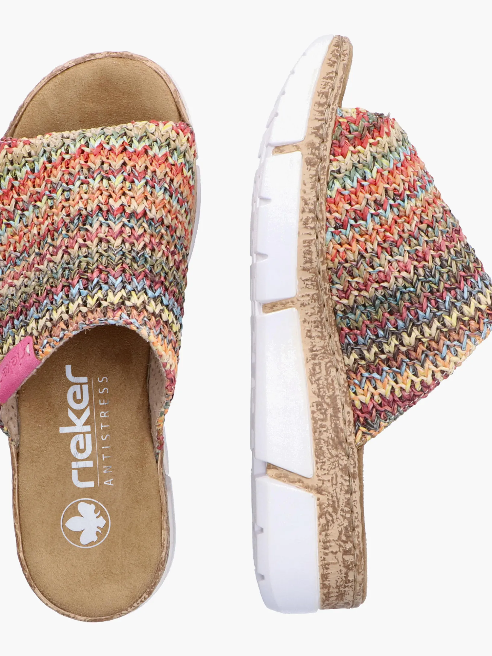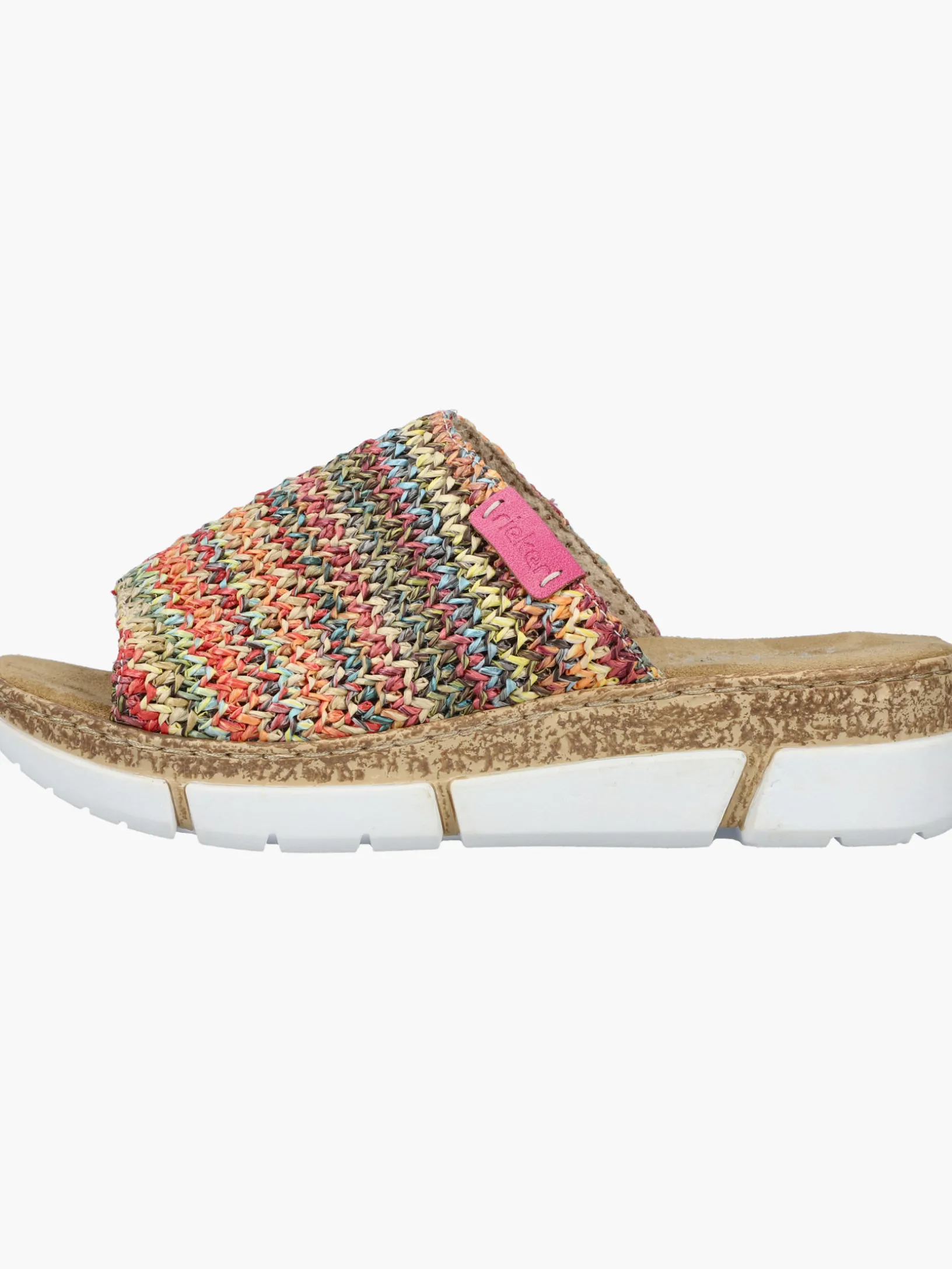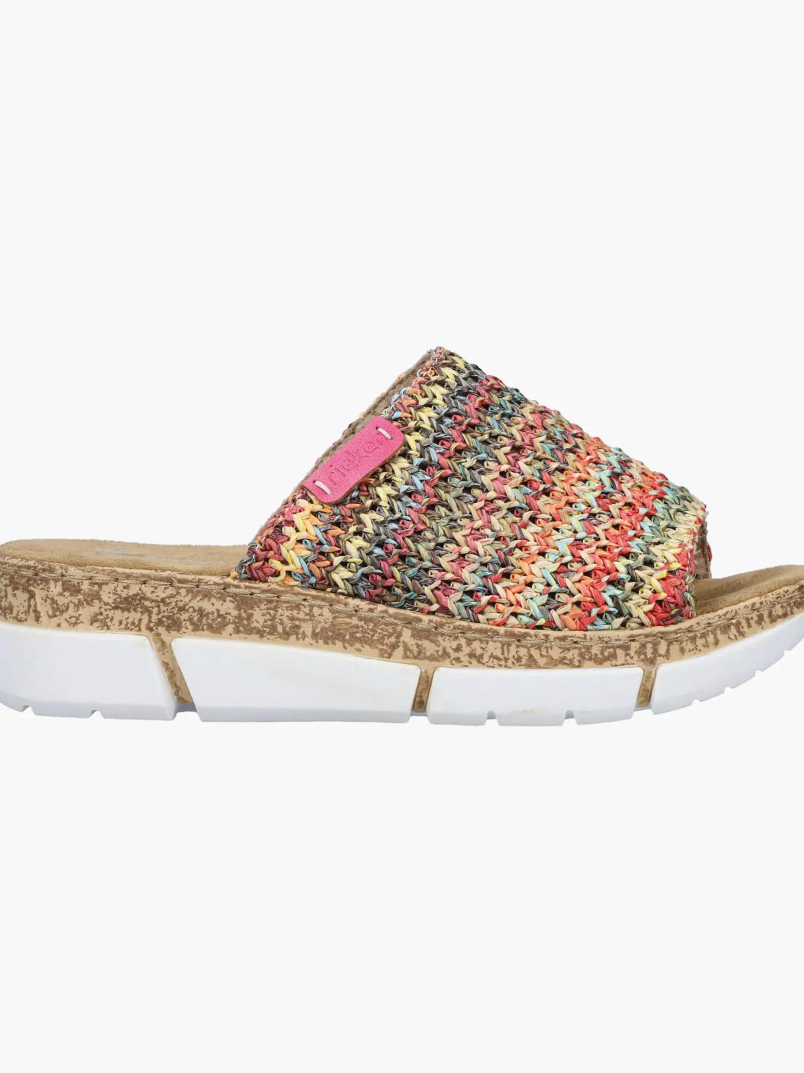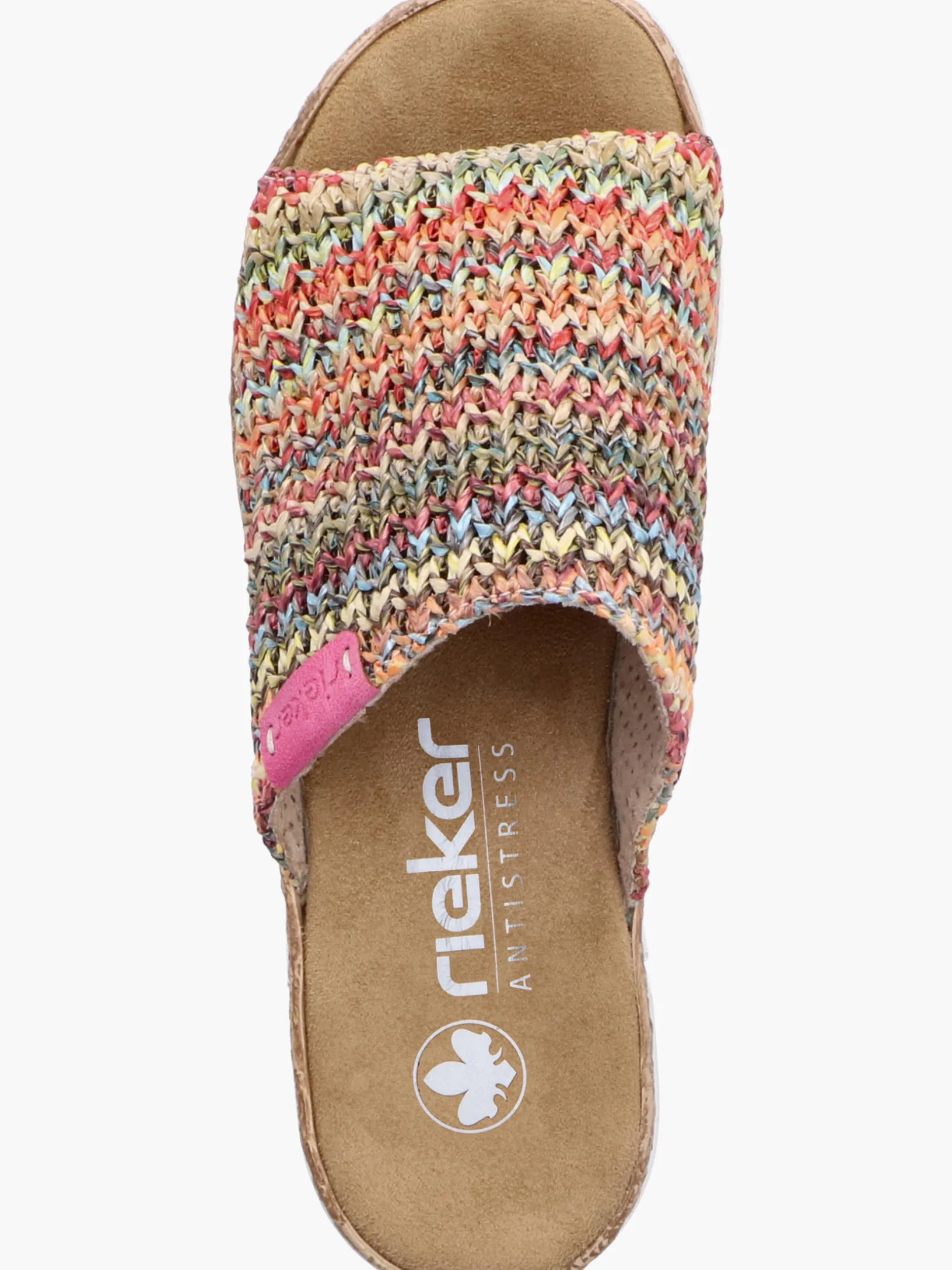Maximaler Komfort auf Schritt und Tritt! Diese bunte Rieker Pantolette für Damen möchte man gar nicht mehr ausziehen. Der Schuh kann ohne Verschluss ganz einfach durch Hineinschlüpfen angezogen werden. Die mehrfarbigen Nähte auf dem Riemen setzen frische Akzente. Der offene Schuh sowie die leichte und schockabsorbierende Plateausohle sorgen für anhaltendes Wohlgefühl. Ein weiteres Plus ist die extra weiche Decksohle. Durch die schmale Passform E 1/2 sitzt der Schuh wie angegossen. Damit wird die warme Saison noch toller!