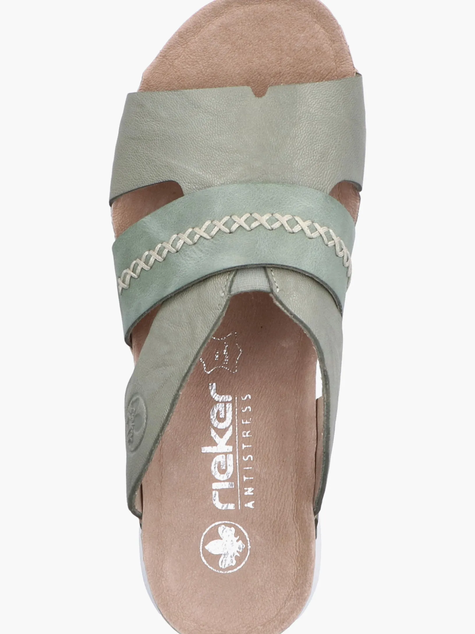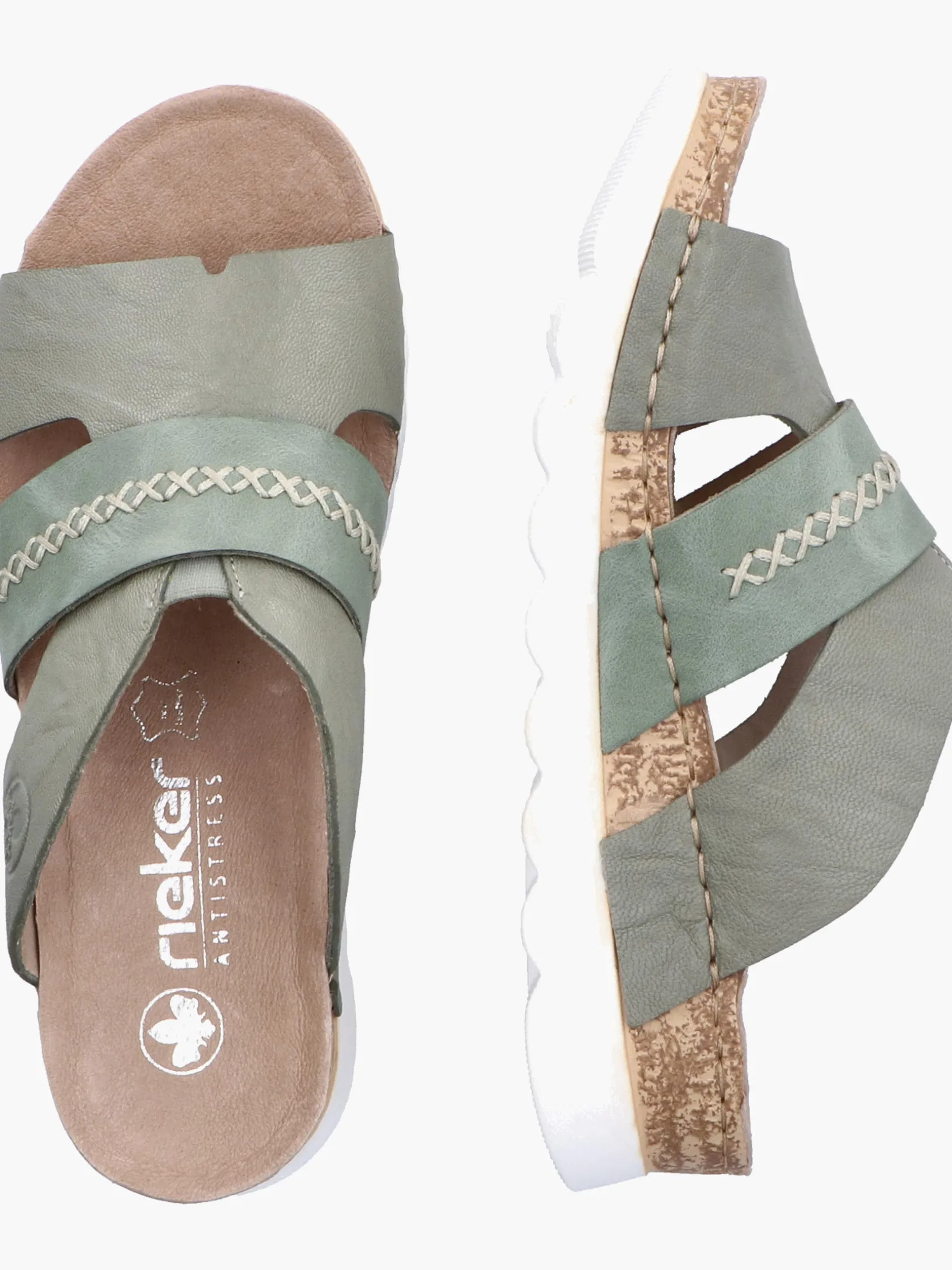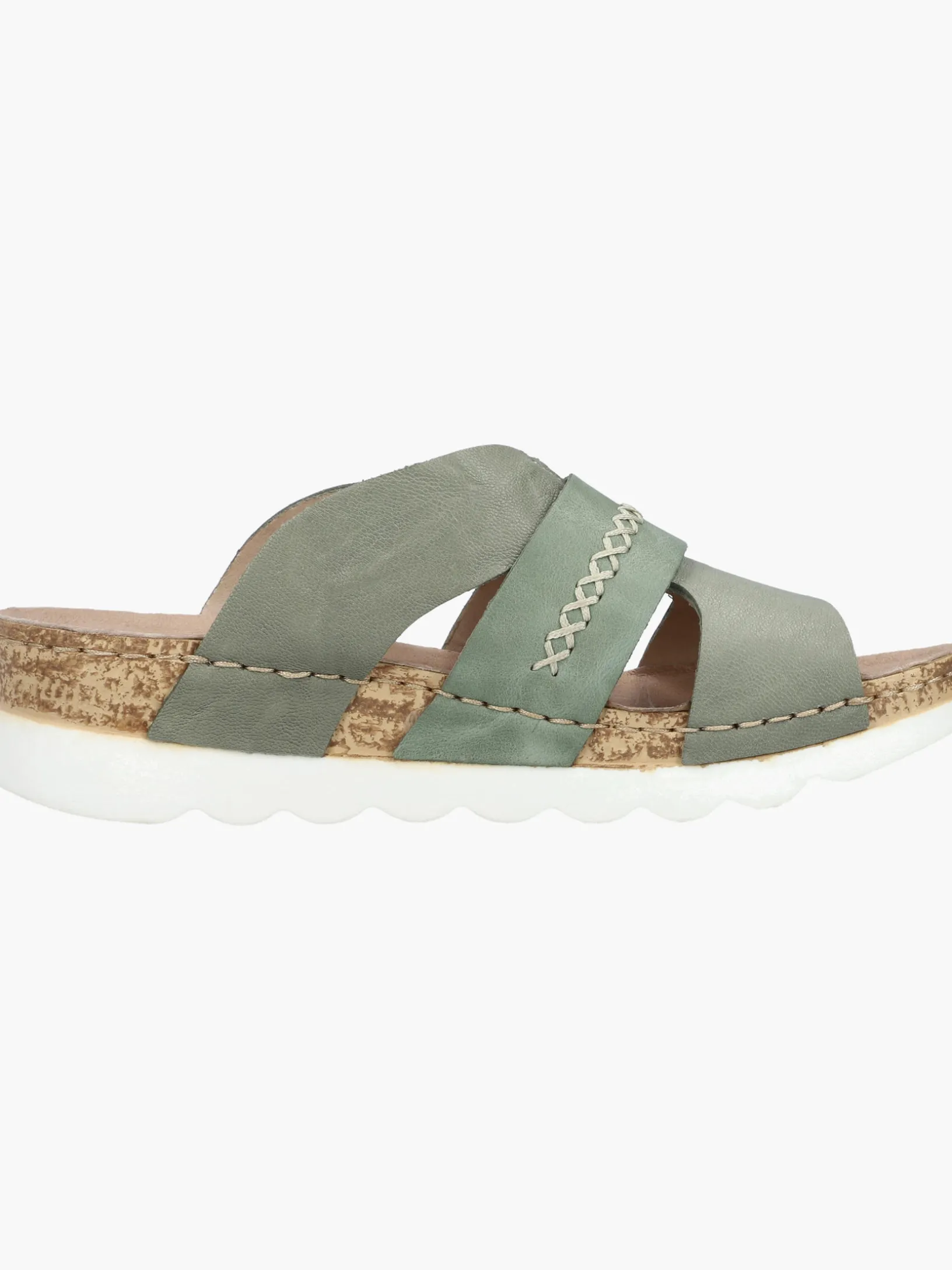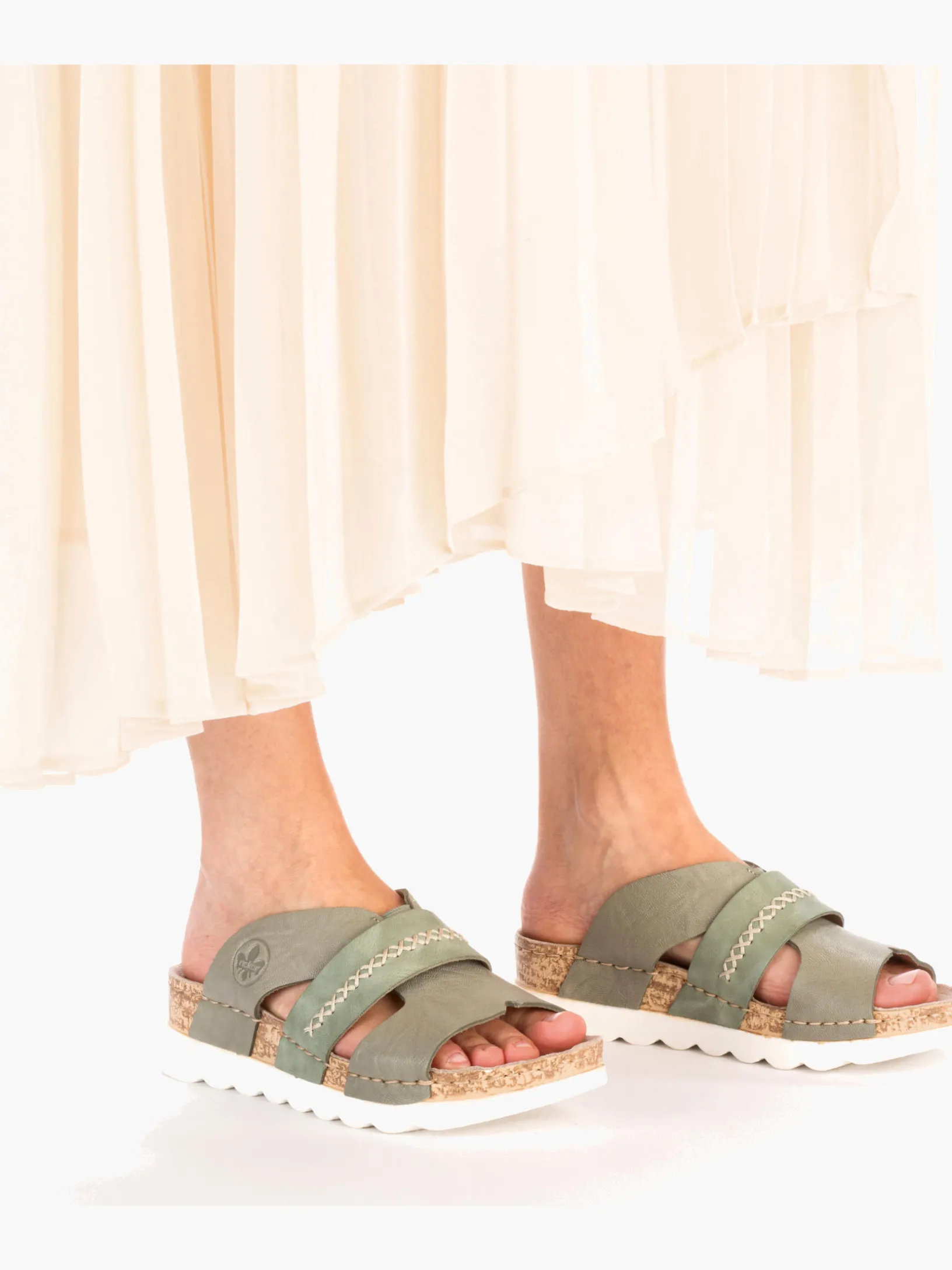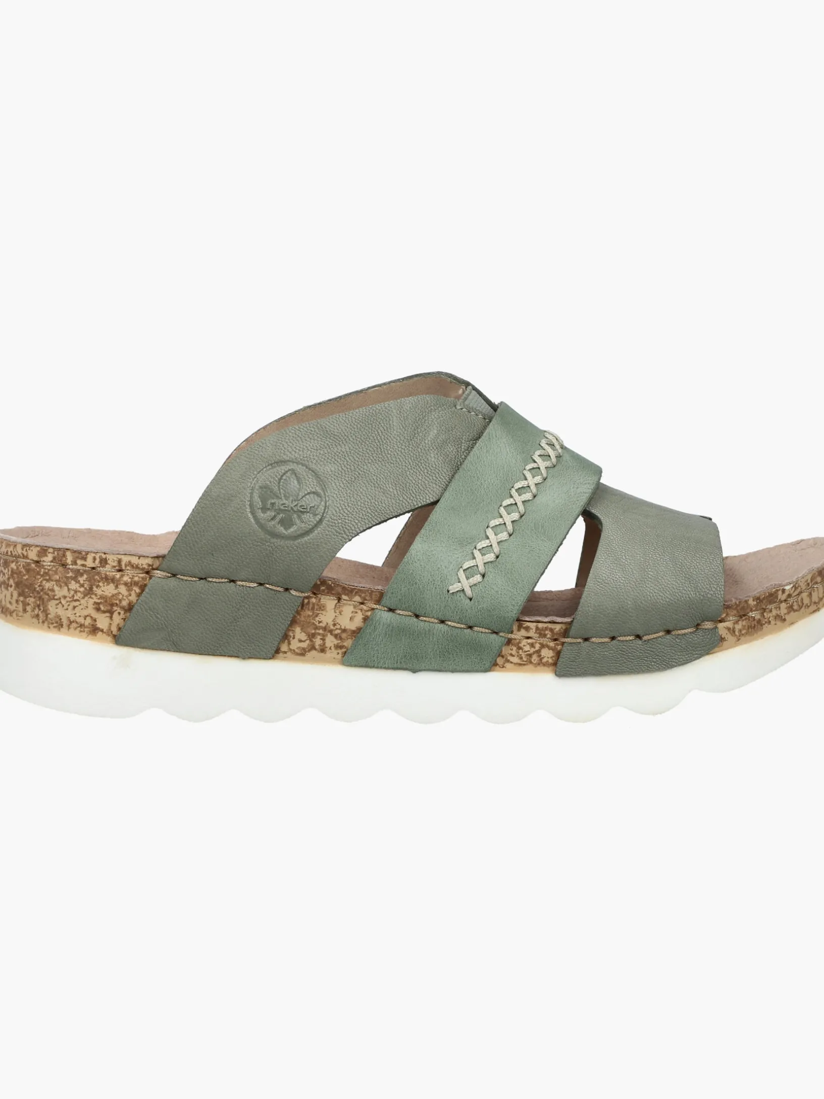 Easy walking, easy living! Diese lässigen grüngrauen Rieker Pantoletten für Damen aus Glattleder sind gemütliche Begleiter auf all deinen Wegen. Der Schuh kann ohne Verschluss ganz einfach durch Hineinschlüpfen angezogen werden. Die groben Ziernähte runden das moderne Design perfekt ab. Die schockabsorbierende und leichte Sohle der Pantoletten bietet besten Gehkomfort. So machen die warmen Tage Spaß!