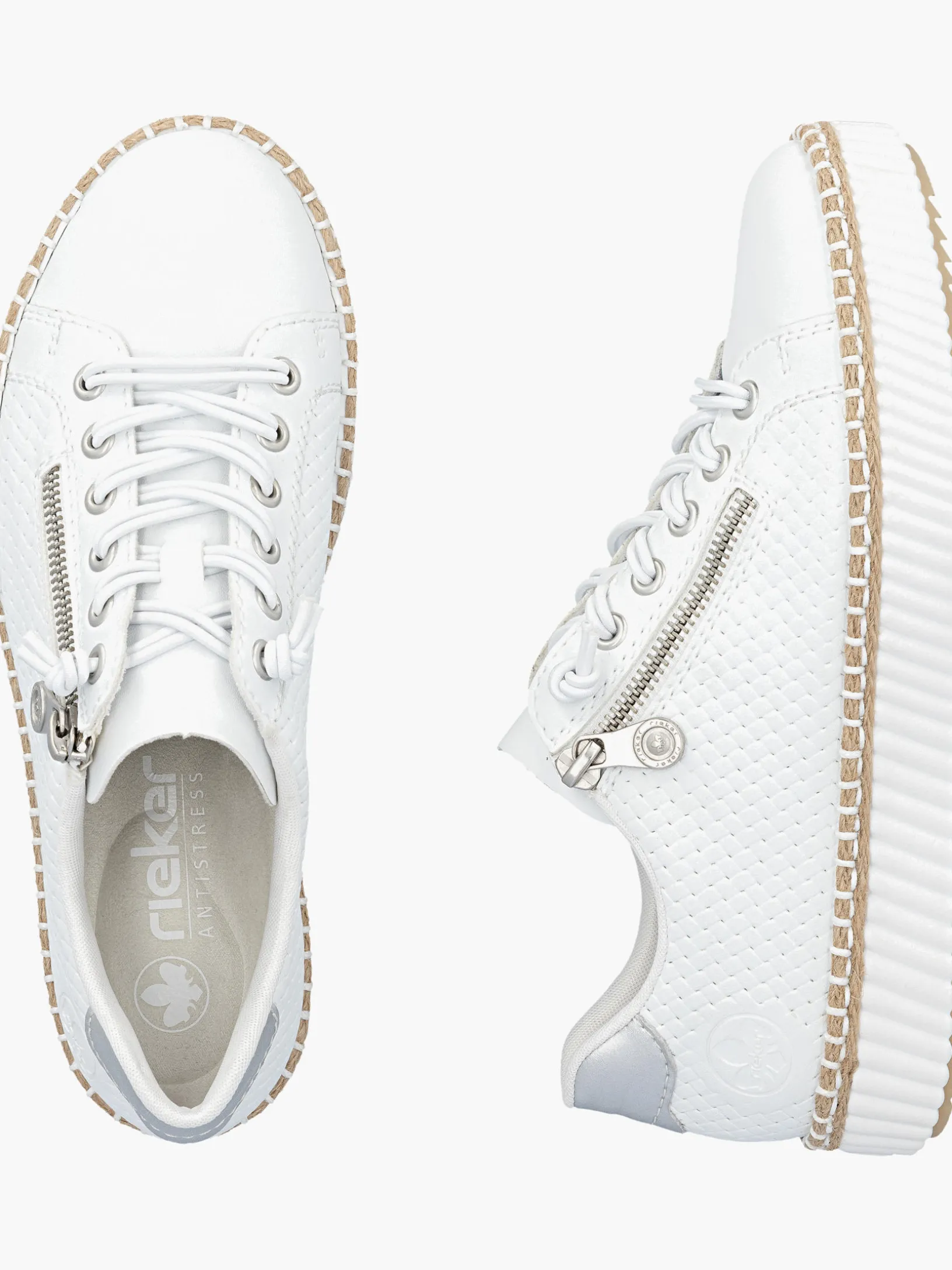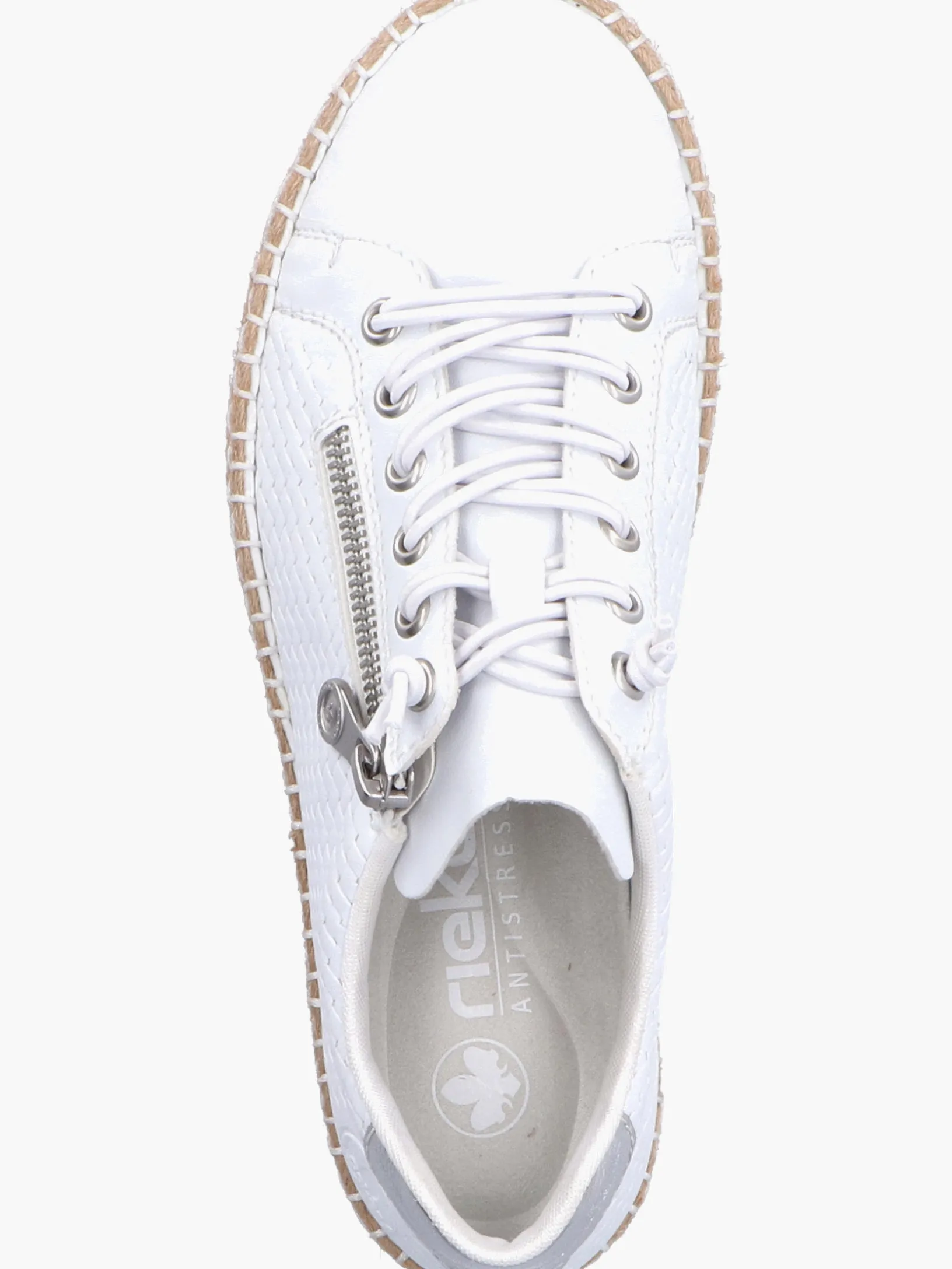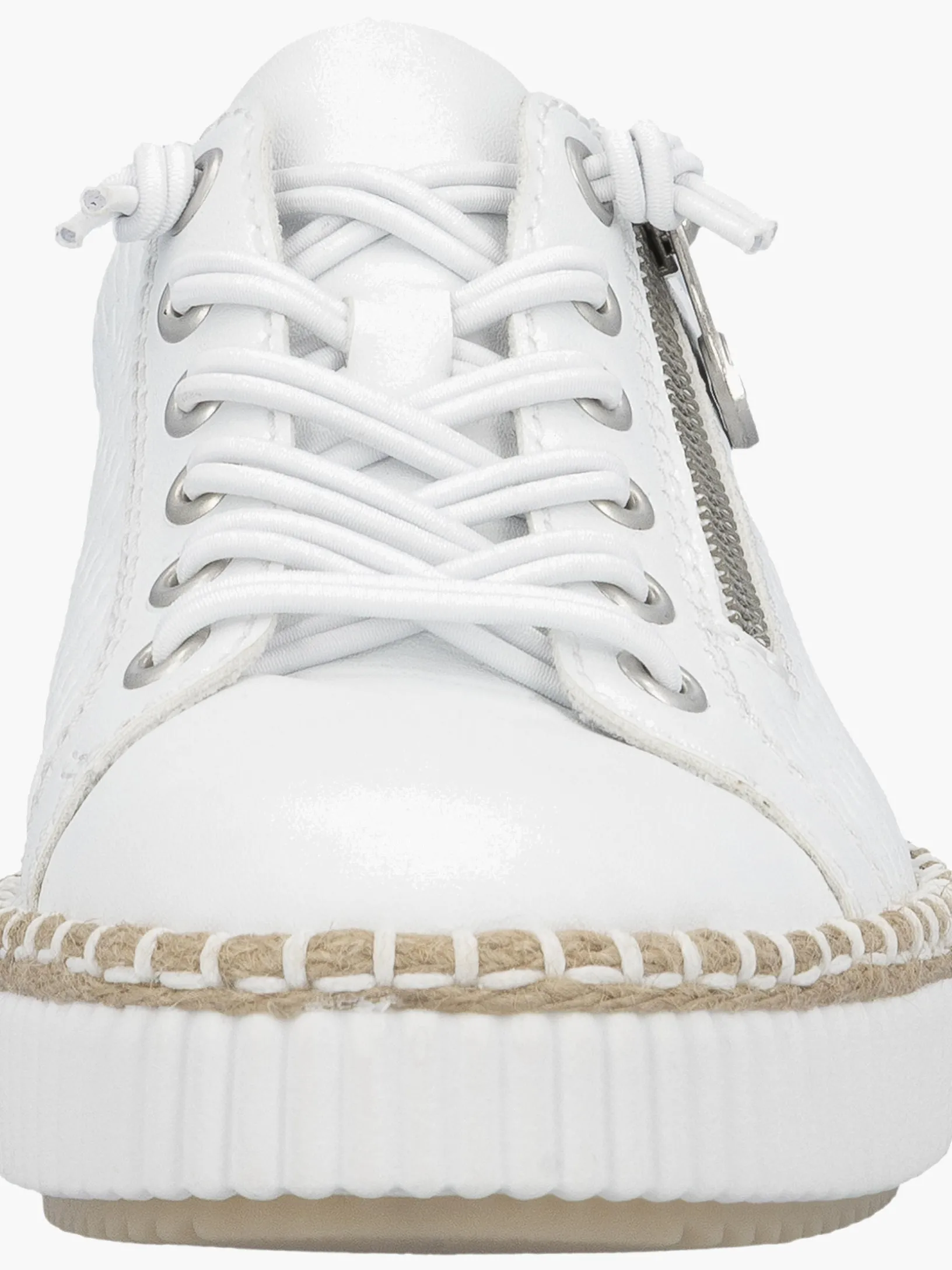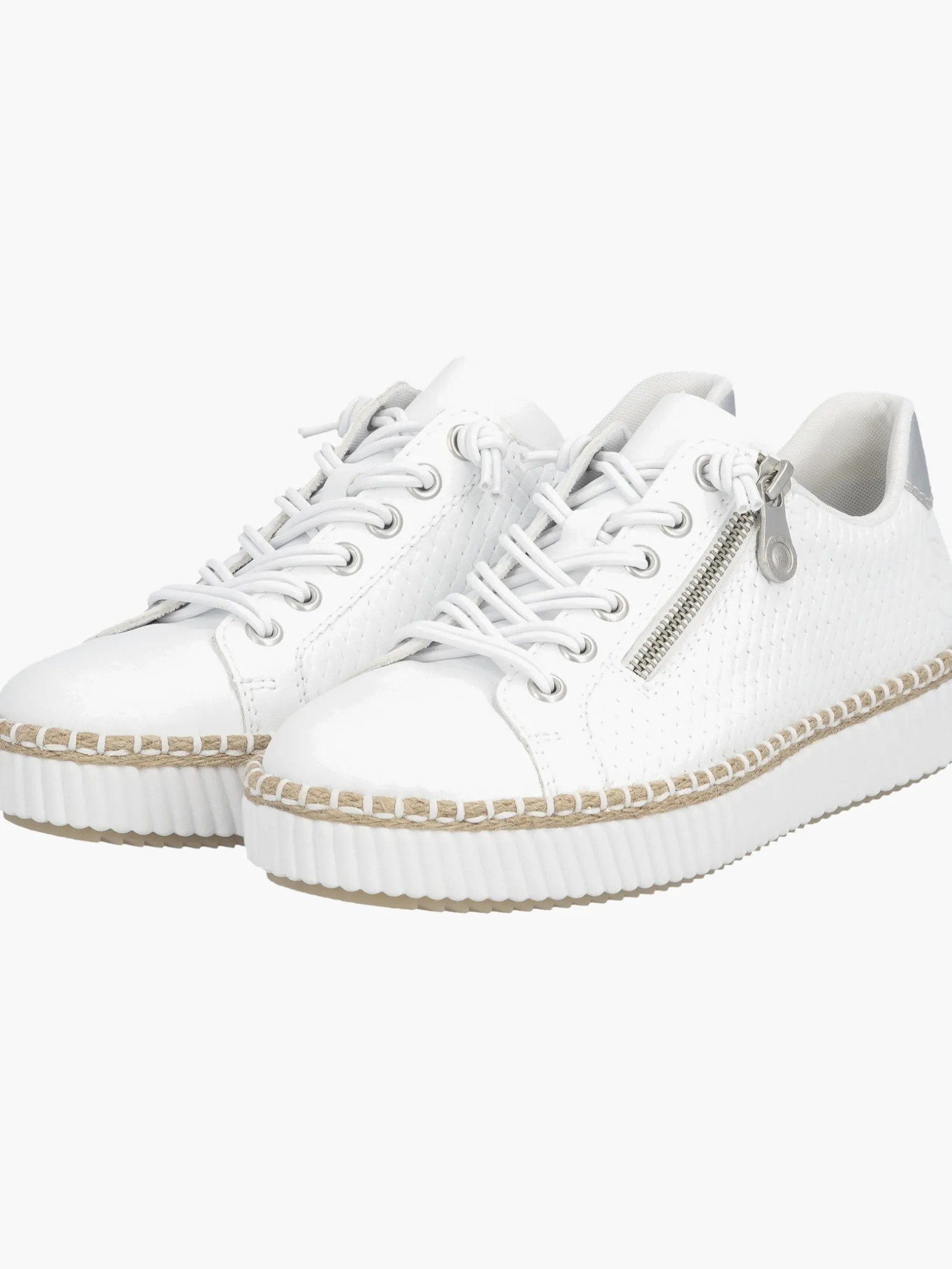 Fashion meets Function. Mit diesem alltagstauglichen schneeweißen Rieker Slipper für Damen bist du immer gut angezogen und kannst dich auf maximalen Komfort verlassen. Trotz Schnürung kann der Schuh ganz einfach mit einem Reißverschluss geschlossen werden. Die griffige Sohle gibt guten Halt auf Schritt und Tritt. Die gepolsterte und herausnehmbare Einlegesohle bietet Komfort und Funktionalität für jeden Tag. Da steht langen Spaziergängen nichts mehr im Weg!