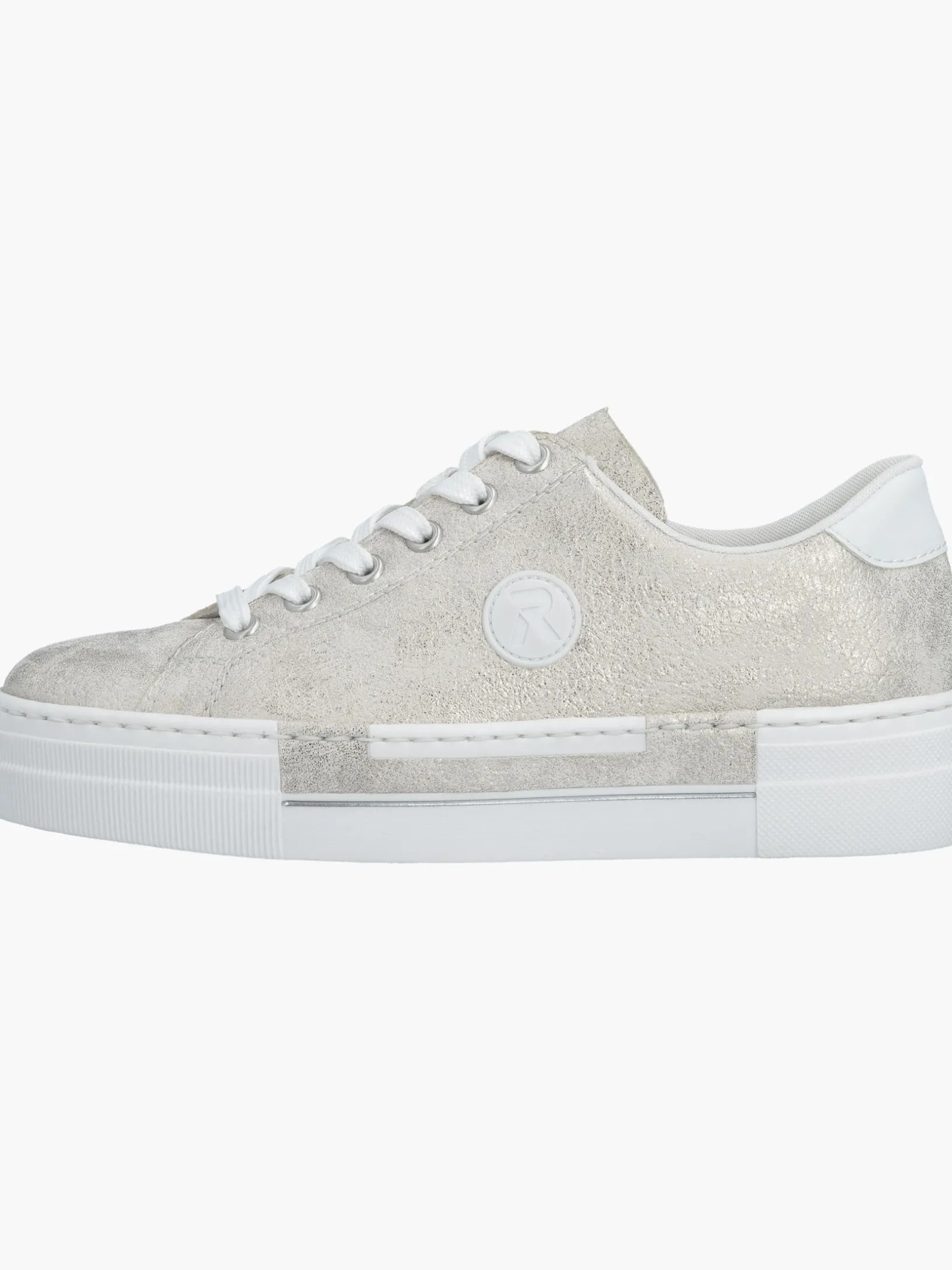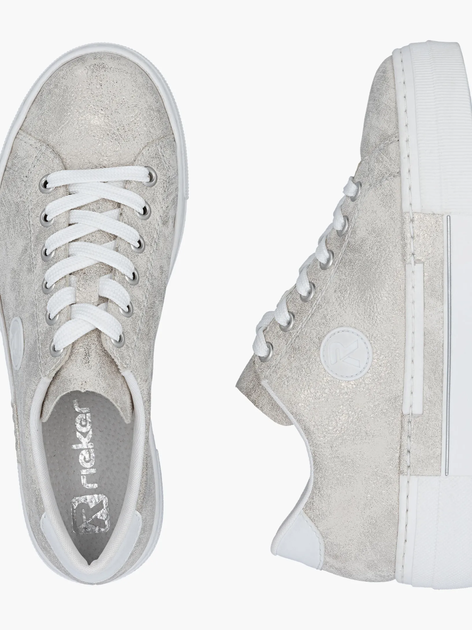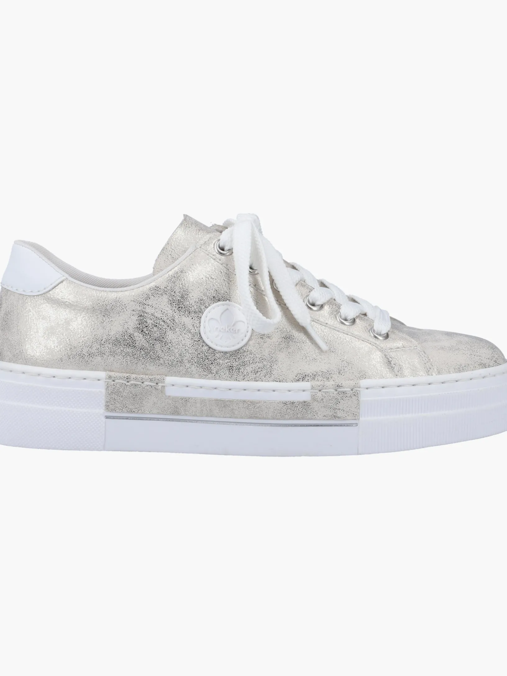 Einmal Sneaker, immer Sneaker. Diese silbernen Rieker Sneaker für Damen sehen nicht nur stylisch aus, sondern sorgen dank ihrer Qualität auch für den gewissen Komfort im Alltag. Zudem sorgt die weiße Schnürung für eine optimale Fußanpassung. Das geprägte Logo an der Seite ist ein schöner Eyecatcher. Die schockabsorbierende und sehr leichte Plateausohle bietet anhaltendes Wohlgefühl ‒ auch an langen Tagen. Darüber hinaus ist die Decksohle extra weich. Gesucht, gefunden!