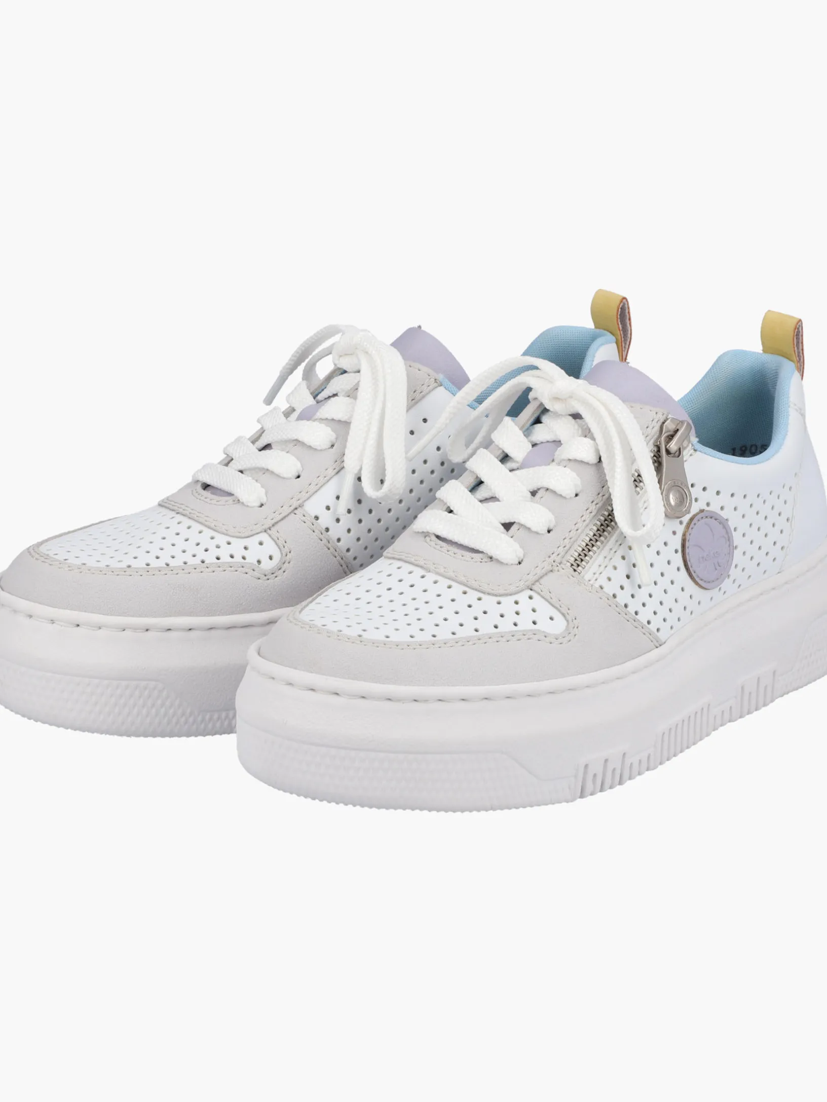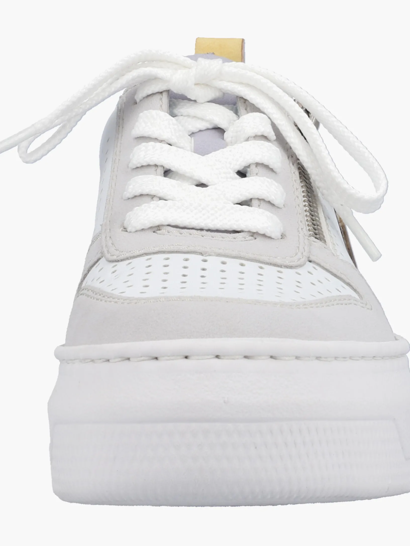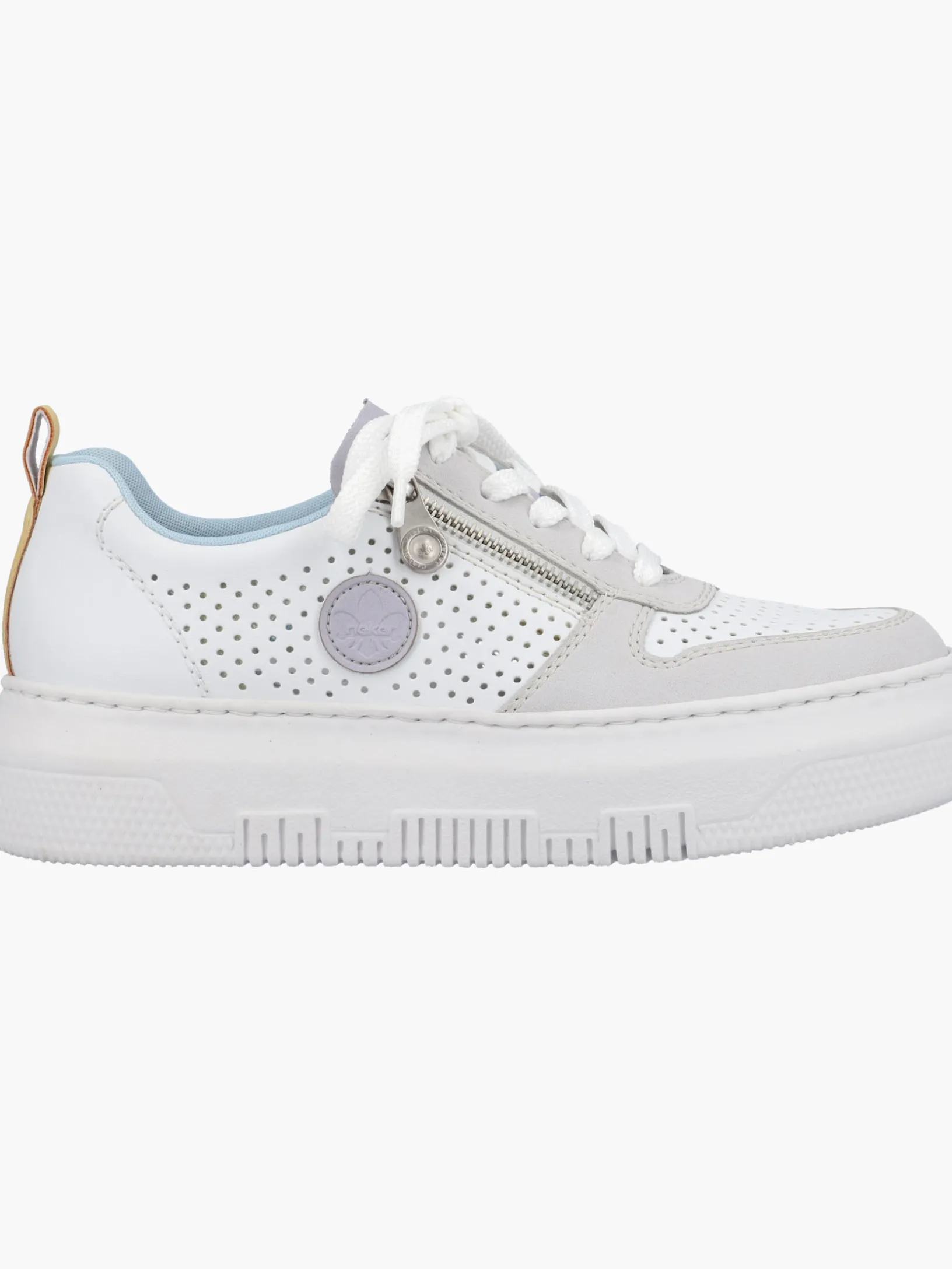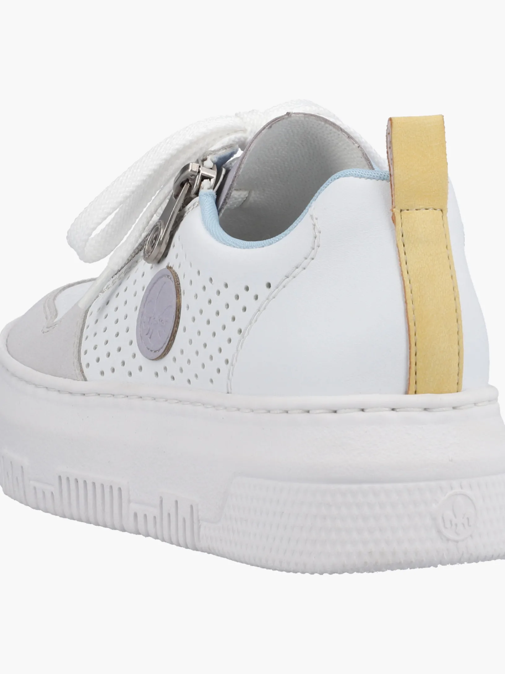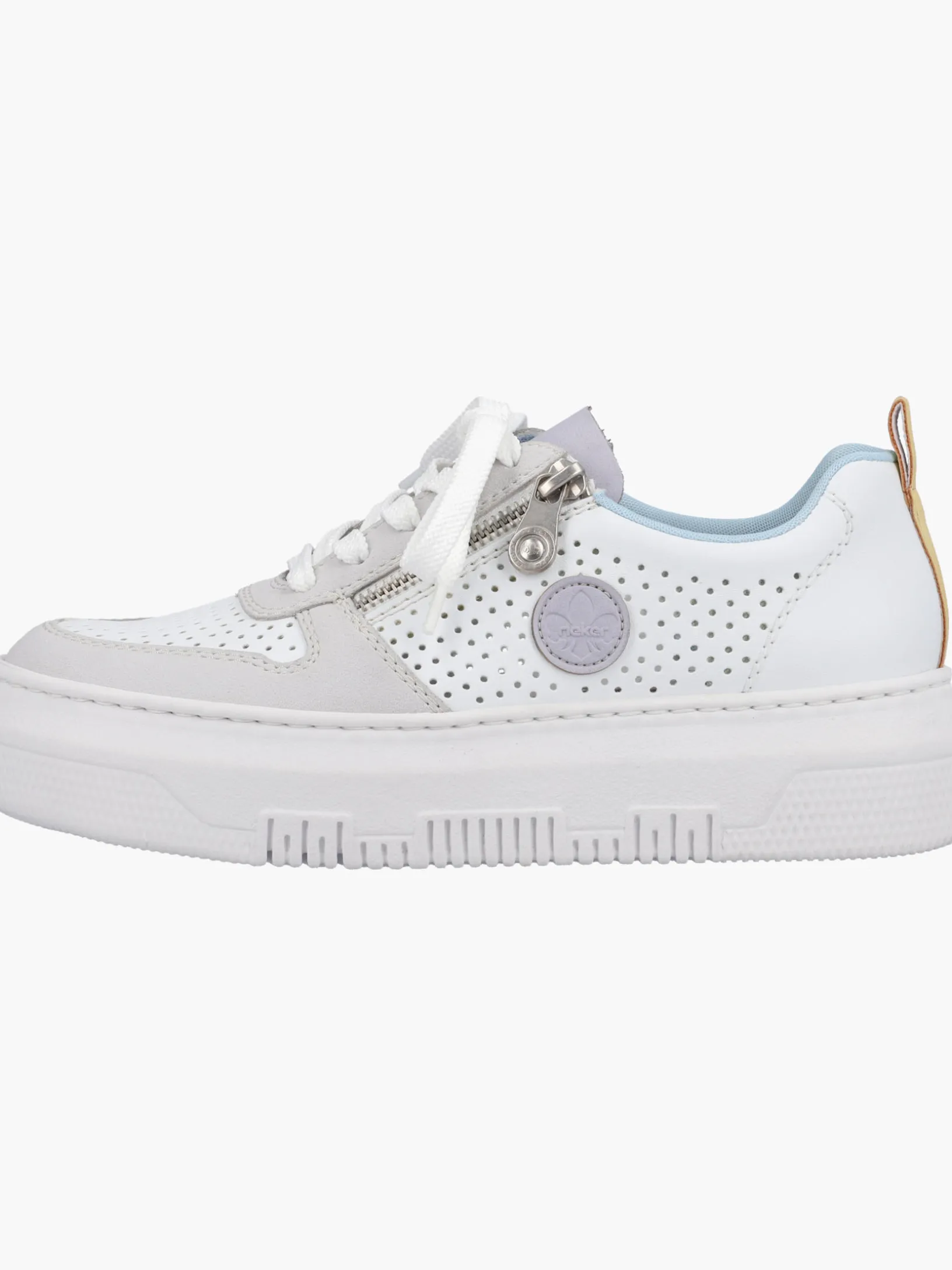 Jetzt wirds sportlich. Diese edelweißen Rieker Sneaker für Damen überzeugen mit echtem Komfort für die Füße. Die clevere Kombination aus Reißverschluss und Schnürung ermöglicht ein einfaches An- und Ausziehen. Das geprägte Logo an der Seite ist ein hübsches Detail. Die flexible und ultra leichte Plateausohle bietet besten Laufkomfort und die Decksohle ist extra weich. Wohlge(h)fühl inklusive!