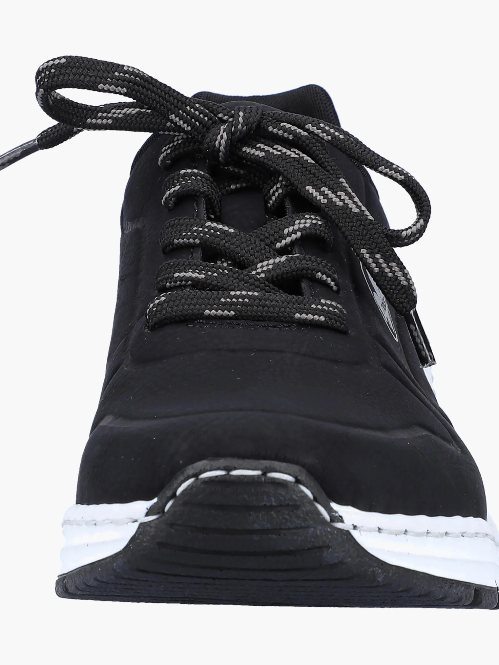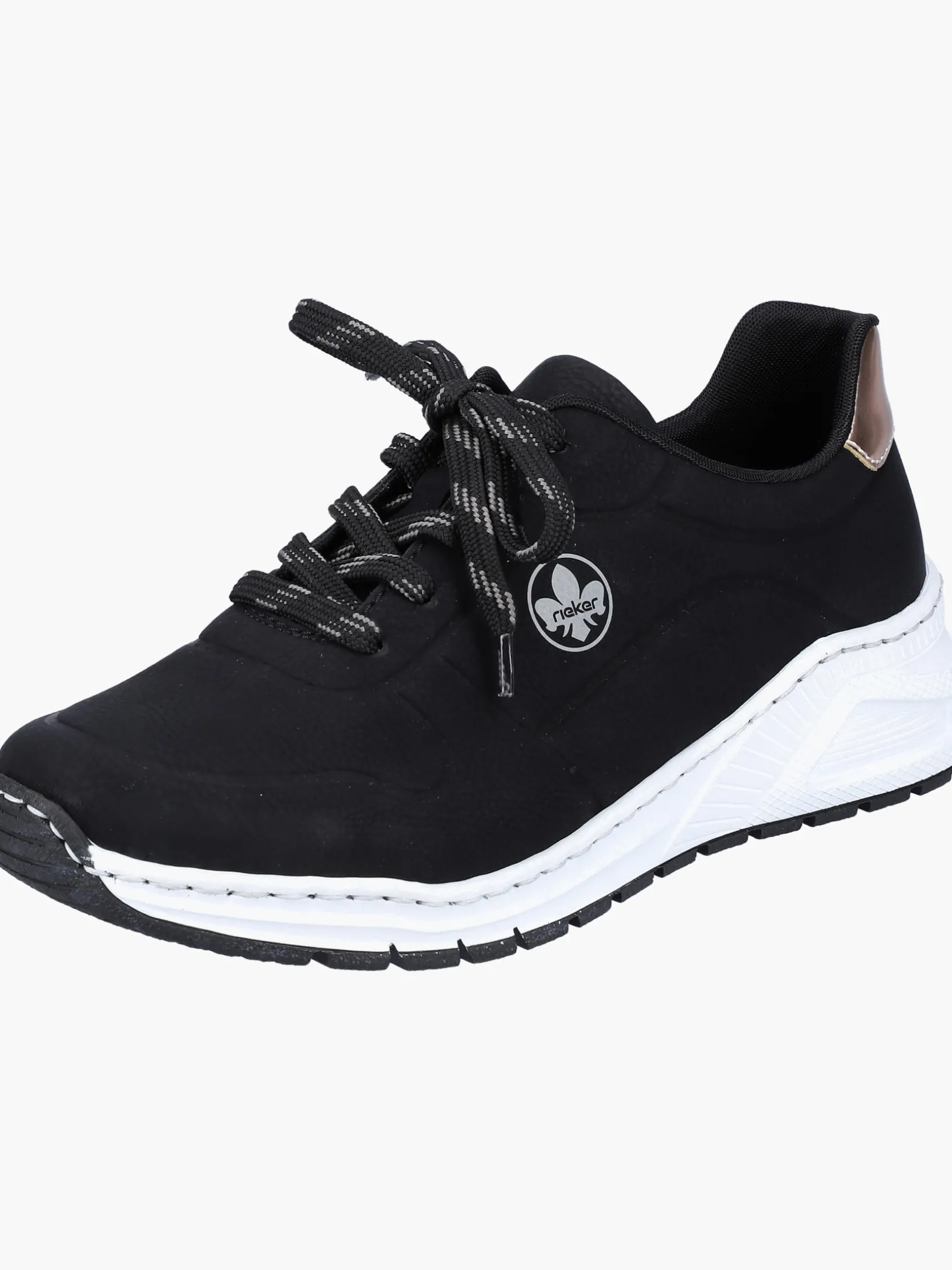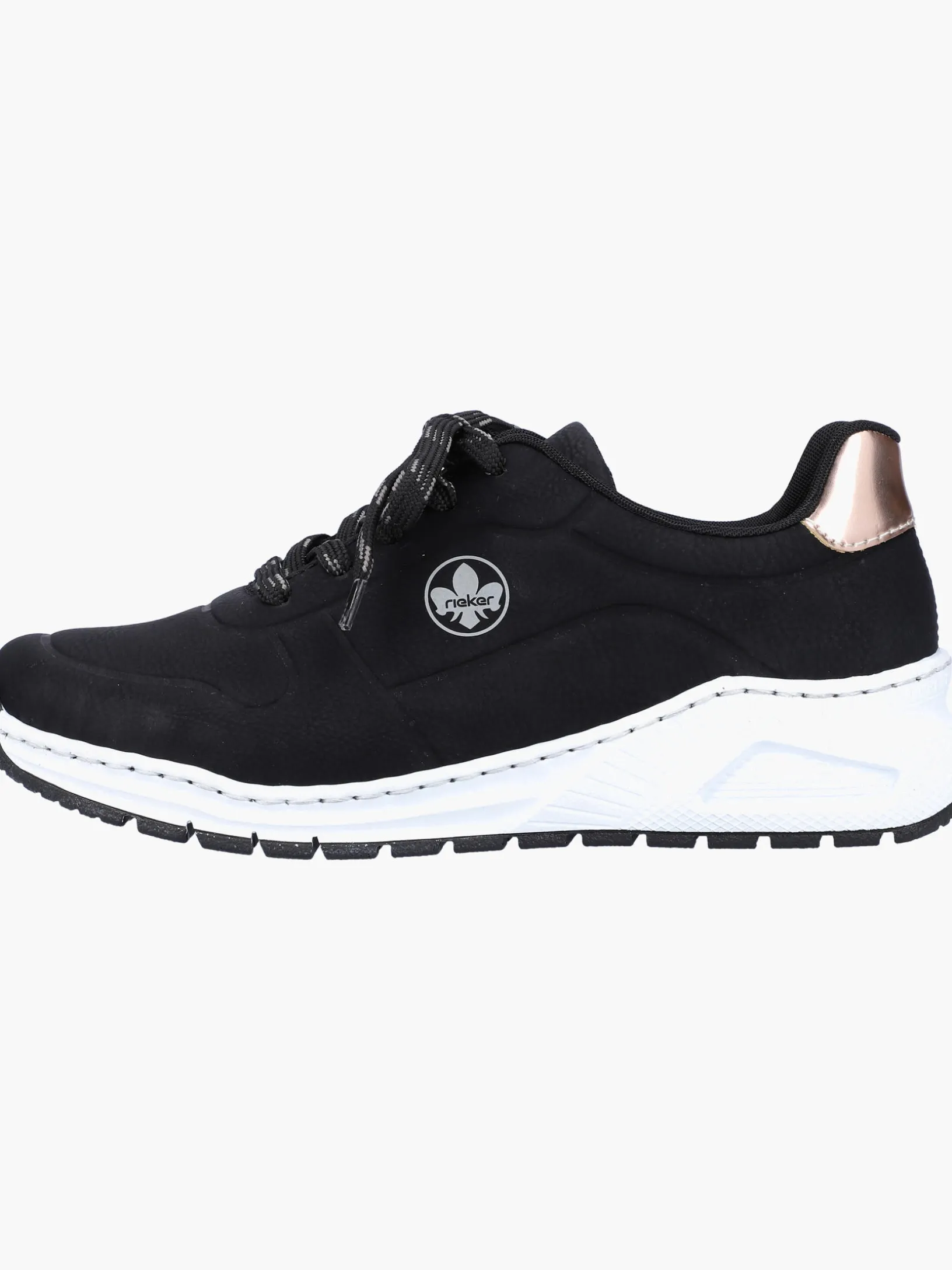 Einmal Sneaker, immer Sneaker. Mit diesem alltagstauglichen nachtschwarzen Rieker Sneaker für Damen bist du immer gut angezogen und kannst dich auf maximalen Komfort verlassen. Die grau-schwarze Schnürung sorgt dafür, dass der Schuh stets gut sitzt. Der gestickte Logo an der Seite sorgt für das gewisse Etwas. Mit der schockabsorbierenden und leichten Sohle werden deine Füße bei jedem Schritt verwöhnt. Der Schuh verfügt über eine gepolsterte und herausnehmbare Einlegesohle, die ein bestechendes Komfort-Feature ist. Das Modell ist in Extraweite H geschnitten und sichert dem Fuß genügend Freiraum. Wohlge(h)fühl inklusive!