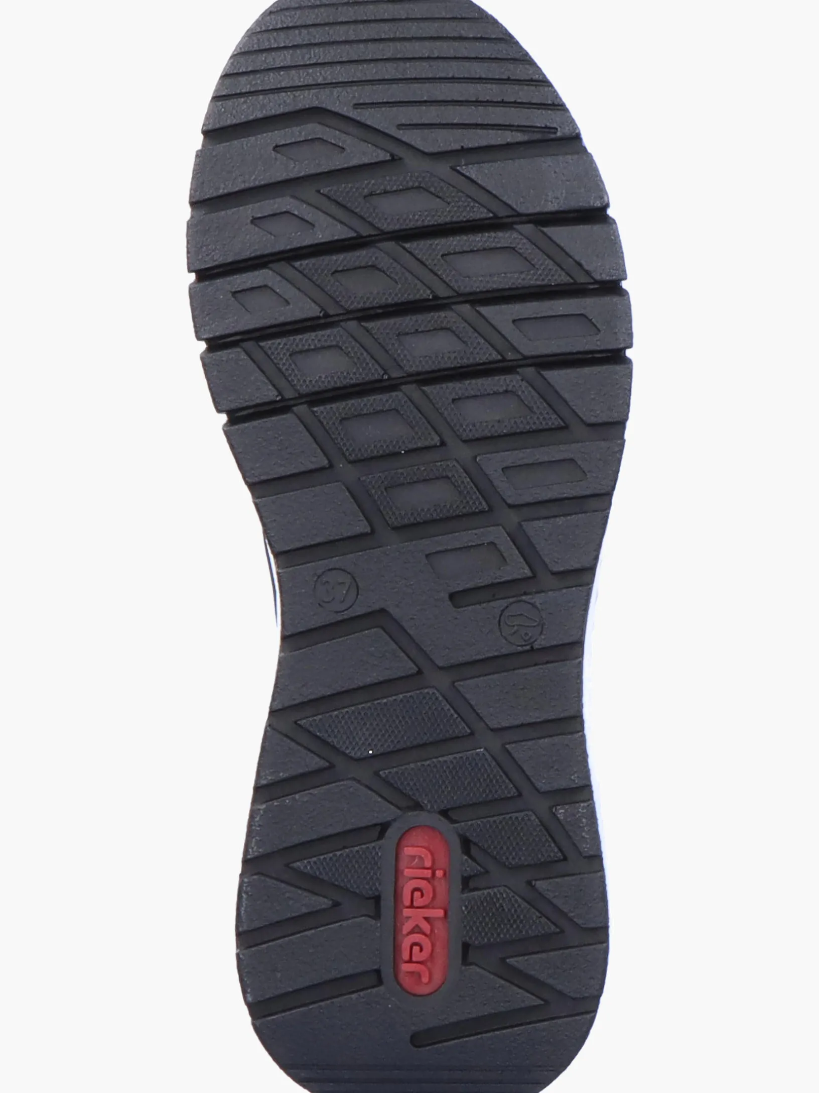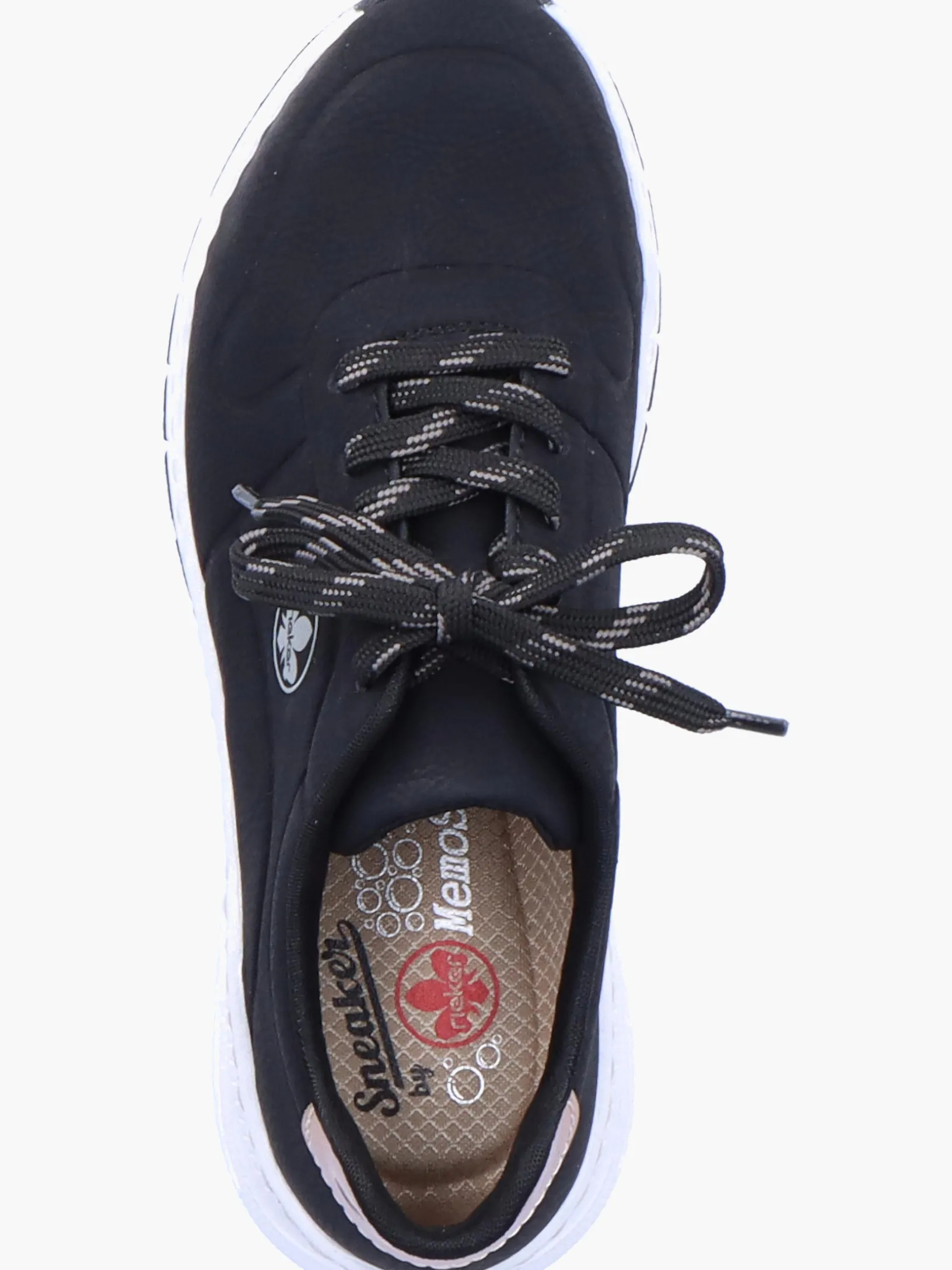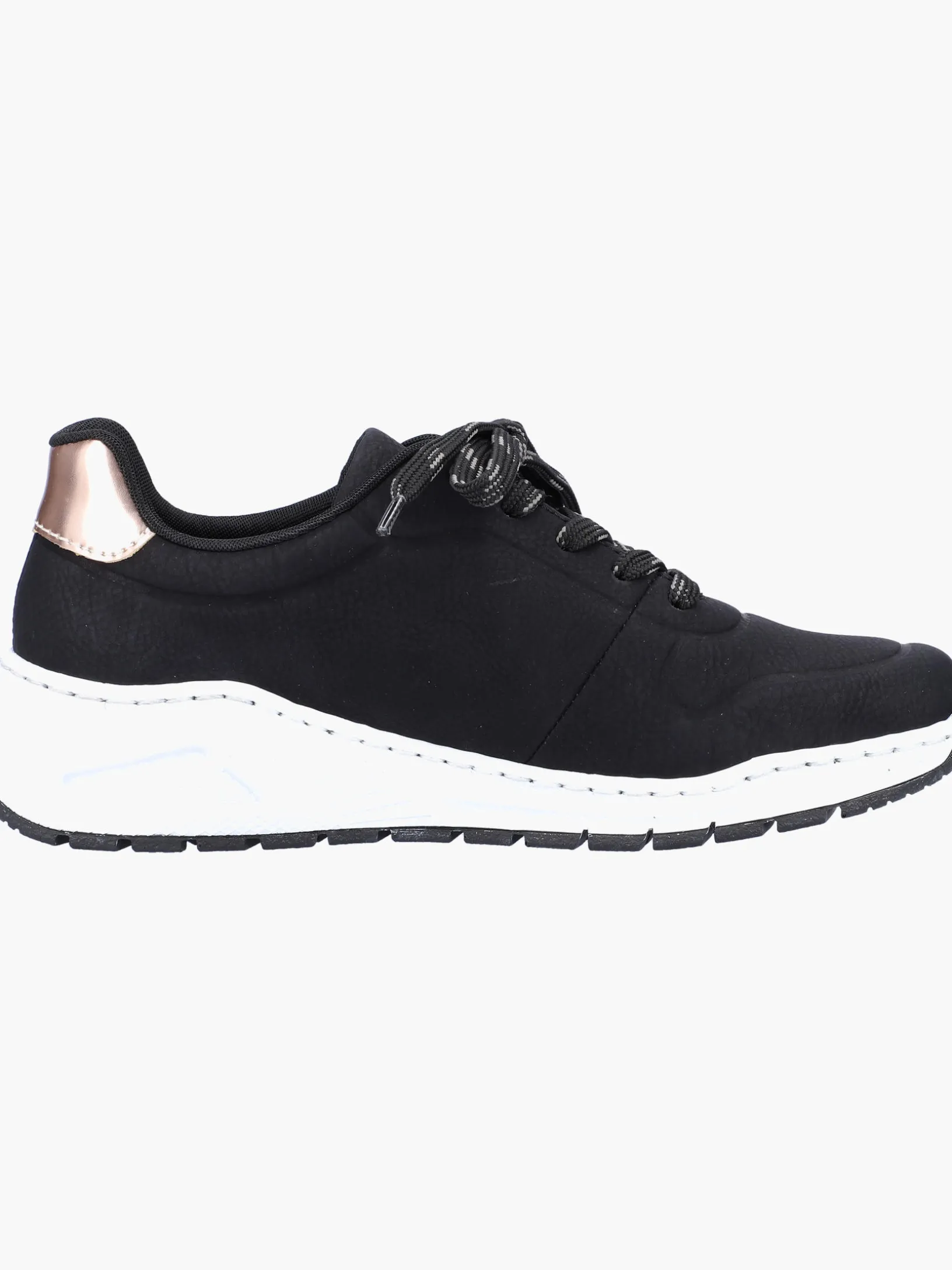 Einmal Sneaker, immer Sneaker. Mit diesem alltagstauglichen nachtschwarzen Rieker Sneaker für Damen bist du immer gut angezogen und kannst dich auf maximalen Komfort verlassen. Die grau-schwarze Schnürung sorgt dafür, dass der Schuh stets gut sitzt. Der gestickte Logo an der Seite sorgt für das gewisse Etwas. Mit der schockabsorbierenden und leichten Sohle werden deine Füße bei jedem Schritt verwöhnt. Der Schuh verfügt über eine gepolsterte und herausnehmbare Einlegesohle, die ein bestechendes Komfort-Feature ist. Das Modell ist in Extraweite H geschnitten und sichert dem Fuß genügend Freiraum. Wohlge(h)fühl inklusive!