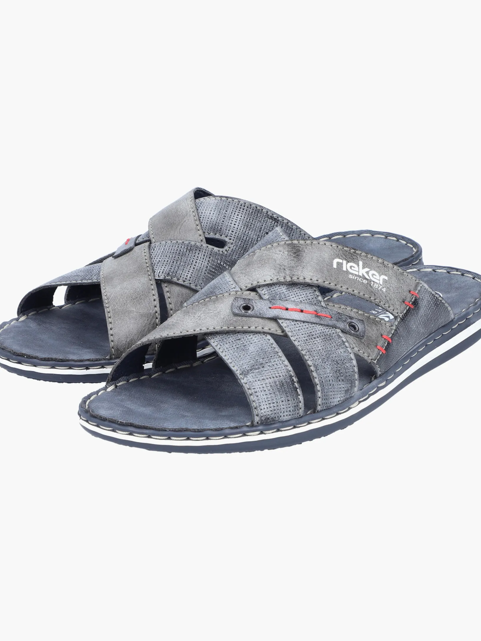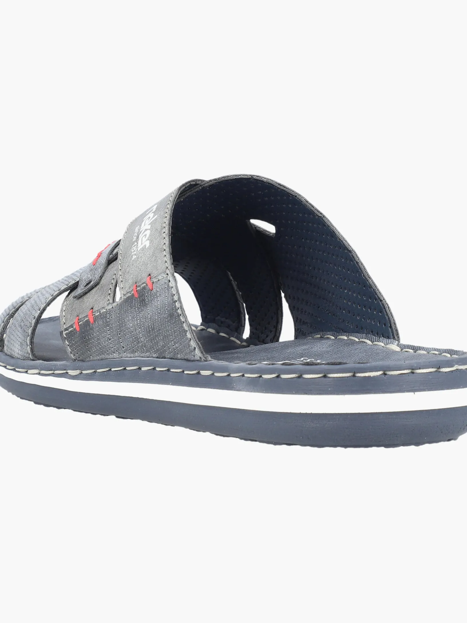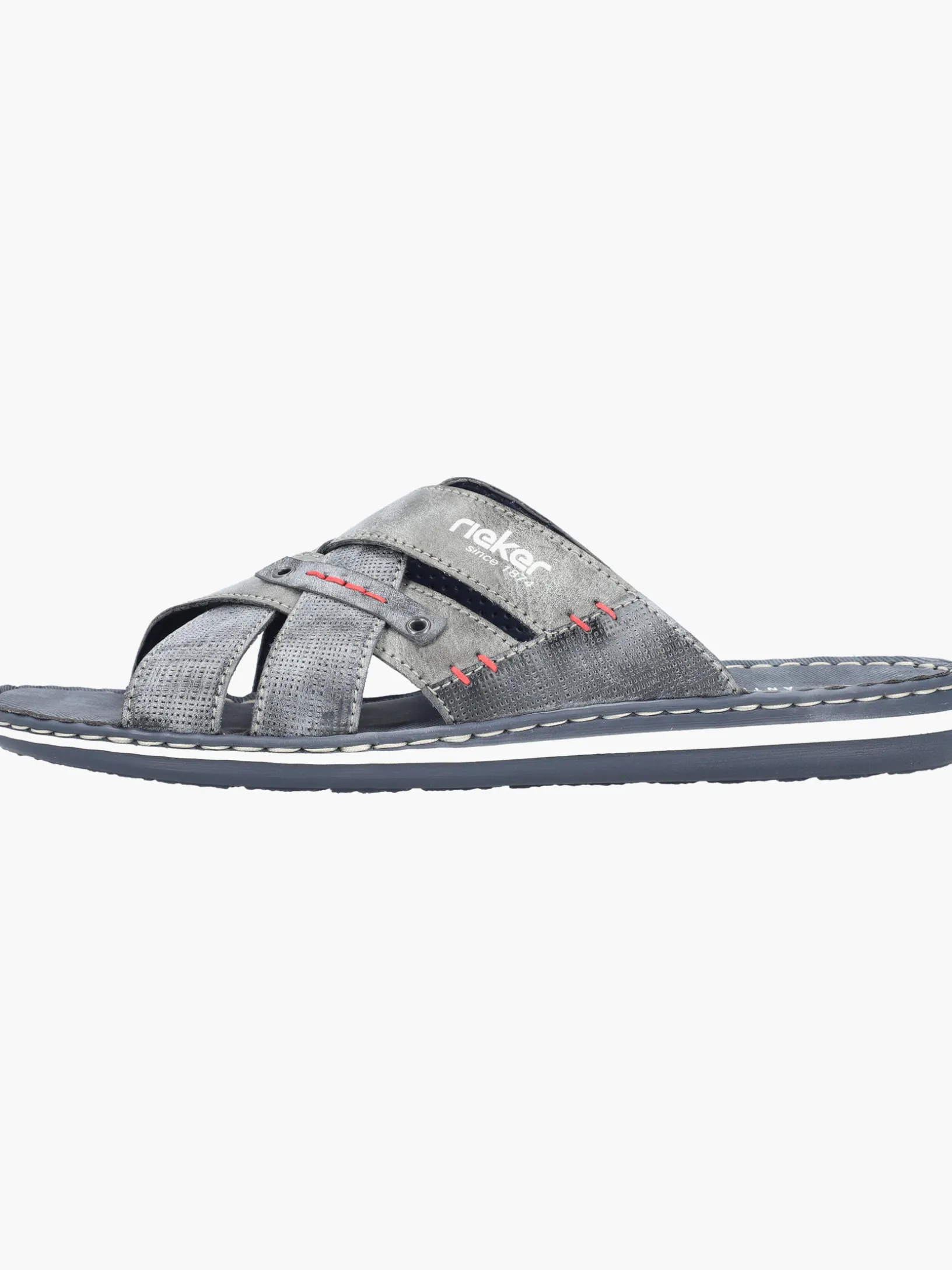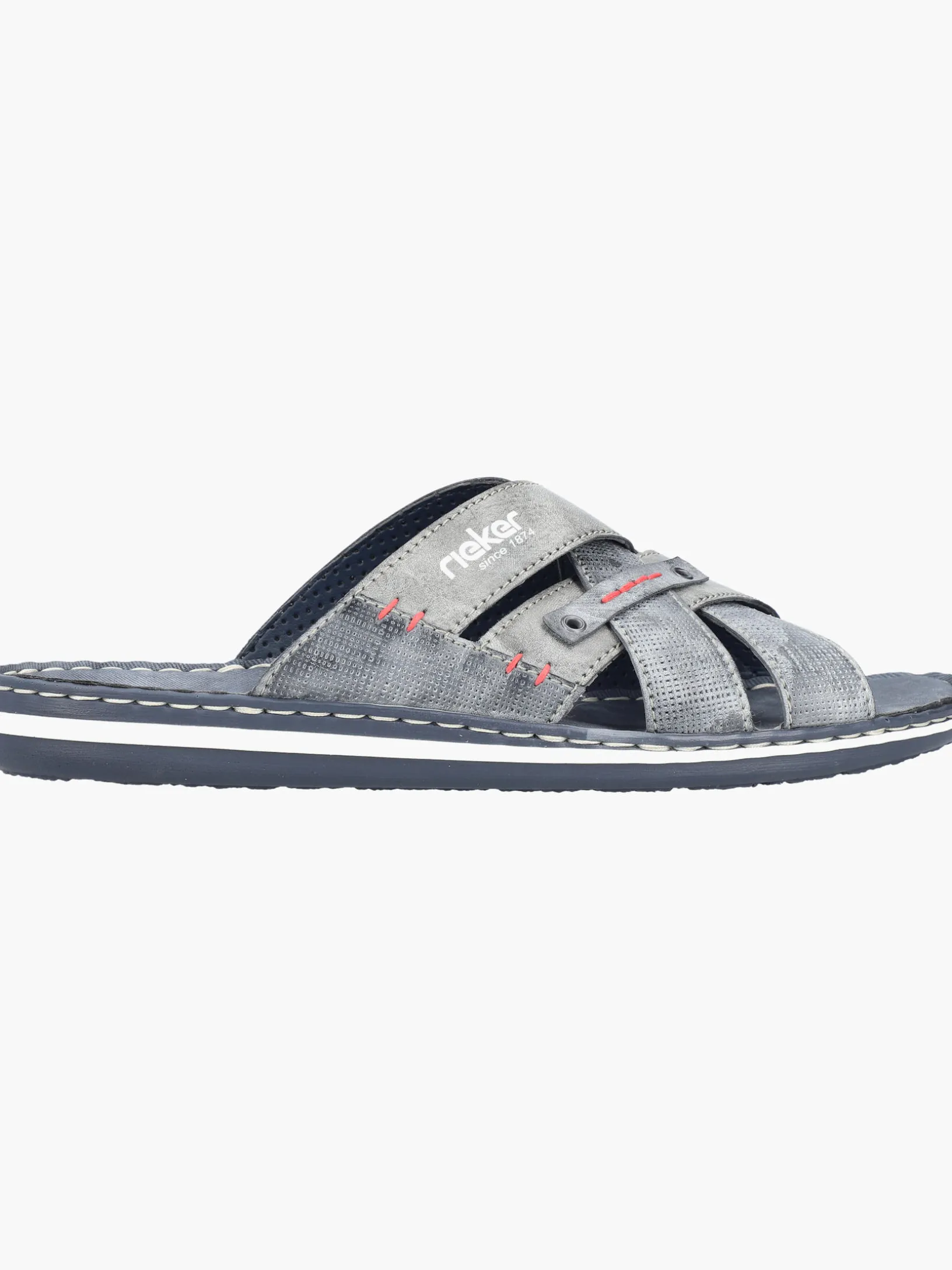 Happy feet, happy life! Diese Rieker Pantoletten für Herren in Blaugrau lassen deine Füße so richtig den Sommer spüren. Der Schuh kann ohne Verschluss ganz einfach durch Hineinschlüpfen angezogen werden. Die roten Ziernähte setzen das Design modisch in Szene. Der offene Schuh und die schockabsorbierende und leichte Sohle sorgen für anhaltendes Wohlgefühl. Das Modell ist in Komfortweite G geschnitten. Der Schuh ist mit besonders atmungsaktivem Futter ausgestattet, das zusätzlich feuchtigkeitsabsorbierend ist. Wohlge(h)fühl inklusive!