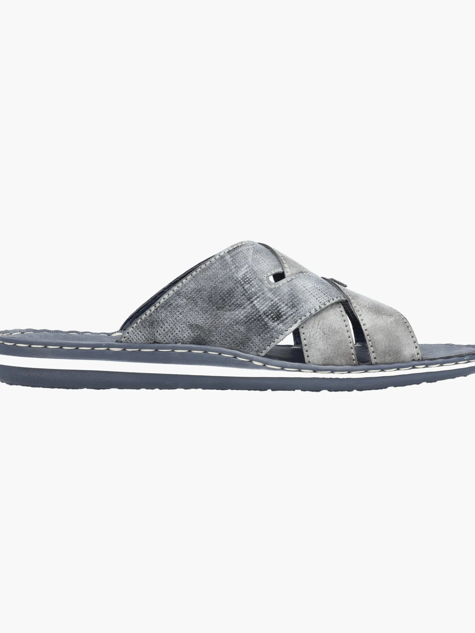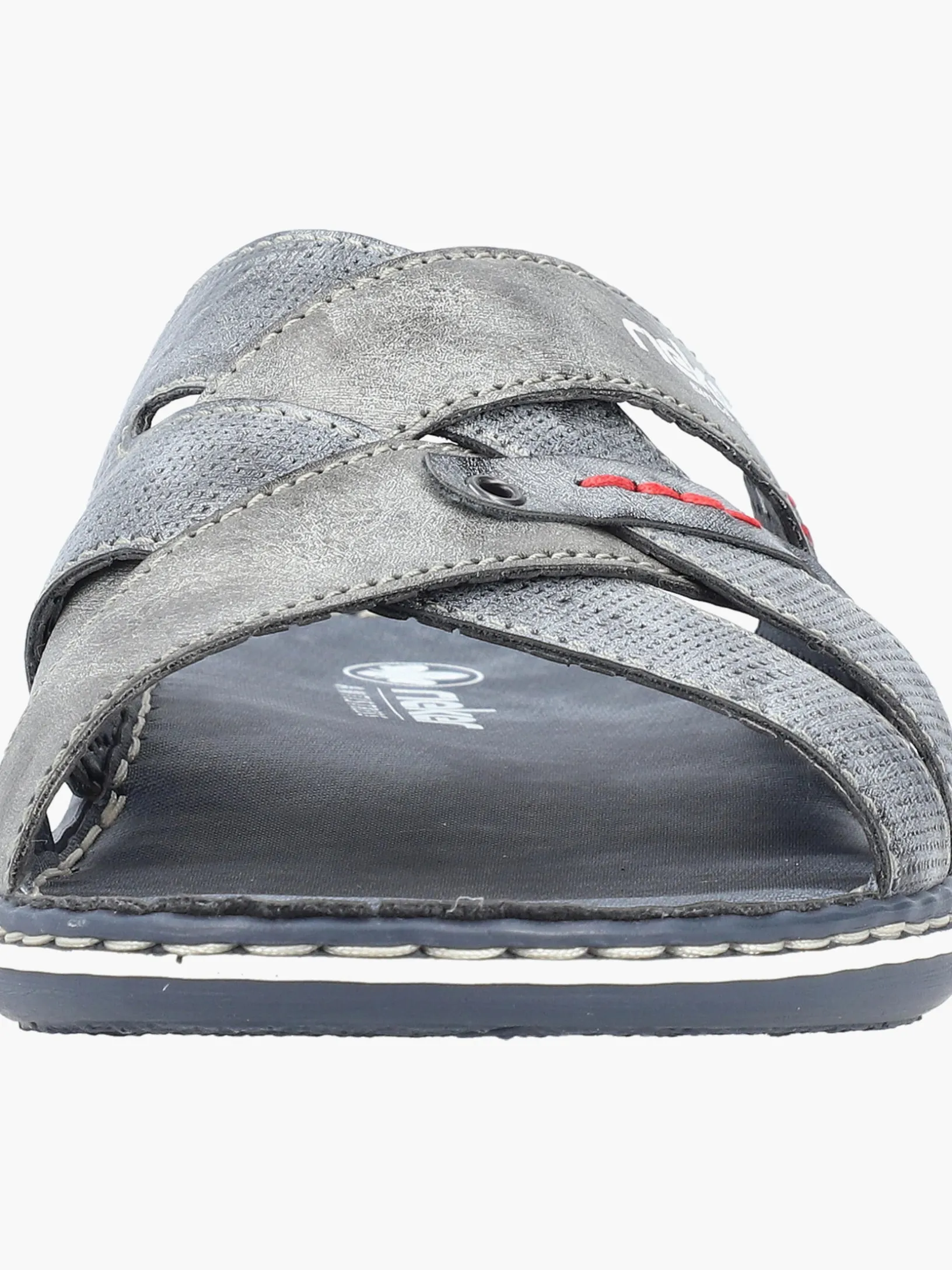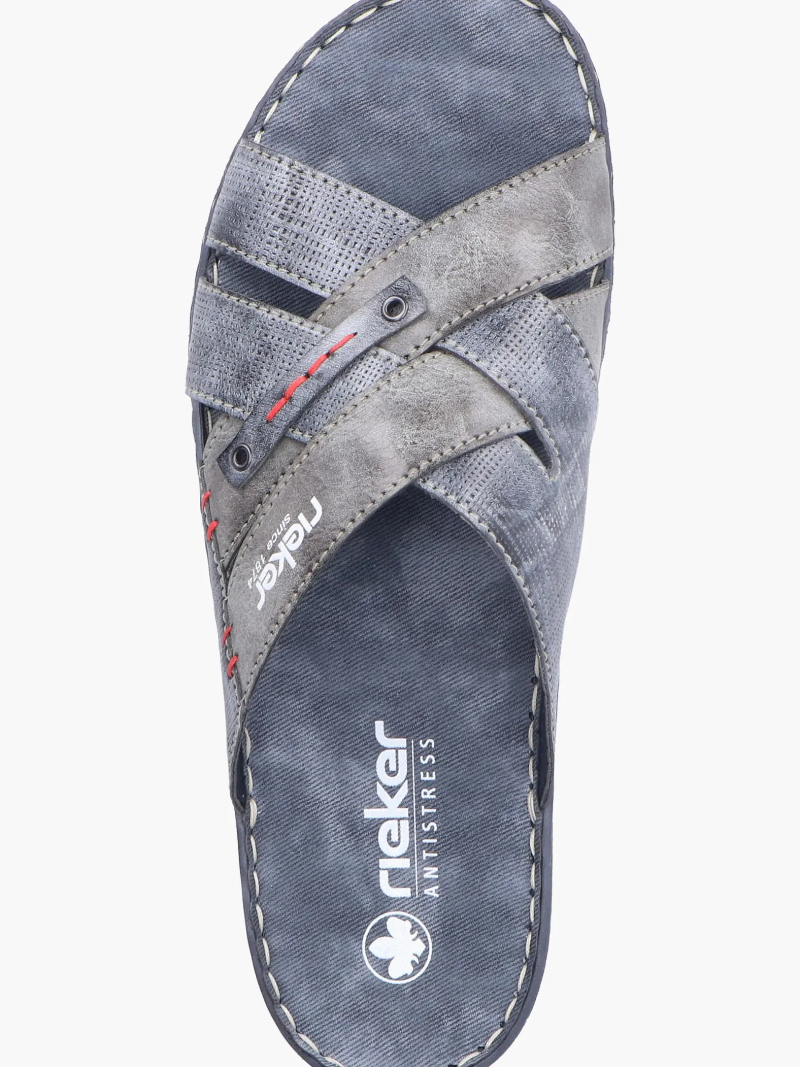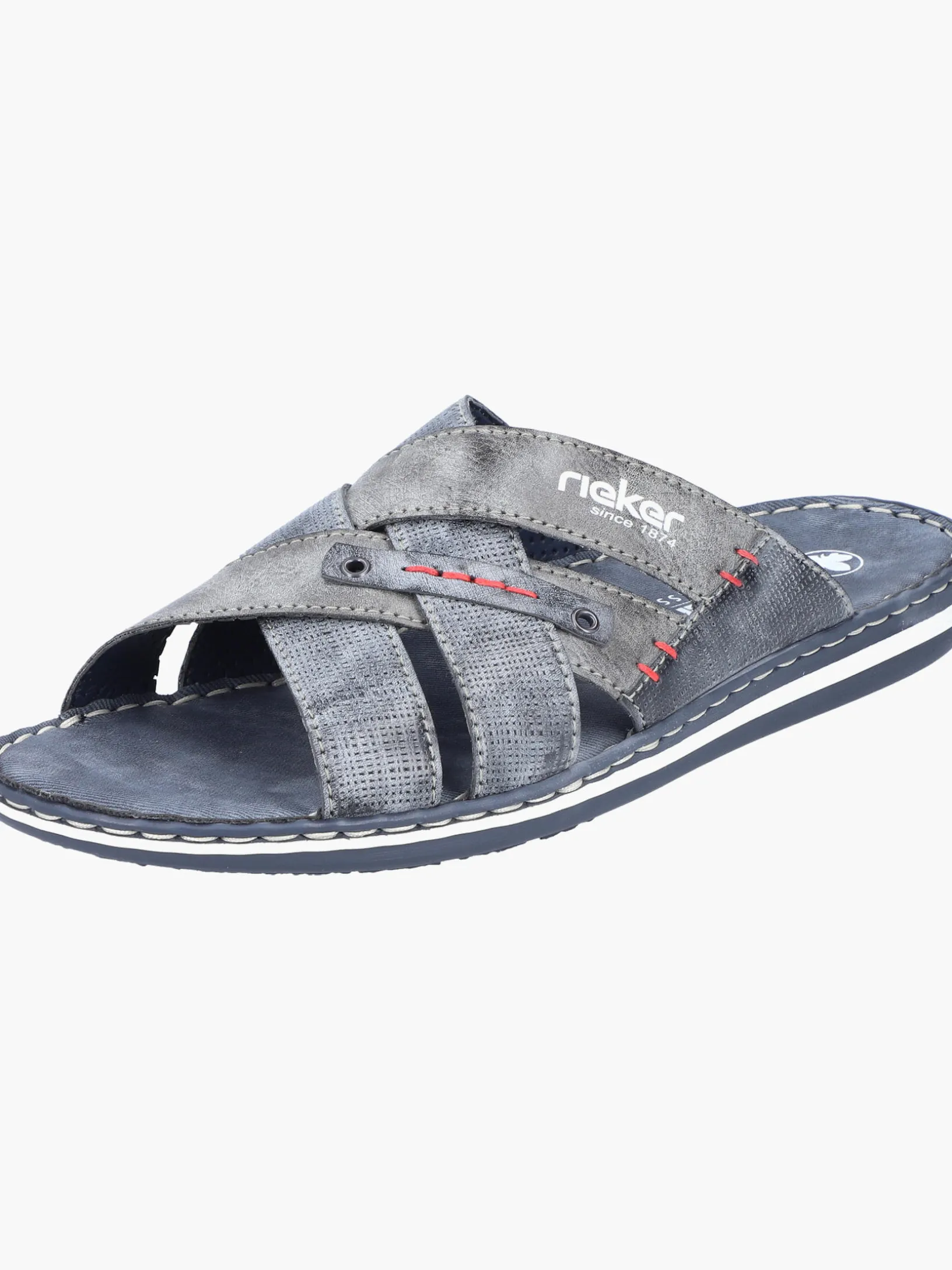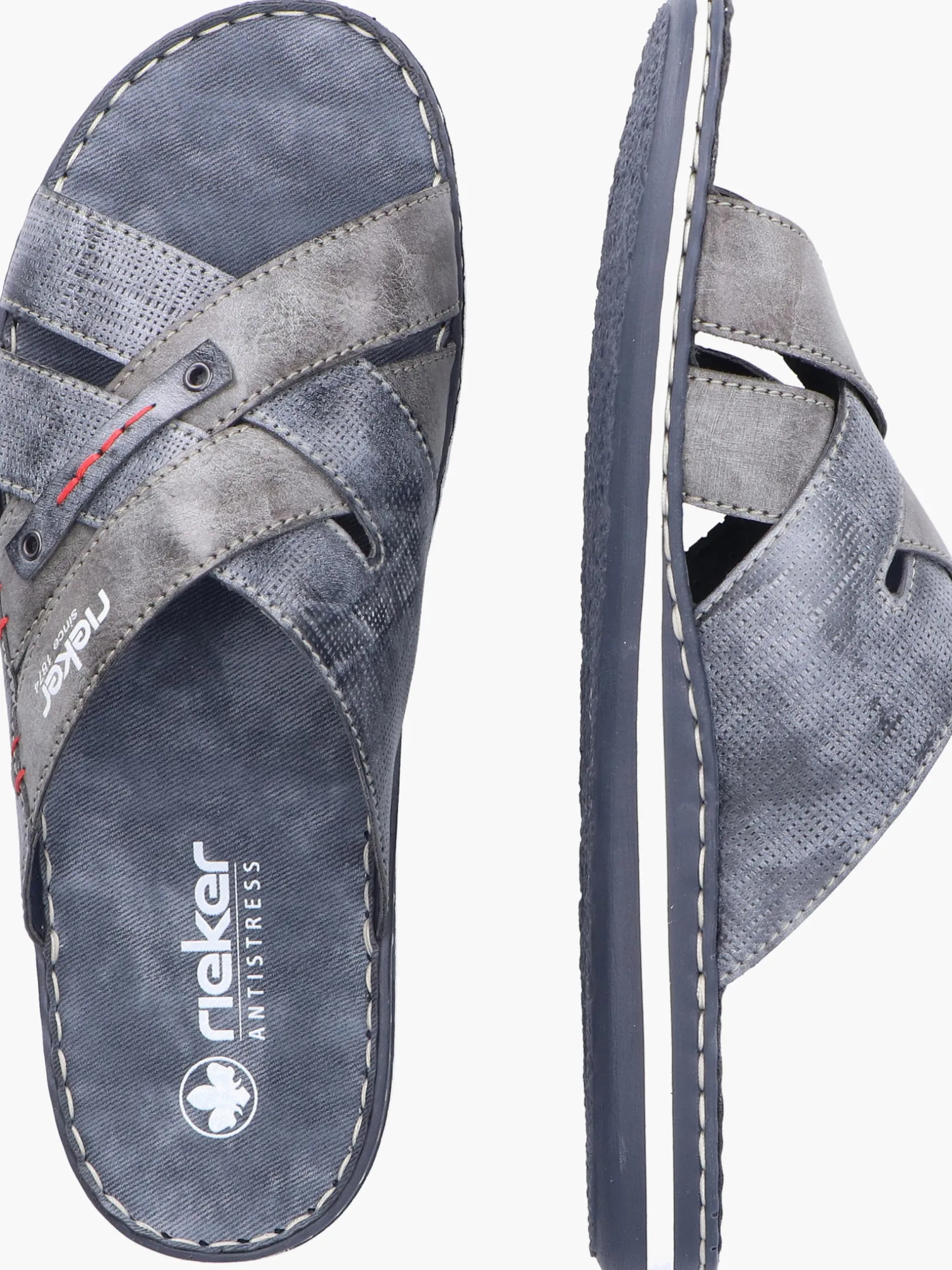 Happy feet, happy life! Diese Rieker Pantoletten für Herren in Blaugrau lassen deine Füße so richtig den Sommer spüren. Der Schuh kann ohne Verschluss ganz einfach durch Hineinschlüpfen angezogen werden. Die roten Ziernähte setzen das Design modisch in Szene. Der offene Schuh und die schockabsorbierende und leichte Sohle sorgen für anhaltendes Wohlgefühl. Das Modell ist in Komfortweite G geschnitten. Der Schuh ist mit besonders atmungsaktivem Futter ausgestattet, das zusätzlich feuchtigkeitsabsorbierend ist. Wohlge(h)fühl inklusive!