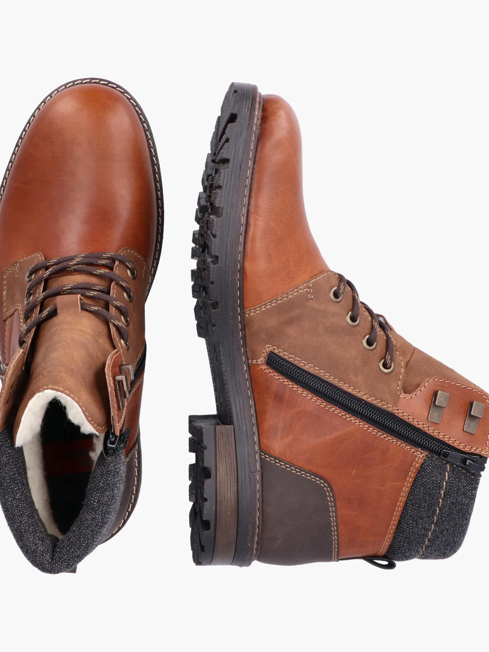 Fashion-Lovers aufgepasst: Die Rieker Must-Haves sind da! Mit diesen karamellbraunen Schnürstiefeln aus Glattleder wird jeder Wintertag zum spaßigen Abenteuer. Die clevere Kombination aus Schnürung und Reißverschluss ermöglicht ein einfaches An- und Ausziehen. Die bronzefarbenen Ösen und Nieten setzen lässige Akzente. Durch die robuste Profilsohle ist jeder Schritt eine sichere Angelegenheit und die Decksohle ist extra weich. Das Modell ist in Komfortweite G 1/2 geschnitten. Das kuschelige und sehr warme Schurwoll-Futter und die RiekerTEX-Technologie halten die Füße warm und trocken. 100% Lieblingsschuh-Potential!