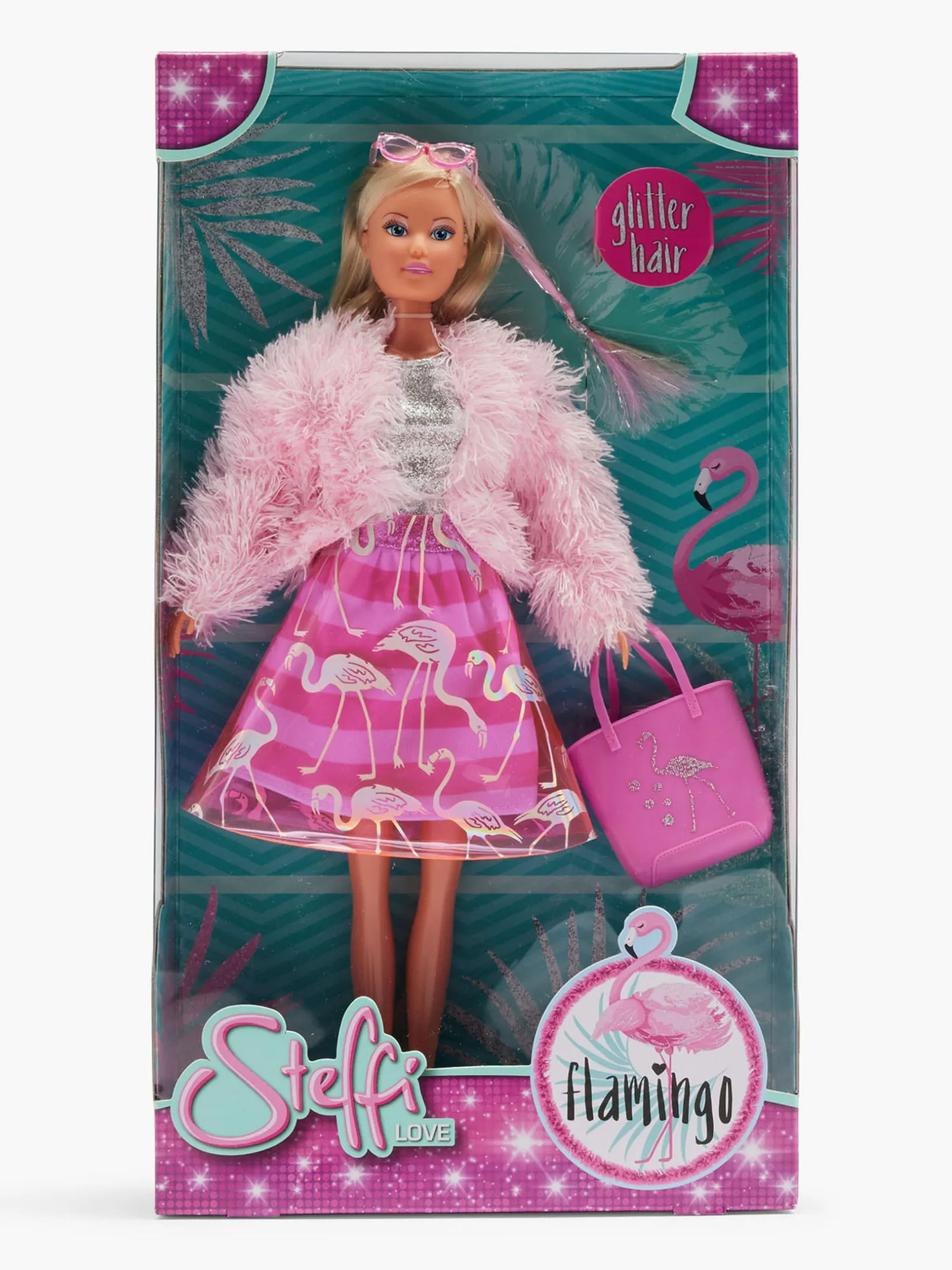 - Puppe mit Kleid, Flamingorock. Felljacke und Glitzersträhne